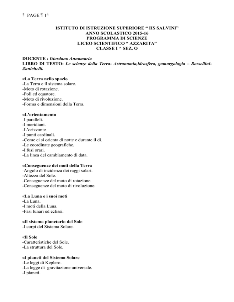 PAGE 1 ISTITUTO DI ISTRUZIONE SUPERIORE “ IIS SALVINI” ANNO SCOLASTICO 2015-16 PROGRAMMA DI SCIENZE LICEO SCIENTIFICO “ AZZARITA” CLASSE I ^ SEZ. O DOCENTE : Giordano Annamaria LIBRO DI TESTO: Le scienze della Terra- Astronomia,idrosfera, gomorgologia – BorselliniZanichelli. •La Terra nello spazio -La Terra e il sistema solare. -Moto di rotazione. -Poli ed equatore. -Moto di rivoluzione. -Forma e dimensioni della Terra. •L’orientamento -I paralleli. -I meridiani. -L’orizzonte. -I punti cardinali. -Come ci si orienta di notte e durante il dì. -Le coordinate geografiche. -I fusi orari. -La linea del cambiamento di data. •Conseguenze dei moti della Terra -Angolo di incidenza dei raggi solari. -Altezza del Sole. -Conseguenze del moto di rotazione. -Conseguenze del moto di rivoluzione. •La Luna e i suoi moti -La Luna. -I moti della Luna. -Fasi lunari ed eclissi. •Il sistema planetario del Sole -I corpi del Sistema Solare. •Il Sole -Caratteristiche del Sole. -La struttura del Sole. •I pianeti del Sistema Solare -Le leggi di Keplero. -La legge di gravitazione universale. -I pianeti. PAGE 2 •La volta celeste -Il cielo e le costellazioni. -La distanza tra le stelle: l’Anno-luce. •Origine e proprietà fisico - chimiche delle acque marine -L’idrosfera marina. -Il ciclo dell’acqua. -Salinità delle acque marine. -Gas disciolti nelle acque marine. -Temperatura delle acque marine. -Luminosità delle acque marine. •I moti del mare -Varietà dei moti marini. -Le onde. -Le maree. -Le correnti marine superficiali. •L’acqua che scorre in superficie -I serbatoi dell’acqua dolce. -Il bilancio ideologico. -I corsi d’acqua. -Il movimento delle acque correnti. •Specchi d’acqua -I laghi. -Evoluzione dei laghi. -Classificazione dei laghi. •L’acqua solida -I ghiacciai e il limite delle nevi perenni. -Ghiacciai continentali e ghiacciai montani. -Morfologia di un ghiacciaio. •Lo studio delle forme del paesaggio. -Gli elementi del paesaggio. -La geomorfologia . -Le cause delle forme del rilievo. -Le frane. •Roma, lì Gli alunni Il Docente PAGE 1 ISTITUTO DI ISTRUZIONE SUPERIORE “ IIS SALVINI” ANNO SCOLASTICO 2015-16 PROGRAMMA DI SCIENZE LICEO SCIENTIFICO “ AZZARITA” CLASSE I ^ SEZ. C DOCENTE : Giordano Annamaria LIBRO DI TESTO: Le scienze della Terra- Astronomia,idrosfera, gomorgologia – BorselliniZanichelli. •La Terra nello spazio -La Terra e il sistema solare. -Moto di rotazione. -Poli ed equatore. -Moto di rivoluzione. -Forma e dimensioni della Terra. •L’orientamento -I paralleli. -I meridiani. -L’orizzonte. -I punti cardinali. -Come ci si orienta di notte e durante il dì. -Le coordinate geografiche. -I fusi orari. -La linea del cambiamento di data. •Conseguenze dei moti della Terra -Angolo di incidenza dei raggi solari. -Altezza del Sole. -Conseguenze del moto di rotazione. -Conseguenze del moto di rivoluzione. •La Luna e i suoi moti -La Luna. -I moti della Luna. -Fasi lunari ed eclissi. •Il sistema planetario del Sole -I corpi del Sistema Solare. •Il Sole -Caratteristiche del Sole. -La struttura del Sole. •I pianeti del Sistema Solare -Le leggi di Keplero. -La legge di gravitazione universale. -I pianeti. PAGE 2 •La volta celeste -Il cielo e le costellazioni. -La distanza tra le stelle: l’Anno-luce. •Origine e proprietà fisico - chimiche delle acque marine -L’idrosfera marina. -Il ciclo dell’acqua. -Salinità delle acque marine. -Gas disciolti nelle acque marine. -Temperatura delle acque marine. -Luminosità delle acque marine. •I moti del mare -Varietà dei moti marini. -Le onde. -Le maree. -Le correnti marine superficiali. •L’acqua che scorre in superficie -I serbatoi dell’acqua dolce. -Il bilancio ideologico. -I corsi d’acqua. -Il movimento delle acque correnti. •Specchi d’acqua -I laghi. -Evoluzione dei laghi. -Classificazione dei laghi. •L’acqua solida -I ghiacciai e il limite delle nevi perenni. -Ghiacciai continentali e ghiacciai montani. -Morfologia di un ghiacciaio. •Lo studio delle forme del paesaggio. -Gli elementi del paesaggio. -La geomorfologia. -Le cause delle forme del rilievo. -Le frane. •Roma, lì Gli alunni Il Docente