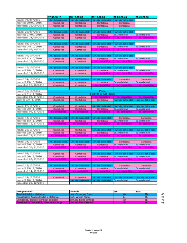 17.30-18.15 18.15-19.00 19.15-20.00 20.00-20.45 lunedì 19/09/2016 martedì 20/09/2016 mercoledì 21/09/2016 An. dei dati e stat. Contabilità Contabilità An. dei dati e stat. Contabilità Contabilità An. dei dati e stat. Contabilità Contabilità An. dei dati e stat. Contabilità Contabilità lunedì 26/09/2016 martedì 27/09/2016 mercoledì 28/09/2016 An. dei dati e stat. Contabilità Contabilità An. dei dati e stat. Contabilità Contabilità An. dei dati e stat. Contabilità An. dei dati e stat. Es. analisi dati lunedì 03/10/2016 martedì 04/10/2016 mercoledì 05/10/2016 An. dei dati e stat. Contabilità Contabilità An. dei dati e stat. Contabilità Contabilità An. dei dati e stat. Contabilità lunedì 10/10/2016 martedì 11/10/2016 mercoledì 12/10/2016 An. dei dati e stat. Contabilità Contabilità An. dei dati e stat. Contabilità Contabilità An. dei dati e stat. Contabilità lunedì 17/10/2016 martedì 18/10/2016 mercoledì 19/10/2016 An. dei dati e stat. Contabilità Contabilità An. dei dati e stat. Contabilità Contabilità An. dei dati e stat. Contabilità lunedì 24/10/2016 martedì 25/10/2016 mercoledì 26/10/2016 An. dei dati e stat. Contabilità Contabilità An. dei dati e stat. Contabilità Contabilità An. dei dati e stat. Contabilità lunedì 31/10/2016 martedì 01/11/2016 mercoledì 02/11/2016 giovedì 03/11/2016 es. contabilità es. contabilità es. contabilità es. contabilità es. contabilità Contabilità Contabilità Contabilità Contabilità Contabilità Contabilità An. dei dati e stat. Contabilità es. contabilità es. contabilità es. contabilità lunedì 14/11/2016 martedì 15/11/2016 mercoledì 16/11/2016 An. dei dati e stat. Contabilità An. dei dati e stat. Contabilità An. dei dati e stat. Contabilità es. contabilità es. contabilità es. contabilità lunedì 21/11/2016 martedì 22/11/2016 mercoledì 23/11/2016 Contabilità Contabilità Contabilità Contabilità An. dei dati e stat. Contabilità es. contabilità es. contabilità es. contabilità lunedì 28/11/2016 martedì 29/11/2016 mercoledì 30/11/2016 An. dei dati e stat. Contabilità An. dei dati e stat. Contabilità An. dei dati e stat. Contabilità es. contabilità es. contabilità es. contabilità lunedì 05/12/2016 martedì 06/12/2016 mercoledì 07/12/2016 Contabilità Contabilità Contabilità Contabilità An. dei dati e stat. Contabilità es. contabilità es. contabilità es. contabilità lunedì 12/12/2016 martedì 13/12/2016 mercoledì 14/12/2016 An. dei dati e stat. Contabilità An. dei dati e stat. Contabilità An. dei dati e stat. Contabilità es. contabilità es. contabilità es. contabilità lunedì 19/12/2016 martedì 20/12/2016 mercoledì 21/12/2016 Contabilità Contabilità An. dei dati e stat. An. dei dati e stat. An. dei dati e stat. insegnamento Analisi dei dati e statistica Esercitazioni Analisi dei dati e statistica Contabilità, bilancio e principi contabili Esercitazioni Contabilità, bilancio e principi An. dei dati e stat. Es. analisi dati es. contabilità An. dei dati e stat. Es. analisi dati es. contabilità An. dei dati e stat. Es. analisi dati es. contabilità Contabilità Es. analisi dati es. contabilità Ponte Festività di Tutti i Santi es. contabilità es. contabilità Contabilità Contabilità lunedì 07/11/2016 martedì 08/11/2016 mercoledì 09/11/2016 es. contabilità Contabilità docente prof. Giuseppe Espa dott. Valerio Pisoni dott.ssa Elena Bettega dott.ssa Lisa Valentini Orario 2° anno PT 1° term 20.45-21.30 Es. analisi dati es. contabilità Es. analisi dati es. contabilità Es. analisi dati es. contabilità Es. analisi dati es. contabilità Contabilità Es. analisi dati es. contabilità es. contabilità An. dei dati e stat. An. dei dati e stat. An. dei dati e stat. Es. analisi dati An. dei dati e stat. Es. analisi dati es. contabilità Contabilità Es. analisi dati es. contabilità An. dei dati e stat. Es. analisi dati es. contabilità Contabilità Es. analisi dati es. contabilità An. dei dati e stat. Es. analisi dati es. contabilità Contabilità Es. analisi dati es. contabilità es. contabilità Contabilità Es. analisi dati es. contabilità An. dei dati e stat. Es. analisi dati es. contabilità Contabilità Es. analisi dati es. contabilità An. dei dati e stat. Es. analisi dati es. contabilità Contabilità Es. analisi dati es. contabilità An. dei dati e stat. Es. analisi dati An. dei dati e stat. Es. analisi dati ore aula 48 24 72 48 2B 2B 2B 2B 48 24 72 48