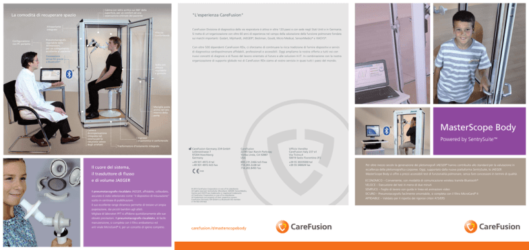 La comodità di recuperare spazio Cabina con vetro acrilico sui 360° della superficie, per un comfort ed una osservazione ottimale del paziente "L’esperienza CareFusion" Altoparlante integrato CareFusion Divisione di diagnostica delle vie respiratorie è attiva in oltre 120 paesi e con sede negli Stati Uniti e in Germania. Altezza Confortevole Configurazione con PC portatile Si tratta di un'organizzazione con oltre 60 anni di esperienza nel campo della valutazione della funzione polmonare fondata sui marchi importanti: Godart, Mijnhardt, JAEGER®, Beckman, Gould, Micro Medical, SensorMedics® e VIASYS®. Pneumotacografo regolabile nelle 3Dimensioni, per un collegamento eccellente al paziente Con oltre 500 dipendenti CareFusion RDx, ci sforziamo di continuare la ricca tradizione di fornire dispositivi e servizi di diagnostica cardiopolmonare affidabili, professionali e accessibili. Oggi ampliamo la nostra offerta a tutti voi con nuovi concetti di diagnosi e di flusso del lavoro orientato al futuro e alle soluzioni H-IT. In combinazione con la nostra Connessione senza nza fili grazie e a Bluetooth® organizzazione di supporto globale noi di CareFusion RDx siamo al vostro servizio in quasi tutti i paesi del mondo. Sedia con altezza regolabile e girevole Maniglia posta anche nel lato interno della porta Camera dicompensazione integrata nel sistema per la riduzione veloce degli artefatti MasterScope Body Ingresso ergonomico e confortevole Powered by SentrySuite™ Trasformatore d’isolamento integrato Il cuore del sistema, CareFusion Germany 234 GmbH Leibnizstrasse 7 97204 Hoechberg Germany CareFusion 22745 Savi Ranch Parkway Yorba Linda, CA 92887 USA Ufficio Vendite CareFusion Italy 237 srl Via Ticino,4 50019 Sesto Fiorentino (FI) +49 931 4972-0 tel +49 931 4972-423 fax 800.231.2466 toll-free 714.283.2228 tel 714.283.8493 fax +39 55 30339300 tel +39 55 340024 fax il trasduttore di flusso e di volume JAEGER Il pneumotacografo riscaldato JAEGER, affidabile, collaudato, accurato è stato selezionato come “il dispositivo di misurazione” scelto in centinaia di pubblicazioni. © 2013 CareFusion Corporation or one of its subsidiaries. All rights reserved. SentrySuite, MicroGard, JAEGER, SensorMedics, Vyntus and VIASYS are trademarks or registered trademarks of CareFusion Corporation or one of its subsidiaries. All trademarks are property of their respective owners. CareFusion Germany 234 GmbH is a Bluetooth SIG member. V-791783 CF01563 Il suo eccellente range dinamico permette di testare un'ampia popolazione, dai piccoli bambini agli atleti. Migliaia di laboratori PFT si affidano quotidianamente alle sue elevate prestazioni. Il pneumotacografo riscaldato, di facile manutenzione, si completa con il filtro antibatterico ed anti virale MicroGard® II, per un concetto di igiene completo. carefusion.it/masterscopebody Per oltre mezzo secolo la generazione dei pletismografi JAEGER® hanno contribuito allo standard per la valutazione in eccellenza della pletismografica corporea. Oggi, supportato dalla nuova piattaforma SentrySuite, lo JAEGER MasterScope Body vi offre a prezzi accessibili test di funzionalità polmonare, senza fare concessioni in termini di qualità. ECONOMICO – Conveniente, con modalità di comunicazione wireless tramite Bluetooth® VELOCE – Esecuzione del test in meno di due minuti SEMPLICE – Foglio di lavoro con guida in linea ed animazioni video SICURO – Pneumotacografo facilmente smontabile, si completa con il filtro MicroGard® II AFFIDABILE – Validato per il rispetto dei rigorosi criteri ATS/ERS Brochure_MasterScope Body SeS_IT_Innen.ai 1 21.02.2013 15:08:15 MasterScope Body: Con SentrySuite™ MasterScope Body Unico nel suo genere Guida in linea ed istruzioni complete e • • Dimensioni della cabina ottimali, • Finestre di incentivazione grafica confortevole per il paziente durante la misurazione per Opzione: Carrello compatto con piano paziente nel raggiungere le sue I vostri benefici di una comunicazione wireless via Bluetooth®: assistere sia l'operatore e sia il • massime prestazioni. di lavoro regolabile in altezza • Sostituisce scomodi cavi tra PC e cabina Risparmio energetico rispetto ai sistemi di misura convenzionali • Consente un risparmio di spazio, perchè utilizzabile con notebook • - Verifica la presenza della stabilità - Verifica la riproducibilità delle misure. - E’ possibile scegliere tra 10 animazioni - Verifica la riproducibilità dell’ FRCpleth La tecnologia Bluetooth è la tecnologia wireless ideale ed i criteri "Fine test" della FVC. perché è semplice e sicura ovunque. differenti per spirometria forzata. Test avanzati di funzionalità polmonare Controllo qualità • C Tutti i programmi di misurazione sono controllati dalla nuova piattaforma SentrySuite. Ottimizzati per la facilità d'uso, M la flessibilità ed il controllo di qualità, la MasterScope body offre le funzionalità dei seguenti test: Y • Spirometria: Capacità Vitale Lenta, Capacità Vitale Forzata e Massima Ventilazione Volontaria (MVV). CM • Volumi Polmonari statici assoluti: utilizzando la metodica più precisa, ovvero la pletismografica corporea CY • Controllo qualità standard sulla base dei criteri ATS / ERS o di altri autori, durante e dopo le misurazioni, con il grafico di ripetibilità e codice colore per JAEGER® ottimizzare i risultati dei pazienti. (Volume Toracico Gassoso) per FRCpleth, ERV, RV, TLC, VC, IC. MY Resistenza delle vie aeree: sforzo minimo per il paziente attraverso metodica a respirazione naturale o veloce, Vmax® con visualizzazione in tempo reale delle curve, e dei parametri sReff, sRtot, sR0.5 con determinazione di CMY Reff, Rtot, R0.5, ecc. K - Con un solo clic sovrappone tutti i processi MIP/MEP: Pressioni massime inspiratorie ed espiratorie per la misurazione della forza dei muscoli respiratori. • P0.1 per misurare facilmente il drive respiratorio a volume corrente. Vyntus® delle curve di resistenza ed FRCpleth per Al