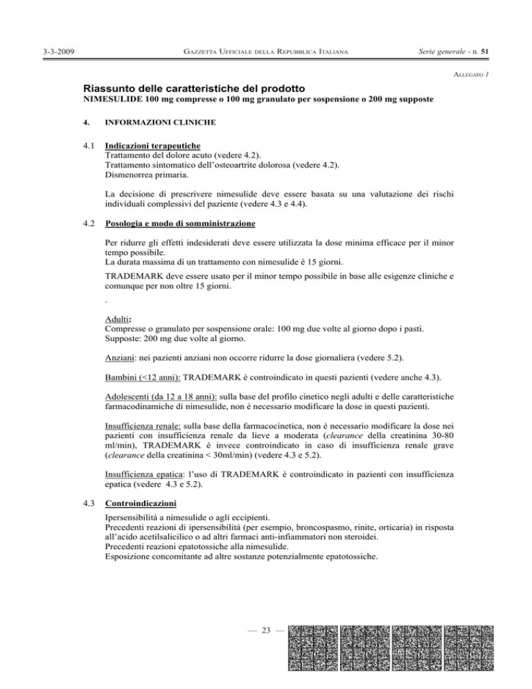 3-3-2009 GAZZETTA UFFICIALE DELLA REPUBBLICA ITALIANA Serie generale - n. 51 ALLEGATO 1 Riassunto delle caratteristiche del prodotto NIMESULIDE 100 mg compresse o 100 mg granulato per sospensione o 200 mg supposte 4. INFORMAZIONI CLINICHE 4.1 Indicazioni terapeutiche Trattamento del dolore acuto (vedere 4.2). Trattamento sintomatico dell’osteoartrite dolorosa (vedere 4.2). Dismenorrea primaria. La decisione di prescrivere nimesulide deve essere basata su una valutazione dei rischi individuali complessivi del paziente (vedere 4.3 e 4.4). 4.2 Posologia e modo di somministrazione Per ridurre gli effetti indesiderati deve essere utilizzata la dose minima efficace per il minor tempo possibile. La durata massima di un trattamento con nimesulide è 15 giorni. TRADEMARK deve essere usato per il minor tempo possibile in base alle esigenze cliniche e comunque per non oltre 15 giorni. . Adulti: Compresse o granulato per sospensione orale: 100 mg due volte al giorno dopo i pasti. Supposte: 200 mg due volte al giorno. Anziani: nei pazienti anziani non occorre ridurre la dose giornaliera (vedere 5.2). Bambini (<12 anni): TRADEMARK è controindicato in questi pazienti (vedere anche 4.3). Adolescenti (da 12 a 18 anni): sulla base del profilo cinetico negli adulti e delle caratteristiche farmacodinamiche di nimesulide, non è necessario modificare la dose in questi pazienti. Insufficienza renale: sulla base della farmacocinetica, non è necessario modificare la dose nei pazienti con insufficienza renale da lieve a moderata (clearance della creatinina 30-80 ml/min), TRADEMARK è invece controindicato in caso di insufficienza renale grave (clearance della creatinina < 30ml/min) (vedere 4.3 e 5.2). Insufficienza epatica: l’uso di TRADEMARK è controindicato in pazienti con insufficienza epatica (vedere 4.3 e 5.2). 4.3 Controindicazioni Ipersensibilità a nimesulide o agli eccipienti. Precedenti reazioni di ipersensibilità (per esempio, broncospasmo, rinite, orticaria) in risposta all’acido acetilsalicilico o ad altri farmaci anti-infiammatori non steroidei. Precedenti reazioni epatotossiche alla nimesulide. Esposizione concomitante ad altre sostanze potenzialmente epatotossiche. — 23 — 3-3-2009 GAZZETTA UFFICIALE DELLA REPUBBLICA ITALIANA Serie generale - n. 51 Alcolismo, dipendenza da droghe. Storia di emorragia gastrointestinale o perforazione relativa a precedenti trattamenti attivi o storia di emorragia/ulcera peptica ricorrente (due o più episodi distinti di dimostrata ulcerazione o sanguinamento). Emorragie cerebrovascolari, altre emorragie o patologie emorragiche in corso Disturbi gravi della coagulazione. Scompenso cardiaco grave. Insufficienza renale grave. Insufficienza epatica. Pazienti con febbre e/o sintomi influenzali. Bambini al di sotto dei 12 anni. Terzo trimestre di gravidanza e allattamento (vedere 4.6 e 5.3). 4.4 Speciali avvertenze e precauzioni per l'uso Gli effetti indesiderati possono essere minizzati usando la dose minima efficace per il minor tempo possible che occorre per controllare i sintomi (vedere 4.2) e comunque per non oltre 15 giorni Sospendere il trattamento se non si osservano benefici. In rari casi è stata riportata un’associazione tra TRADEMARK e reazioni epatiche gravi, inclusi alcuni rarissimi casi di decesso (vedere anche 4.8). I pazienti che accusano sintomi compatibili con lesioni epatiche durante il trattamento con TRADEMARK (per esempio, anoressia, nausea, vomito, dolori addominali, spossatezza, urine scure) o i pazienti che presentano nel corso del trattamento test anormali di funzionalità epatica devono sospendere il trattamento. Questi pazienti non devono più utilizzare nimesulide. Lesioni epatiche, reversibili nella maggior parte dei casi, sono state riportate dopo esposizione breve al farmaco. L’uso di TRADEMARK deve essere evitato in concomitanza di FANS inclusi gli inibitori selettivi della COX-2. Inoltre durante la terapia con TRADEMARK, occorre avvertire i pazienti di non assumere altri analgesici. L’uso contemporaneo di diversi FANS non è raccomandato Pazienti che assumono nimesulide e sviluppano febbre e/o sintomi influenzali devono interrompere il trattamento. Emorragia gastrointestinale, ulcerazione e perforazione: durante il trattamento con tutti i FANS, in qualsiasi momento, con o senza sintomi di preavviso o precedente storia di gravi eventi gastrointestinali, sono state riportate emorragia gastrointestinale, ulcerazione e perforazione che possono essere fatali. Negli anziani e in pazienti con storia di ulcera, soprattutto se complicata da emorragia o perforazione (vedere 4.3), il rischio di emorragia gastrointestinale, ulcerazione o perforazione è più alto con dosi aumentate di FANS. Questi pazienti devono iniziare il trattamento con la più bassa dose disponibile. L’uso concomitante di agenti protettori (misoprostolo o inibitori di pompa protonica) deve essere considerato per questi pazienti e anche per i pazienti che assumono basse dosi di aspirina o altri farmaci che possono aumentare il rischio di eventi gastrointestinali (vedere sotto e 4.5). — 24 — 3-3-2009 GAZZETTA UFFICIALE DELLA REPUBBLICA ITALIANA Serie generale - n. 51 Anziani: i pazienti anziani hanno un aumento della frequenza di reazioni avverse ai FANS, specialmente emorragie e perforazioni gastrointestinali, che possono essere fatali (vedere 4.2). Pazienti con storia di tossicità gastrointestinale, in particolare anziani, devono riferire qualsiasi sintomo gastrointestinale inusuale (soprattutto emorragia gastrointestinale) in particolare nelle fasi iniziali del trattamento. Cautela deve essere prestata ai pazienti che assumono farmaci concomitanti che potrebbero aumentare il rischio di ulcerazione o emorragia, come corticosteroidi orali, anticoagulanti come Warfarin, inibitori selettivi del reuptake della serotonina o agenti antiaggreganti come l’aspirina (vedere 4.5). Quando si verifica emorragia o ulcerazione gastrointestinale in pazienti che ass