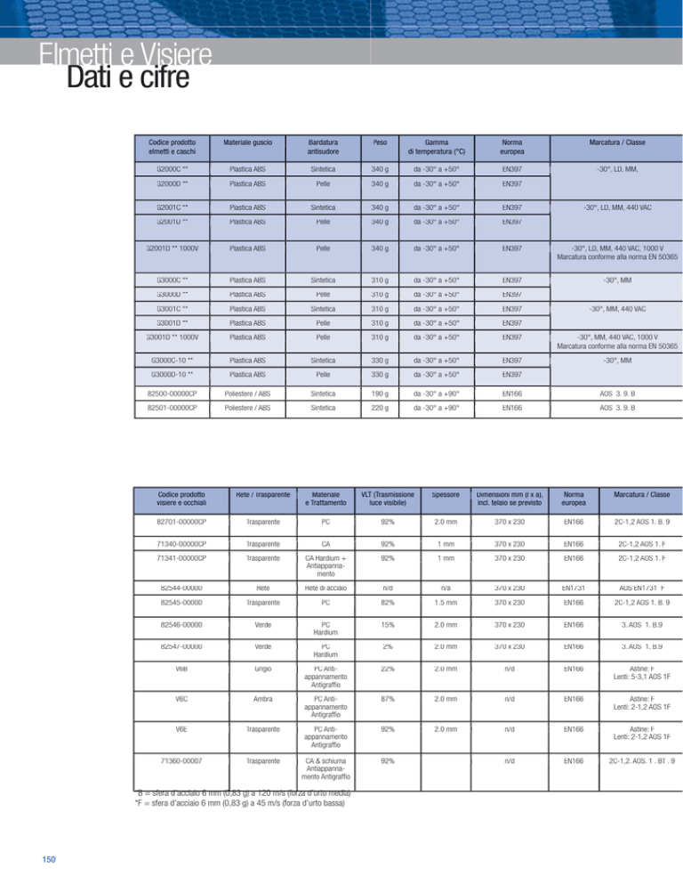 Elmetti metti e Vis Visie Visiere s Dati e cifre Codice prodotto elmetti e caschi Materiale guscio Bardatura antisudore Peso Gamma di temperatura (°C) Norma europea Marcatura / Classe G2000C ** Plastica ABS Sintetica 340 g da -30° a +50° EN397 -30°, LD, MM, G2000D ** Plastica ABS Pelle 340 g da -30° a +50° EN397 G2001C ** Plastica ABS Sintetica 340 g da -30° a +50° EN397 G2001D ** Plastica ABS Pelle 340 g da -30° a +50° EN397 G2001D ** 1000V Plastica ABS Pelle 340 g da -30° a +50° EN397 -30°, LD, MM, 440 VAC, 1000 V Marcatura conforme alla norma EN 50365 -30°, MM G3000C ** Plastica ABS Sintetica 310 g da -30° a +50° EN397 G3000D ** Plastica ABS Pelle 310 g da -30° a +50° EN397 G3001C ** Plastica ABS Sintetica 310 g da -30° a +50° EN397 G3001D ** Plastica ABS Pelle 310 g da -30° a +50° EN397 G3001D ** 1000V Plastica ABS Pelle 310 g da -30° a +50° EN397 -30°, MM, 440 VAC, 1000 V Marcatura conforme alla norma EN 50365 -30°, MM, 440 VAC -30°, MM G3000C-10 ** Plastica ABS Sintetica 330 g da -30° a +50° EN397 G3000D-10 ** Plastica ABS Pelle 330 g da -30° a +50° EN397 82500-00000CP Poliestere / ABS Sintetica 190 g da -30° a +90° EN166 AOS 3. 9. B 82501-00000CP Poliestere / ABS Sintetica 220 g da -30° a +90° EN166 AOS 3. 9. B Codice prodotto visiere e occhiali Rete / Trasparente Materiale e Trattamento VLT (Trasmissione luce visibile) Spessore Dimensioni mm (l x a), incl. telaio se previsto Norma europea Marcatura / Classe 82701-00000CP Trasparente PC 92% 2.0 mm 370 x 230 EN166 2C-1,2 AOS 1. B. 9 71340-00000CP Trasparente CA 92% 1 mm 370 x 230 EN166 2C-1,2 AOS 1. F 71341-00000CP Trasparente CA Hardium + Antiappannamento 92% 1 mm 370 x 230 EN166 2C-1,2 AOS 1. F 82544-00000 Rete Rete di acciaio n/d n/a 370 x 230 EN1731 AOS EN1731 F 82545-00000 Trasparente PC 82% 1.5 mm 370 x 230 EN166 2C-1,2 AOS 1. B. 9 82546-00000 Verde PC Hardium 15% 2.0 mm 370 x 230 EN166 3. AOS 1. B.9 82547-00000 Verde PC Hardium 2% 2.0 mm 370 x 230 EN166 3. AOS 1. B.9 V6B Grigio PC Antiappannamento Antigraffio 22% 2.0 mm n/d EN166 Astine: F Lenti: 5-3,1 AOS 1F V6C Ambra PC Antiappannamento Antigraffio 87% 2.0 mm n/d EN166 Astine: F Lenti: 2-1,2 AOS 1F V6E Trasparente PC Antiappannamento Antigraffio 92% 2.0 mm n/d EN166 Astine: F Lenti: 2-1,2 AOS 1F 71360-00007 Trasparente CA & schiuma Antiappannamento Antigraffio 92% n/d EN166 2C-1,2. AOS. 1 . BT . 9 *B = sfera d’acciaio 6 mm (0 (0,83 0 83 g) a 120 m/s (forza d’urto media) *F = sfera d’acciaio 6 mm (0,83 g) a 45 m/s (forza d’urto bassa) 150 -30°, LD, MM, 440 VAC Marcatura / Spiegazione Uso previsto ”-30°” Bassa temperatura, ”LD” Deformazione laterale, ”MM” Metallo fuso Industria, edilizia, applicazioni che richiedono una protezione laterale, forestale ”-30°” Bassa temperatura, ”LD” Deformazione laterale, ”MM” Metallo fuso, ”440 VAC” Isolamento elettrico Industria, lavori elettrici, applicazioni che richiedono una protezione laterale ”-30°” Bassa temperatura, ”LD” Deformazione laterale, ”MM” Metallo fuso, ”440 VAC” Isolamento elettrico, ”EN 50365” Per l’uso in installazioni a bassa tensione Industria, lavori elettrici, applicazioni che richiedono una protezione laterale ”-30°” Bassa temperatura, ”MM” Metallo fuso Forestale, industria, edilizia ”-30°” Bassa temperatura, ”MM” Metallo fuso, ”440 VAC” Isolamento elettrico Industria, lavori elettrici ”-30°” Bassa temperatura, ”MM” Metallo fuso, ”440 VAC” Isolamento elettrico, ”EN 50365” Per l’uso in installazioni a bassa tensione Industria, lavori elettrici ”-30°” Bassa temperatura, ”MM” Metallo fuso Applicazioni che richiedono buona ventilazione e attacco per lampada ”3” Protezione dai liquidi (gocce o schizzi) ”B” Requisito di protezione da particelle ad alta velocità ”9” Protezione da metalli fusi e solidi caldi Settori meccanico, chimico, metallurgico, saldatura Marcatura / Spiegazione Uso previsto ”1” Classe ottica per la rifrazione della luce (1, 2 o 3, dove 1 è il livello superiore). Settore meccanico ”1” Classe ottica per la rifrazione della luce (1, 2 o 3, dove 1 è il livello superiore). ”F” Requisito di protezione da particelle ad alta velocità* Settori meccanico e chimico ”F” Requisito di protezione da particelle ad alta velocità* Fornace ”1” Classe ottica per la rifrazione della luce (1, 2 o 3, dove 1 è il livello superiore). Settori meccanico e chimico ”3” e ”5” Codice per filtro antiriflesso senza specifica infrarossi ”3” = Filtro ultravioletti con buon riconoscimento dei colori ”5” = Filtro solare senza specifica infrarossi Saldatura Astine: ”F” Requisito di protezione da particelle ad alta velocità* Lenti: ”5” Filtro solare senza specifica infrarossi ”3,1” Codice colore (grigio scuro, bronzo scuro o specchio) Settore meccanico e lavori all’aperto Ricambi / Accessori Colori RAL PMS GLF GLF-B GH2 V6* HYG3 Supporto per lampada e cavo Portaocchiali Cinturino sottomento Occhiali integrati Bardatura antisudore di plastica (standard) HYG4 Bardatura antisudore di pelle G2E Bardatura per rivestimento in 6 punti GR3C Parapioggia GR2B Parapioggia per visiera BB Blu GP Verde GT Grigio GU Giallo OR Arancione RD Rosso VI Bianco 5015 6029 7001 1018 2004 3000 9010 2070-B 3070-G10Y 3502-B 0080-Y10R 0090-Y60R 1090-R 0502-Y GH4 Cinturino sottomento V6* Occhiali integrati HYG3 Bardatura antisudore di plastica (standard) HYG4 Bardatura antisudore di pelle G2E Bardatura per rivestimento in 6 punti GR3C Parapioggia GR2B Parapioggia per visiera Occhiali Fahrenheit BB Blu GP Verde GT Grigio GU Giallo OR Arancione RD Rosso VI Bianco GB Hi-Viz 5015 6029 7001 1018 2004 3000 9010 – 2070-B 3070-G10Y 3502-B 0080-Y10R 0090-Y60R 1090-R 0502-Y 0070-G60Y Settore meccanico Astine: ”F” Requisito di protezione da particelle ad alta velocità* Lenti: ”2” Filtro ultravioletti, buon riconoscimento dei colori. ”2C-1.2” Filtro ultra