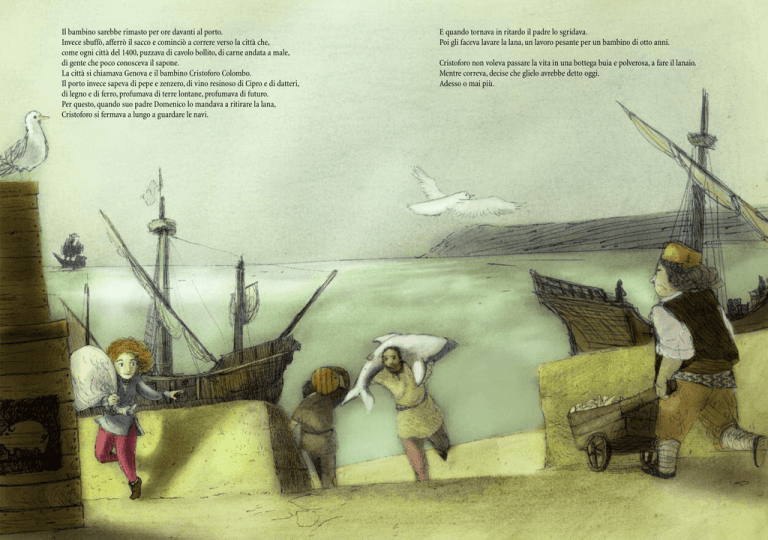 Il bambino sarebbe rimasto per ore davanti al porto. Invece sbuffò, afferrò il sacco e cominciò a correre verso la città che, come ogni città del 1400, puzzava di cavolo bollito, di carne andata a male, di gente che poco conosceva il sapone. La città si chiamava Genova e il bambino Cristoforo Colombo. Il porto invece sapeva di pepe e zenzero, di vino resinoso di Cipro e di datteri, di legno e di ferro, profumava di terre lontane, profumava di futuro. Per questo, quando suo padre Domenico lo mandava a ritirare la lana, Cristoforo si fermava a lungo a guardare le navi. E quando tornava in ritardo il padre lo sgridava. Poi gli faceva lavare la lana, un lavoro pesante per un bambino di otto anni. Cristoforo non voleva passare la vita in una bottega buia e polverosa, a fare il lanaio. Mentre correva, decise che glielo avrebbe detto oggi. Adesso o mai più. Quando Cristoforo ebbe l'età di fare il mozzo, suo padre lo presentò a un vecchio marinaio dalla faccia rugosa e bruciata dal sole. Il marinaio squadrò Cristoforo: “È magro…” mormorò. “Avete bisogno di un mozzo o no?” disse Domenico. Il marinaio non gli badò: “Perché vuoi fare il mozzo? Sei stanco di dormire in un letto caldo?”. Cristoforo non rispose, intento a guardare le navi e le vele che si perdevano all'orizzonte. Il marinaio sorrise. Ormai li riconosceva i ragazzi con quella luce negli occhi, quella voglia di scoprire, di navigare mari mai navigati. Allargò il braccio verso una delle navi o forse tutte e disse: “Salpiamo domani... se te la senti”. Cristoforo non aspettava altro... Intanto Colombo era diventato un giovane comandante. Ora toccava a lui insegnare ai mozzi a usare la bussola. “La costa è il vostro rifugio dalla tempesta e dai pericoli” diceva loro, “non dovete mai perderla di vista”. Le sue navi andavano al di là delle Colonne d’Ercole, nelle acque dell’Oceano Tenebroso, sempre però navigando vicino a terra: lungo le coste dell'Africa o tra le isole perse tra i ghiacci del nord. In Islanda, una sera, un frate gli raccontò una storia di guerrieri vichinghi: “Si dice che abbiano scoperto delle terre nell’Oceano Tenebroso. Ma sono solo leggende...” rideva il sant’uomo. “E se fosse vero?” domandò Colombo. “L’Oceano Tenebroso non ha fine...” disse il frate. “Ogni cosa che comincia prima o poi finisce, voi lo sapete” rispose Colombo. Le voci di terre là dove il sole tramonta erano ormai tante. Cristoforo le raccoglieva con la pazienza del collezionista: la corrente portava legni lavorati mai visti prima e semi di piante sconosciute. I grandi esploratori del passato, come Marco Polo, avevano raggiunto le Indie, il Cataio, il Cipango, guidando le loro carovane verso il sole che sorge. Come tutti i marinai, Cristoforo sapeva che la Terra è tonda. Perché allora non fare la strada opposta a quella di Marco Polo e raggiungere le città dai tetti d’oro passando da occidente, rincorrendo per mare il sole che tramonta? A questo pensava Cristoforo. Le acque non ancora navigate chiamano. Anche un mare senza fine ha bisogno di un esploratore. Ma per andare a vedere dove finiva l’Oceano Tenebroso ci volevano molto coraggio e tanti soldi. Colombo continuò a sognare ad occhi aperti, a comandare navi, a portare merci e uomini per tutti i mari conosciuti. Le cose non arrivano subito, si sa, e a volte il destino arriva per vie inaspettate... “Navi in vista” gridò una mattina la vedetta. “Non sembrano mercantili” disse il timoniere. Un colpo di cannone tolse i dubbi: “Pirati!” gridò il comandante e tutti corsero alle armi. Pirati aggrappati alle corde volarono sulla nave di Colombo, con i pugnali tra i denti. Poi furono solo grida, scoppi, rumori di ferro contro il ferro. La nave affondò. A Cristoforo sembrava che anche i suoi sogni fossero affondati con la nave. Aggrappato a un asse di legno sperava che il mare avesse pietà di lui. E così fu. Le onde lo fecero naufragare su una terra aspra e nuda. Cristoforo era arrivato in Portogallo, un piccolo regno di grandi e valorosi marinai. Colombo era un marinaio conosciuto e fu ricevuto dai sovrani Ferdinando e Isabella. Ma in quei giorni il sole della Spagna non scaldava tutti i cuori allo stesso modo. C'era la guerra contro i Mori e Ferdinando non aveva soldi da spendere per spedizioni senza speranza: “Sentiremo i nostri scienziati...” tagliò corto, e lo mandò via. Ma Isabella era rimasta incantata dalle parole del genovese e lo raggiunse: “Sono pronta a dare i miei gioielli per la vostra impresa...” mormorò. “Appena finirà la guerra, ve lo prometto”. Colombo passò mesi in stanze chiuse, ad aspettare che la guerra finisse. Agli scienziati di corte leggeva libri antichi che raccontavano di terre sconosciute, di città favolose. “Senti come parla...” sussurravano annoiati, giocandosi del suo accento straniero. “Non possono capire...” lo confortava un monaco astronomo suo amico. “La vostra rotta non è su nessuna mappa, è nel futuro...”. Gli anni passavano lenti, ma ogni cosa che comincia è destinata a finire e il giorno in cui la guerra finì, un cavaliere si presentò a Colombo: “La regina Isabella vuole parlarvi” annunciò. Colombo entrò nella sala del trono, come un vento. Il re lo guardò male, Isabella invece sorrise: “Siamo pronti per l'Oceano Tenebroso” disse. Le scialuppe non fecero in tempo a raggiungere la costa che i marinai si lanciarono in acqua. Affondavano il viso nella sabbia, camminavano come ubriachi. Nuvole di pappagalli riempivano il cielo. Colombo scese dalla barca e s'inginocchiò sulla spiaggia: “Chiamo questa terra San Salvador, in nome dei reali di Spagna” disse, piantando la bandiera dei sovrani. A poca distanza si erano fermati alcuni indigeni. I marinai li guardarono e alcuni portarono la mano alla spada, ma altri li fermarono con un gesto. “Non ho mai visto uomini così” ognuno pensava. “Sono nudi, anche le donne. Non sembrano ab