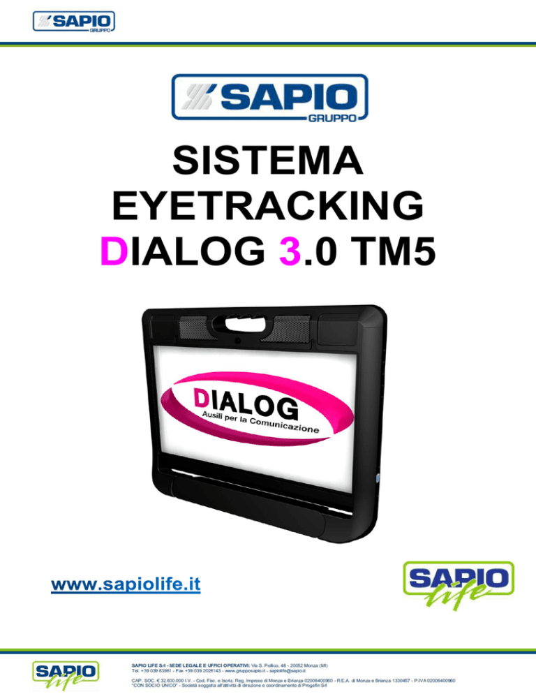 SISTEMA EYETRACKING DIALOG 3.0 TM5 Spessore 2,8 Cm Presentazione e destinazione d’uso Il Sistema Eyetracking Dialog 3.0 TM5 è un vero e proprio comunicatore verbale con sistema di puntamento binoculare di ultimissima generazione (bus usb 3.0) dotato di telecamera ad alta risoluzione e illuminatori infrarosso, da destinare a pazienti affetti da malattie del motoneurone con impossibilità comunicativa verbale e scritta. Dialog 3.0 TM5 non è classificabile come un sistema Borderline, ossia un semplice Tablet o un pc dotati di periferica di puntamento oculare e non collocabili come DM, ma un DEM costruito ad Hoc per i pazienti che necessitano di tale dispositivi. Sistema flessibile per l'accessibilità in funzione delle diverse fasi che caratterizzano i pazienti affetti da malattie del motoneurone. Ciò che caratterizza il Sistema Dialog 3.0 TM5 è la versatilità in funzione delle varie fasi di accesso al comunicatore da parte del paziente (Abilità Motorie Residue). Il sistema è stato creato per poter gestire le varie fasi di degenerazione clinica che malattie come la (SLA) comportano. La prima considerazione è l'accessibilità al comunicatore. Tipi di accessibilità: Mediante Touch Screen (prime fasi della malattia o SLA atipiche che non limitano il movimento motorio degli arti superiori). Il sistema non richiede puntamento oculare. Mediante Sensori (prime fasi della malattia ove ci siano movimenti motori residui agli arti superiori o anteriori). Il sistema non richiede puntamento oculare ma è già provvisto di switch in ogni caso l'utilizzo dei sensori può essere di aiuto anche nell'utilizzo del puntamento oculare basti pensare alla selezione che potrebbe avvenire non in modalità automatica. Mediante Software di tracciamento del movimento del capo con l'utilizzo della Web Cam integrata. (Ove ci sia da parte dell'utente un buon controllo dei movimenti del capo). Il sistema non richiede puntamento oculare ma possono essere di aiuto i sensori per facilitare la selezione. Mediante l'utilizzo del Puntamento oculare (il paziente non ha movimenti motori residui tali da permetterli un accesso al comunicatore attraverso i sistemi sopra elencati). Anche in questi casi, se dovesse esistere un movimento motorio residuo utilizzabile attraverso sensori sarebbe di facilitazione al paziente per la selezione. In funzione delle precedenti modalità di utilizzo il Sistema Dialog 3.0 TM5 dispone di tre modalità di aggancio ai vari stativi: 1 – Aggancio Rapido del Sistema completo; 2 – Aggancio rapido del solo comunicatore; 3 – Aggancio Tradizionale Vesa di entrambe le soluzioni sopra riportate. Puntamento binoculare con elevata sensibilità di tracciamento ed elevata capacità di correzione di deficit – oculari. Il Dialog 3.0 TM5 utilizza il sistema di puntamento oculare di ultima generazione della Eyetech TM5 (ultimo nato della famosissima casa costruttrice di eyetracking) associato a dei miglioramenti hardware e alle certificazioni EN 60601-1-2 che la nostra azienda ha apportato, questo sistema di puntamento può lavorare a 60 frame al secondo e garantisce, mediante il miglior algoritmo di traduzione del movimento oculare, un'accuratezza dello 0,5%. Il sistema è in grado di poter distinguere automaticamente l'attendibilità di spostamento di un singolo occhio escludendolo o rafforzando il controllo dell'occhio predominante nel tracciamento. L'algoritmo seleziona e distingue quale dei due occhi è più preciso e considera il secondo occhio come sistema di rafforzamento, chiaramente utilizzerà entrambi gli occhi nel caso in cui non sussistano problemi. Un'altra prerogativa del sistema TM5 sta nel poter lavorare anche con un basso margine di apertura delle palpebre e al sistema è sufficiente poter individuare una piccola porzione di pupilla per poterne stabilire i movimenti. Un altra problematica di estrema rilevanza che si manifesta nei casi di SLA è il continuo peggioramento del movimento oculare, il paziente SLA con il decorrere della malattia manifesta un graduale peggioramento nel movimento verticale delle pupille, il paziente avrà difficoltà soprattutto nel sollevare lo sguardo. Dialog 3.0 TM5 è stato studiato per sopperire a questa problematica, l'area visiva è di 1366 pixel x 768 pixel ( Monitor Wide che si estende più in orizzontale che in verticale) consentendo all'utente di raggiungere facilmente tutta l'area visiva senza grossi sforzi, soprattutto nel movimento oculare verticale. Infine il Comunicatore Dialog 3.0 è provvisto di un potente elaboratore di terza generazione I7 in grado di poter processare tutti e 60 i frame inputati dal TM5 senza alcuna limitazione garantendo un'accuratezza massima. Si noti che è inutile avere un puntamento oculare a 60 frame sé non c'è un processore in grado di elaborarli tutti o gran parte senza scartarne alcuno. Correzione dinamica dei movimenti del capo volontari ed involontari del capo, ottimizzata per la SLA, ma che sia in grado di gestire anche altre patologie funzionalmente assimilabili; L'algoritmo del Sistema di puntamento TM5 è stato studiato per tollerare i movimenti del capo, il sistema è anche in grado di riconoscere se il movimento è un input volontario da parte dell'utente per facilitare il puntamento di una determinata porzione di schermo quindi Dialog è in grado di sommare uno spostamento del capo a quello oculare facilitando così lo sforzo che il paziente potrebbe compiere. L'algoritmo di tracciatura per prima cosa stabilisce l'area visiva dell'intero occhio la aggancia e la traccia, quindi qualsiasi movimento del capo non influisce nel successivo tracciamento oculare. Una volta tracciata l'aria, che può anche muoversi, un altro potente algoritmo si occupa di tracciare il movimento oculare tenendo chiaramente in considerazione la precedente posizione dell'intero occhio. Quindi Dialog 3.0 TM5 è estremamente tollerante ai movimenti del capo anzi li traduce in facilitazioni per il paziente, quindi Dialog 3.0 TM5 