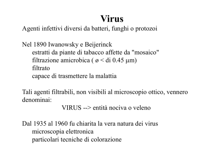 Virus Agenti infettivi diversi da batteri, funghi o protozoi Nel 1890 Iwanowsky e Beijerinck estratti da piante di tabacco affette da "mosaico" filtrazione amicrobica ( ø < di 0.45 µm) filtrato capace di trasmettere la malattia Tali agenti filtrabili, non visibili al microscopio ottico, vennero denominai: VIRUS --> entità nociva o veleno Dal 1935 al 1960 fu chiarita la vera natura dei virus microscopia elettronica particolari tecniche di colorazione Caratteristiche Principali dei Virus 1) Entità infettive contenenti o DNA o RNA (genoma virale) parassitismo genetico genoma virale app. biosintetico della cellula ospite sintesi del virione (nuova particella virale) 2) I virioni non crescono e non si dividono (dimensioni costanti) 3) I virioni non hanno ne metabolismo ne sistemi enzimatici 4) Il genoma virale non contiene rDNA o rRNA Struttura Generale dei Virioni Struttura semplice e simmetrica cristallizzazione del TMV (Stanley, 1933) osservazione di corpi cristallini intracellulari Componenti fondamentali Nucleocapside Acido nucleico Rivestimento proteico capside (formato da capsomeri) Involucro membranoso di origine cellulare spesso provvisto di spine Acidi Nucleici Virali o DNA o RNA Doppio o singolo filamento Circolare o lineare Genoma intero o segmentato Virus dell'influenza --> 8 segmenti di RNA Sf. Retrovirus --> 2 molecole di RNA Sf. Identiche Genoma semplicemente "impacchettato" nel capside Genoma che interagisce con il capside PM da 2.000 a > di 200.000 bp HIV N° di geni da 5 a > 100 (limitata quantità di informazione genetica) organizzazione dei geni in modo sovrapposto differenti fasi di lettura un gene, grande, contiene un'altro più piccolo G+C % molto variabile (come nei batteri) In alcuni casi in G+C % é molto simile a quello della specie ospite Batteriofagi temperati --> lisogenia Virus oncogeni --> trasformazione oncogena Presenza di basi modificate (batterifagi) fagi T pari (2.4.6) di E. coli --> 5-idrossimetilcitosina fagi di B. subtilis --> uridina al posto della timidina Struttura del Capside 3 differenti strutture A) Forma a Icosaedro (20 facce triangolari, 30 spigoli, 12 vertici) Le dimensioni sono fisse per ogni "specie" (tipo) di virus Capsomeri: monomeri proteici costituiti da 5-6 subunità sezione pentagonele: penton --> vertici (n° fisso = 12) sezione esagonale: exon --> spigoli e facce X174: solo 12 penton virus con un exon per spigolo (30 exon + 12 penton) virus papova: 3 exon per faccia (60 exon + 12 penton) adenovirus:12 exon per faccia (240 exon + 12 penton) B) Forma Tubulare (tipica dell' TMV) Bastoncini rigidi, o ripiegati e raggomitolati su se stessi I capsomeri sono disposti in modo elicoidale Formazione di una struttura a cilindro cavo con numero di subunità costante Legami tra le subunità (aa) di una stessa spirale e tra spirali adiacenti struttura molto strabile Tra le subunità proteiche é localizzata una molecola di RNA Diametro --> struttura dei monomeri Lunghezza --> dimensione dell'acido nucleico Viral micrographs To the left is an electron micrograph of a cluster of influenza viruses, each about 100 nanometers (billionths of a meter) long; both membrane and protein coat are visible. On the right is a micrograph of the virus that causes tobacco mosaic disease in tobacco plants C) Virioni a Struttura Complessa (spesso si riscontrano combinazioni della simmetria icosaedrica con quella elicoidale) 1) senza un vero e proprio capside, ma con molti rivestimenti intorno all'acido nucleico Virus vaccinico: poxvirus, nucleoide a forma di ciambella circondato da 2-3 strati membranosi 2) con capside non icosaedrico e/o asimmetrico per la presenza di un'appendice specializzata Batteriofagi T pari di E. coli Testa: due metà di icosaedro unite da un prisma esagonale Colletto Coda: stilo e guaina (contratile) Piastra: spine e fibre Involucri Membranosi Sono strutture caratteristiche dei virus animali Provengono dalla membrana citoplasmatica o nucleare della cellula ospite Processo di gemmazione (liberazione di nuovi virioni dalla cellula infetta) Lipidi e carboidrati --> membrana della cellula Alcune proteine --> da geni virali Durante la “riproduzione” del virus --> Sintesi di proteine virali Trasporto e deposizione sulla membrana (spine) --> Zona di gemmazione Le spine del Virus dell'influenza HA: emoagglutinina --> attacco alla cellula ospite NA: neuraminidase --> liberazione dei nuovi virioni dall'ospite Sistemi di Classificazione dei Virus Non esiste una vera e propria classificazione virale Classificazione in base alle caratteristiche principali Ospite che esso infetta: batteri, piante o animali Proprietà del virione: tipo e PM dell'acido nucleico Struttura del nucleocapside Dimensione Presenza di rivestimemti Classificazione proposta da Gibbs (1966) --> CRITTOGRAMMA Classificazione proposta dall ICTV 3 gruppi principali: virus animali, vegetali e batterici sottogruppi: tipo di involucro tipo di acido nucleico Identificazione dei Virus Per l'identificazione dell'agente infettivo responsabile di malattia I “Postulati di Koch” devono essere soddisfatti anche nel caso dei virus Identificazione --> metodi biologici che si basano sulle loro attività Capacità di infettare opportuni ospiti e di causare reazioni e/o fenomeni rilevabili: A) formazione di aree di lisi cellulare (placche) in un tappeto continuo di cellule cresciute in piastra (agar-germi) B) lisi massiva di cellule cresciute in sospensione C) aberrazioni morfologiche cellulari D) comparsa di caratteristiche lesioni localizzate Lesioni cellulari non visibili ad occhio nudo: osservazioni al microscopio delle cellule vive (rosso neutro) e di quelle morte (Blu Trypan) Virus oncogeni: foci di proliferazione Batteriofagi: batteri--> placche Virus animali: animali da lab. --> reazioni localizzate o generali embrioni di pollo colture cellulari --> placche Virus vegetali: sospensioni fagiche su foglie leggermente lesionate, comparsa di aree necrotiche, mosaici, ingiallimenti, tuberco
