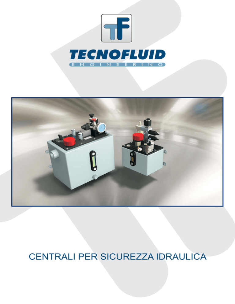 TECNOFLUID E N G I N E E R I N G CENTRALI PER SICUREZZA IDRAULICA CENTRALE PER LA SICUREZZA IDRAULICA MODELLO 5-1520 Requisiti Il sistema si compone di una centralina oleopneumatica cod. 5-1520. Tale dispositivo è stato ideato per fornire la pressione idraulica di precarica alla valvola di sicurezza idraulica per presse ad eccentrico ad un punto di spinta cod. 3-1515. L’utilizzo della centralina cod. 5-1520 è quindi subordinato all’adozione della valvola cod. 3-1515 per le cui caratteristiche si rimanda alla documentazione tecnica relativa. La linea di alimentazione pneumatica che collega la pressa alla centralina cod. 5-1520 deve essere equipaggiata con una elettrovalvola a 3 vie 2 posizioni normalmente chiusa, da un regolatore di pressione da ¼” G. completo di manometro e (qualora la macchina ne fosse sprovvista) da un lubrificatore che garantisca una alimentazione con aria compressa lubrificata alla centralina. L’aria compressa inviata alla centralina cod. 5-1520 deve inoltre essere esente da acqua di condensa, qualora la macchina non preveda nessun sistema di abbattimento della condensa, il regolatore sopra citato deve essere completo di filtro separatore. Caratteristiche Il sistema in esame oltre all’ingombro estremamente contenuto, garantisce la possibilità di utilizzare la valvola di sicurezza ad essa collegata al meglio delle sue potenzialità. Pur essendo infatti una centralina di ridotte dimensioni e di costruzione estremamente semplice, risponde a tutti i requisiti operativi di impianti molto più complessi ed ingombranti; queste sue peculiarità ne fanno un dispositivo di estremo interesse anche per applicazioni su macchine di tonnellaggio ridotto. Schema idraulico fig.1 In figura 1 è rappresentato lo schema idraulico della centralina cod. 5-1520. Si noti l’estrema semplicità di collegamento alla macchina, è infatti sufficiente collegare direttamente la centralina alla valvola per sicurezza idraulica per mezzo di una tubazione flessibile per alta pressione e collegare lo scarico da 1”1/4 di quest’ultima all’apposito attacco della centralina mediante una tubazione flessibile di dimensioni appropriate. Le simbologie utilizzate in figura 1 si interpretano come segue: Pp = alimentazione pneumatica, Pr = pressostato di minima pressione, P = attacco di mandata alla valvola di sicurezza idraulica, Vt = valvola limitatrice pressione di precarica, D= comando manuale di messa in scarico valvola di sicurezza idraulica, T= collegamento di scarico dalla valvola di sicurezza idraulica, S= serbatoio centralina. Principio di funzionamento La centralina cod. 3-1520 contiene al suo interno una pompa oleopneumatica che, azionata dalla pressione pneumatica prelevata dalla pressa su cui è montata, pompa l’olio aspirato dal serbatoio S nel condotto di mandata P. Una volta riempito il cuscino idraulico della pressa, la pressione nel condotto di mandata P si innalza fino a stabilizzarsi al valore corrispondente al rapporto di moltiplicazione aria/olio proprio della pompa di cui sopra. La pressione così raggiunta, viene poi mantenuta costante dalla pompa stessa anche in presenza di lievi trafilamenti Idraulici. Schema di collegamento alla valvola per sicurezza idraulica cod. 3-1515 fig.2 Funzionamento centralina cod. 5-1520 (schema in figura 1) Il sistema rappresentato in figura deve essere alimentato da una linea di aria compressa proveniente dalla macchina. Tale linea alimenta la pompa oleopneumatica montata nel serbatoio della centralina, la pompa azionandosi invia olio in pressione al cuscino idraulico tramite una tubazione per alta pressione. La pressione di precarica fornita dalla pompa è funzione della pressione di alimentazione pneumatica e della taglia di pompa montata nella centralina (5-1520-A, 5-1520-B, 5-1520-C, 5-1520-D, 5-1520-E), si rimanda a pag.6 per i valori di pressione forniti per ciascun tipo di centralina. Tale valore viene regolato tramite un riduttore di pressione indicato nello schema in esame e non compreso nella fornitura del dispositivo. Al raggiungimento della pressione di equilibrio la pompa si arresta mantenendo nel condotto di mandata P la pressione Idraulica impostata, durante la salita in pressione della linea di mandata P, il pressostato di minima pressione Pr ( tarato a 20 bar) si commuta dando così il segnale di macchina pronta alla pressa consentendone l’avvio. Lo stesso pressostato Pr in fase di scarico manuale o di emergenza (indotto dalla valvola di sicurezza idraulica) si commuta in apertura inviando alla macchina il segnale di emergenza (macchina non pronta/intervento sicurezza). Il pulsante di scarico D ha il dupplice scopo di mettere in scarico la sicurezza idraulica nel caso di un impuntamento della pressa in fase di prova stampo e di resettaggio della pressione di precarica della centralina. In fase di diminuzione della pressione di precarica infatti, la pressione idraulica rimane intrappolata nel cuscino idraulico, è quindi necessario mettere in scarico manualmente il sistema per regolare una pressione di precarica della sicurezza inferiore a quella precedentemente impostata. Nel caso di un aumento della pressione di precarica è invece sufficiente agire sul riduttore di pressione pneumatico collegato alla centralina per ottenere il valore desiderato (si rimanda ai grafici di pag.6 per i valori risultanti di pressione aria/olio). La valvola Vt ha lo scopo di limitare la pressione massima erogabile dalla centralina, al superamento della soglia impostata sulla valvola, la pompa oleopneumatica contenuta nella centralina stessa invia a scarico la sua portata non arrestandosi al raggiungimento della pressione di equilibrio. Il valore di taratura della valvola Vt viene calcolato in base al tonnellaggio massimo ammesso per la pressa in relazione al diametro del cuscino idraulico della stessa. La valvola Vt infine reca sul fianco una vite di spurgo da utilizzarsi in caso di accidentale disinnesco della pompa ( es.: messa in fu