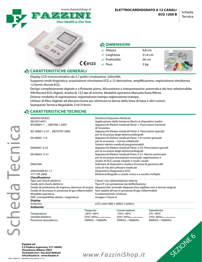 www.fazzinishop.it ELETTROCARDIOGRAFO A 12 CANALI ECG 1200 B FAZZINI Scheda Tecnica Your Health is Our Aim DIMENSIONI Altezza Larghezza 0123 Profonditá Peso 9,8 cm 31,6 cm 26 cm 3 kg CARATTERISTICHE GENERALI Display LCD monocromatico da 5.7 pollici (risoluzione: 320x240), Supporto multi-linguistico, acquisizione simultanea ECG a 12 derivazioni, amplificazione, registrazione simultanea 12 forme d’onda ECG. Design completamente digitale e a flottante pieno, Misurazione e interpretazione automatica dei test selezionabile, 300 Record ECG digitali, Analisi di 122 tipi di aritmie, Modalità operativa Manuale/Auto/Ritmo. Diverse modalità di registrazione: registrazione/stampa registrazione/stampa. Utilizzo di filtro digitale ad alta precisione per eliminare la deriva della linea di base e altri rumori. Stampante Termica Regolabile 210/216mm Scheda Tecnica CARATTERISTICHE TECNICHE MDD93/42/EEC EN ISO14971 IEC60601-1 _ GB9706.1-2007 IEC 60601-2-27 _ GB10793-2000 EN 60601-1-4 EN60601-2-25 EN 60601-2-51 EN62304 Direttiva Dispositivi Medicali Applicazione della Gestione Rischi ai dispositivi medici Apparecchi Elettro-medicali Parte 1: Prescrizioni Generali di Sicurezza Apparecchi Elettro-medicali Parte 2: Prescrizioni speciali per la sicurezza degli elettrocardiografi Apparecchi Elettro-medicali Parte 1-4: norme generali per la sicurezza – norma collaterale: Sistemi elettro-medicali programmabili Apparecchi Elettro-medicali Parte 2-25: Prescrizioni speciali per la sicurezza degli elettrocardiografi Apparecchi Elettro-medicali Parte 2-51: Norme particolari per la sicurezza: prestazioni essenziali, registrazione e analisi di ECG canale singolo e multi-canale Software di dispositivo medico Processi di gestione del ciclo di vita del software medicale Dispositivo Diagnostico ECG Elettrocardiografo a canale unico e a canale multiplo ANSI/AAMI EC-11 YY1139-2000 Classificazione Tipo anti-shock elettrico: Classe І con alimentazione interna Grado anti-shock elettrico: Tipo CF con protezione da defibrillazione Grado di protezione da ingresso dannoso di acqua: Apparecchio normale (Apparecchio sigillato non a tenuta stagna) Grado di sicurezza in presenza di gas infiammabili: Non adatto all’uso in presenza di gas infiammabili. Modalità operativa: Funzionamento continuo EMC (compatibilità elettro- magnetica) Gruppo І Classe A Display Schermo LCD colori 800 × 600(5.7 pollici) Ambiente Trasporto Conservazione Operatività Temperatura -20ºC~50ºC -10ºC~40ºC 5ºC~40ºC 25%~95%(No condensazione) 25%~85%(No condensazione) Umidità Relativa 25%~95%(No condensazione) Pressione atmosferica 700hPa ~1060hPa 700hPa ~1060hPa 860hPa ~1060hPa O Fazzini srl S.S Padana Superiore, 317-20090 Vimodrone-Milano-ITALY Tel 022651521- Fax 0227409242 info@fazzini.it - www.fazzini.it ECG 1200 B_IT_ Scheda Tecnica_Rev.0_11.12 6 E N www.FazziniShop.it S I Z E www.fazzinishop.it FAZZINI ELETTROCARDIOGRAFO A 12 CANALI ECG 1200 B Scheda Tecnica Your Health is Our Aim CARATTERISTICHE TECNICHE Alimentazione Alimentazione AC da Rete Scheda Tecnica Alimentazione DC da Batterie al Litio integrate ricaricabili Consumo elettrico Specifiche dei Fusibili Registratore Modalità registrazione Specifiche della carta di registrazione Larghezza della carta Larghezza effettiva del tracciato Velocità di scorrimento della carta Precisione della registrazione Calcolo della Frequenza Cardiaca Metodo di calcolo Range frequenza cardiaca Precisione del calcolo Unità Centrale ECG Modalità di Input Derivazione Campionamento Derivazione del ritmo Risoluzione A/D Range di misurazione Costante temporale Controllo della linea di base Risposta di frequenza Guadagno Impedenza Input: Corrente Circuito Input: Tensione stand Range di Tensione Input Tensione di calibrazione: Rumore: Interferenza fra Canali Dispersione di corrente a paziente Corrente ausiliaria a paziente Potenza dielettrica Filtro: CMRR Input e Output Esterno (Optional) Input Single End Output Single End Interfaccia di segnale Tensione Nominale=100V∼240V Frequenza Nominale=50Hz/60Hz Potenza Nominale=95VA Capacità Nominale:=4000mAh Tensione Nominale=14.4V Tensione finale di scarica ≥11V Modalità di carica: Corrente/tensione costante Corrente di carica (Standard)=0.2C5A (320mA) Tensione di carica (Standard)=(17±0.1V) Ciclo di vita ≥ 300 volte 35VA(Max) T1AL 250V Ø5×20 Stampante termica ad aghi Carta termica in rotolo/ Carta termica a pacchetto (ripiegata) 216mm/210mm 200mm/195mm 5 mm/s、10 mm/s、12.5 mm/s、25mm/s、50mm/s(±3%) ±5%(asse X), ±5% (asse Y) Test del valore di picco 30BPM~300BPM ±1 BPM Massa flottante, protezione da defibrillazione e inibizione pacing pulse 12 derivazioni standard rilevate in modo sincrono Campionamento sequenziale di ogni gruppo, campionamento sincrono di ogni gruppo Singolo canale e tre canali a scelta, 12 derivazioni selezionabili per ogni canale 12 bits >±5mV ≥5S(0, +20%) Regolazione automatica 0.05Hz ~ 150Hz (-3dB) AGC, 2.5, 5, 10, 20, 20/10, 10/5(mm/mV), errore ±2%. ≥50MΩ.(10Hz) ≤50nA ±650mV <±5 mVpp Calibration Voltage: 1mV±1% ≤15μVp-p ≤0.5mm <10μA (100V∼240V 50Hz/60Hz) <0.1μA (DC) 4000V rms Filtro AC:50Hz/60Hz/Close Filtro della Deriva: 0.05Hz/0.15Hz/0.25Hz/0.50Hz/ Filtro EMG: 25Hz/35Hz/45Hz/Close Filtro Passa-basso: 70Hz/100Hz/150Hz ≥105dB ≥100 kΩ; Guadagno 10mm/V±5% ≤100 Ω; Guadagno 1V/mV±5% Interfaccia Comunicazione RS232 SPECIFICHE 6 E N DISPOSITIVO MEDICO DI CLASSE II A CONFORME ALLA DIRETTIVA 93/42 CEE Num. Repertorio 557228 CND Z12050301 O Fazzini srl S.S Padana Superiore, 317-20090 Vimodrone-Milano-ITALY Tel 022651521- Fax 0227409242 info@fazzini.it - www.fazzini.it ECG 1200 B_IT_ Scheda Tecnica_Rev.0_11.12 www.FazziniShop.it S I Z E