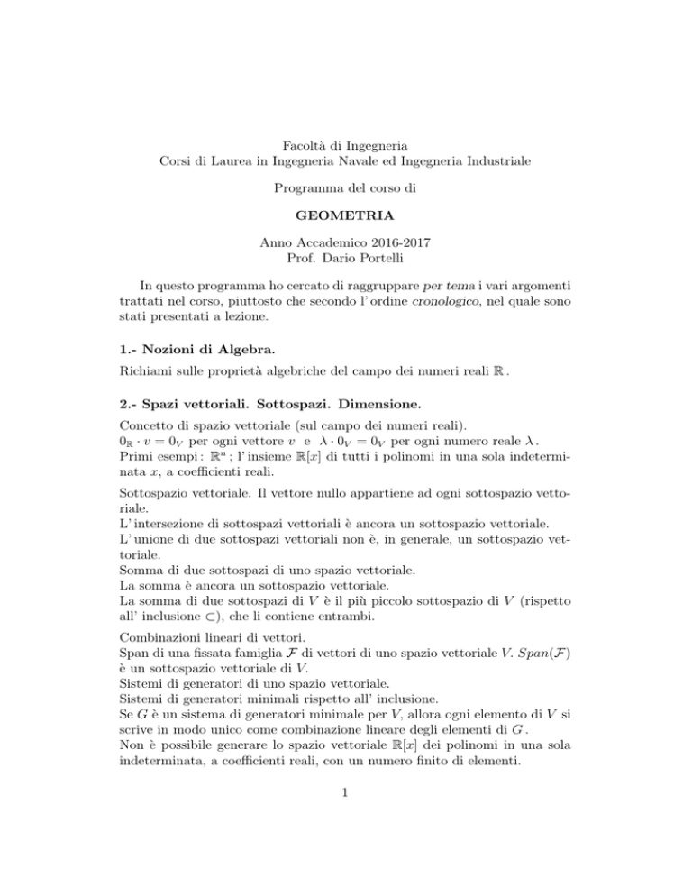 Primi esempi : Rn ; l’ insieme R[x] di tutti i polinomi in una sola indeterminata x, a coefficienti reali.