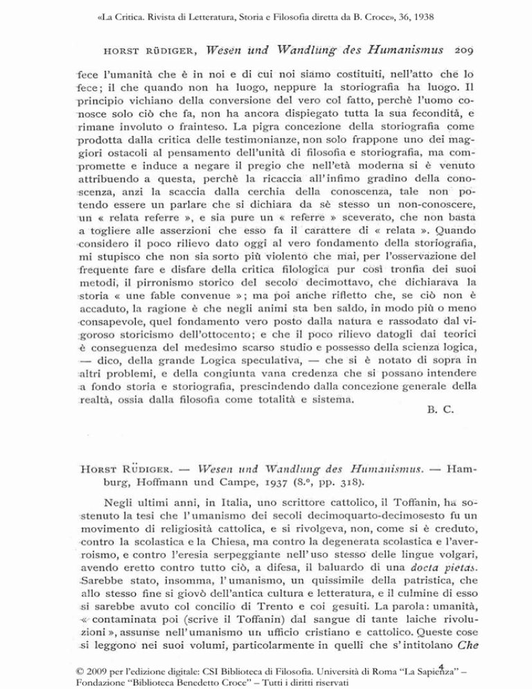 «La Critica. Rivista di Letteratura, Storia e Filosofia diretta da B. Croce», 36, 1938 HORST RUDIGER, Wesen urzd W n n d l ~ ~ ndes g Humnnismtls 209 fece l'umanità che è in noi e di cui noi siamo costituiti, nell'atto che lo fece; il che quando non ha luozo, neppure la storiografia ha luogo. I1 principio vichiano della conversione del vero col fatto, perchè l'uomo conosce solo ciò che fa, non ha ancora dispiegato tutta la sua fecondith, e rimane involuto o frainteso. L a pigra concezione della storiografia come prodotta dalla critica delle testimonianze, non solo frappone uno dei maggiori ostacoli al pensamento dell'unità di filosofia e storiografia, ma compromette e induce a negare il pregio che nell'età moderna si è venuto attribuendo a questa, perchè la ricaccia all'infimo gradino della conoscenza, anzi la scaccia dalla cerchia della conoscenza, tale non potendo essere un parlare che si dichiara da sè stesso un non-conoscere, u n « relata referre », e sia pure un « referre » sceverato, che non basta a togliere alle asserzioni che esso fa il carattere di « relata D. Quando considero il poco rilievo dato oggi al vero fondamento della storiografia, mi stupisco che non sia sorto più violento che mai, per l'osservazione del frequehte fare e disfare della critica filologica pur cos3 tronfia dei suoi metodi, il pirronismo storico del secolo decimottavo, che dichiarava la storia « une fable convenue P ; ma poi anche rifletto che, s e ciò non è accaduto, la ragione è che negli animi sta ben saldo, in modo più o meno cotlsapevole, quel fondamento vero posto dalla natura e rassodato dal vigoroso storicismo dell'ottocento; e che il poco rilievo datogli dai teorici è conseguenza del medesimo scarso studio e possesso della scienza logica, - dico, della grande Logica speculativa, - che si è notato di sopra in altri problemi, e della congiunta vana credenza che si possano intendere a fondo storia e storiografia, prescindendo dalla concezione generale della realtà, ossia dalla filosofia come totalità e sistema. B. C. HORST RUDIGER. - T;Veseiz 11nd W n n d l ~ ~ i zdes g H u r ~ z a i ~ i s n r~ ~ sHam. burg, Hoffmann und Campe, 1937 (&O, pp. 318). Negli ultimi anni, in Italia, uno scrittore cattolico, il Toffanin, h& sostenuto la tesi che I'umanismo dei secoli decimoquarto-decimosesto fu un movimento di religiosità cattolica, e si rivolgeva, non, c a n e si è creduto, contro la scolastica e la Chiesa, ma contro la degenerata scolastica e l'averroismo, e contro l'eresia serpeggiante nell'uso stesso delle lingue volgari, avendo eretto contro tutto ciò, a difesa, il baluardo di una docla pietm. Sarebbe stato, insomma, l'umanismo, un quissimile della patristica, che allo stesso fine si giovò dell'antica cultura e letteratura, e il culmine di esso s i sarebbe avuto col concilio di Trento e coi gesuiti. La parola: umanità, ivcontaminata poi (scrive il Toffanin) dal sangue di tante laiche rivoluzioni », assunse nell'umanismo uri ufficio cristiano e cattolico. Queste cose si leggono nei suoi volumi, particolarmente in quelli che s'intitolano Che © 2009 per l’edizione digitale: CSI Biblioteca di Filosofia. Università di Roma “La Sapienza” – Fondazione “Biblioteca Benedetto Croce” – Tutti i diritti riservati «La Critica. Rivista di Letteratura, Storia e Filosofia diretta da B. Croce», 36, 1938 ZIO RIVISTA BIBLIOGRAFICA cosa è I'unzanismo (Firenze, 1929), e Storia deIl7umanisnzo dal X I I I rrT X V I secolo (Napoli, 1933). Ma la tesi del Toffanin (poichè, nonostante i tempi avversi e forse per l'efficacia di questi, il pensiero storico, tutto sommato, è progredito) non ha ricevuto buone accoglienze; sebbene l'autore si sia confortato con l'alta conferma che essa trova (Sloria cit., p. 313) nel giudizio di un noto giornalista, improvvisatore d'interpretazioni storiche, il Borgese, il quale scopri che la letteratura italiana ha un suo carattere peculiare e che questo (nei romanzi di lui non meno che nella Commedia dantesca) è la trascendenza. I n verità, il sofisma si presenta troppo palmare, perchè il fatto che la Chiesa cattolica, accomodante ed abile come sempre, si valesse dell'umanismo, non vuol dire che l'umanismo fosse nella sua natura un movimento cattolico; allo stesso modo che l'uso a cui i padri della chiesa piegarono la letteratura pagana non fece di questa una letteratura in anticipazione cristiana. Chiunque ha senso storico avverte intuitivamente che con l'umanismo vengono innanzi problemi che non hanno niente da vedere con la difesa della fede cattolica: rinnovamento di cultura, ritrovamento dell'antichità classica come norma, adozione del latino, non più del vivente e popolare come nel medioevo ma dell'antico, considerato lingua dotta o lingua sacra; sicchè l'umanismo fu il preannunzio, nel campo particolare della letteratura, del più largo Rinascimento in tutte le parti della vita. La tendenza opposta alla trascendenza e alla Chiesa cattolica che la rappresenta, non ebbe bisogno di affermarsi strepitosamente o in modo esplicito, perchè, anche quando non ce ne è l'affermazione e c'è anzi l'ossequio alla religione e alla chiesa, l'opposizione è implicita, nasce dalla cosa stessa. I gesuiti poterono adottarlo, come tante altre cose del mondo moderno adottarono per astuzia di guerra; ma lo studio dei greci e dei romani rimase intrinsecamente (come Hegel lo chiamava in uno dei suoi discorsi di quando era direttore del ginnasio di Norimberga) « das geistige Bad, die profane Taufe », il bagno spirituale, il battesimo profano, che dà speciale tempra e colore all'aniina; nè esso fu ultima cagione del fatto solitamente ricordato, che molti, allevati nelle scuole dei gesuiti, ne uscirono razionalisti e di liberi spiriti. Al Toffanin è tolto di sentire e vedere tutto ciò, non tanto per il suo presupposto cattolico, quanto per una deficienza che è in lui del sopraddetto senso storico, deficienza che a più riprese si manifesta nel convinci