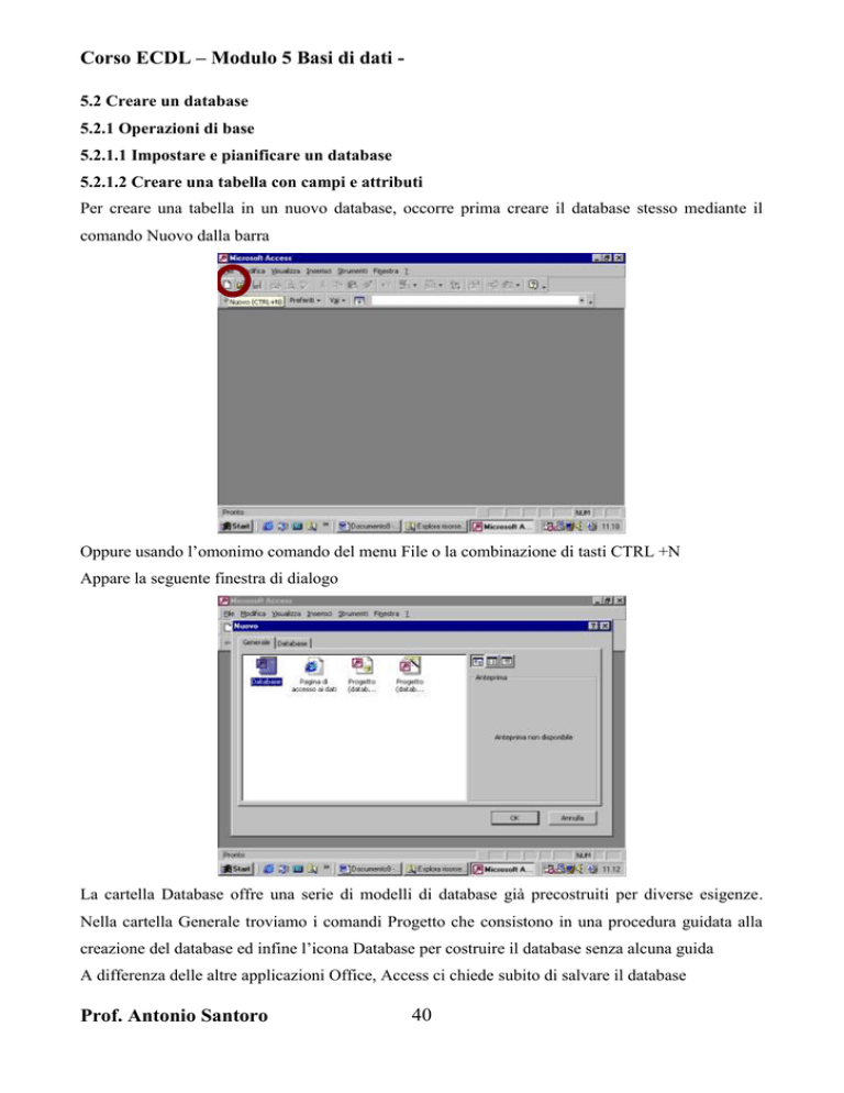 Corso ECDL – Modulo 5 Basi di dati 5.2 Creare un database 5.2.1 Operazioni di base 5.2.1.1 Impostare e pianificare un database 5.2.1.2 Creare una tabella con campi e attributi Per creare una tabella in un nuovo database, occorre prima creare il database stesso mediante il comando Nuovo dalla barra Oppure usando l’omonimo comando del menu File o la combinazione di tasti CTRL +N Appare la seguente finestra di dialogo La cartella Database offre una serie di modelli di database già precostruiti per diverse esigenze. Nella cartella Generale troviamo i comandi Progetto che consistono in una procedura guidata alla creazione del database ed infine l’icona Database per costruire il database senza alcuna guida A differenza delle altre applicazioni Office, Access ci chiede subito di salvare il database Prof. Antonio Santoro 40 Corso ECDL – Modulo 5 Basi di dati - Diamogli un nome e premiamo il pulsante Crea come potete notare, il database non presenta alcun oggetto Prof. Antonio Santoro 41 Corso ECDL – Modulo 5 Basi di dati - Cominciamo con l’inserire una tabella. Possiamo farlo usando uno dei tre comandi che vediamo nella finestra Crea una tabella in visualizzazione Struttura Crea una tabella mediante una creazione guidata crea una tabella mediante immissione dei dati Clicchiamo sulla voce corrispondente a Crea una tabella in visualizzazione Struttura appare la seguente finestra di dialogo che ci consentirà di disegnare la struttura della tabella in termini di campi Supponiamo che sia una sorta di agenda in cui vogliamo inserire i dati relativi ad una persona. Il primo campo che vogliamo inserire sarà quello del nome. Nella prima colonna immettiamo il nome del campo e nella seconda scegliamo il tipo dei dati che saranno contenuti in esso Prof. Antonio Santoro 42 Corso ECDL – Modulo 5 Basi di dati - Il campo dovrà essere di tipo Testo. Il tipo testo è un tipo di dato costituito da una stringa di caratteri di lunghezza massima pari a 256. si noti che, scelto il tipo di dati, la cartella Generale nella parte inferiore della finestra, si è aggiornata automaticamente con le varie opzioni previste per questo tipo di campo. La prima opzione è relativa alla lunghezza: il campo potrà contenere al massimo 256 caratteri ma noi possiamo decidere di permettere una lunghezza ancora inferiore, per default abbiamo una lunghezza massima di 50 caratteri. Ciò vuol dire che, quando andremo ad utilizzare questa tabella , non potremo immetter più di 50 caratteri nel campo. Nell'impostazione della proprietà Formato è possibile utilizzare simboli speciali per la creazione di formati personalizzati per i campi Testo e Memo. Impostazione Prof. Antonio Santoro 43 Corso ECDL – Modulo 5 Basi di dati È possibile creare formati testo e memo personalizzati utilizzando i seguenti simboli: Simbolo Descrizione @ Carattere di testo obbligatorio (un carattere o uno spazio). & Carattere di testo non obbligatorio. < Converte tutti i caratteri in minuscolo. > Converte tutti i caratteri in maiuscolo. I formati personalizzati dei campi Testo e Memo possono contenere fino a due sezioni. Ciascuna sezione contiene la specifica del formato per i diversi dati di un campo. Sezione Descrizione Prima Formato per campi con testo. Seconda Formati per campi con stringhe di lunghezza zero e valori Null. Ad esempio, se si desidera visualizzare la parola "Nessuno" in un controllo di casella di testo quando nel campo non vi sono stringhe, come impostazione di della proprietà Formato del controllo digitare il formato personalizzato @;"Nessuno". Il simbolo @ provoca la visualizzazione del testo del campo; la seconda sezione causa la visualizzazione della parola "Nessuno" in presenza di una stringa di lunghezza zero o del valore Null. Come altro esempio posso inserire il simbolo > nella sezione Formato Prof. Antonio Santoro 44 Corso ECDL – Modulo 5 Basi di dati - In questo caso, quando utilizzerò la tabella, anche se inserirò il nome scritto con caratteri minuscoli, esso sarà visualizzato maiuscolo Con la maschera di input possiamo creare una maschera che facilita l’immissione dei dati quando usiamo una tabella clicchiamo sul pulsantino che appare sulla destra e appare una finestra che ci guida a creare la maschera Prof. Antonio Santoro 45 Corso ECDL – Modulo 5 Basi di dati - supponiamo, ad esempio, che si tratti di un campo in cui l’utente deve inserire un codice fiscale. Si tratta di un campo in cui è facile commettere errori di immissione se clicchiamo sulla finestra Prova vediamo l’effetto che vedrà l’utente quando entrerà in quel campo delle linee segneranno i posti che dovranno essere occupati dalle lettere immesse dall’utente della tabella. In tal modo egli si accorgerà subito se avrà inserito caratteri in meno rispetto a quelli richiesti Cliccando sul pulsante Avanti si accede ad una nuova finestra in cui si può modificare il simbolo segnaposto Prof. Antonio Santoro 46 Corso ECDL – Modulo 5 Basi di dati - La proprietà etichetta consente di associare un nome ad un campo. Se, ad esempio, scelgo l’etichetta “Nome maiuscolo”, essa apparirà in testa alla colonna corrispondente a quel campo quando userò la tabella se (vedremo in seguito come si fa) creo una maschera per quella tabella Prof. Antonio Santoro 47 Corso ECDL – Modulo 5 Basi di dati - e vi creo una finestra per accedere a quel campo mediante trascinamento, automaticamente a quel campo verrà associata l’etichetta la proprietà Valore predefinito consente di inserire una stringa che apparirà nel campo prima che l’utente inserisca i dati voluti Il campo Valido Se mi consente di inserire delle regole che deve rispettare il dato inserito dall’utente Prof. Antonio Santoro 48 Corso ECDL – Modulo 5 Basi di dati - nel nostro esempio non si potranno inserire nomi che inzino per D. quando l’utente andrà ad inserire il nome Dario il programma gli segnalerà di aver violato la regola Il campo Messaggio di errore consente di deci