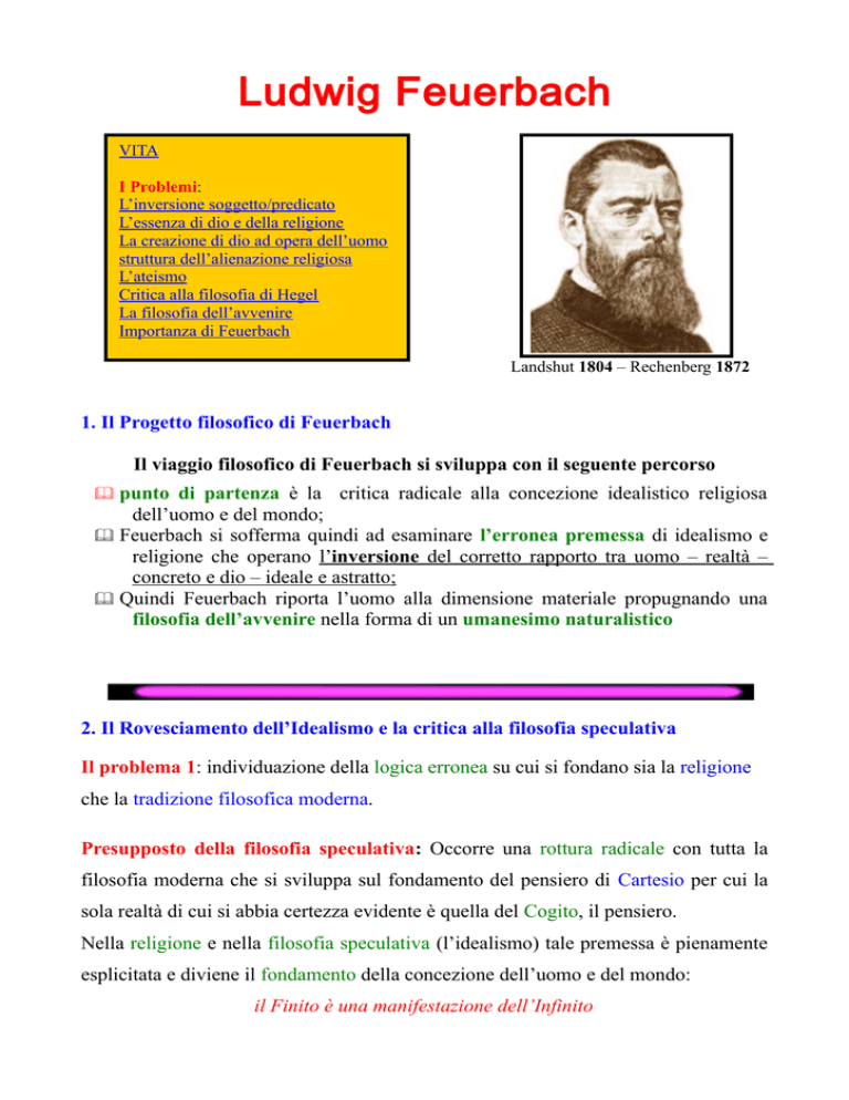 Ludwig Feuerbach VITA I Problemi: L’inversione soggetto/predicato L’essenza di dio e della religione La creazione di dio ad opera dell’uomo struttura dell’alienazione religiosa L’ateismo Critica alla filosofia di Hegel La filosofia dell’avvenire Importanza di Feuerbach Landshut 1804 – Rechenberg 1872 1. Il Progetto filosofico di Feuerbach Il viaggio filosofico di Feuerbach si sviluppa con il seguente percorso punto di partenza è la critica radicale alla concezione idealistico religiosa dell’uomo e del mondo; Feuerbach si sofferma quindi ad esaminare l’erronea premessa di idealismo e religione che operano l’inversione del corretto rapporto tra uomo – realtà – concreto e dio – ideale e astratto; Quindi Feuerbach riporta l’uomo alla dimensione materiale propugnando una filosofia dell’avvenire nella forma di un umanesimo naturalistico 2. Il Rovesciamento dell’Idealismo e la critica alla filosofia speculativa Il problema 1: individuazione della logica erronea su cui si fondano sia la religione che la tradizione filosofica moderna. Presupposto della filosofia speculativa: Occorre una rottura radicale con tutta la filosofia moderna che si sviluppa sul fondamento del pensiero di Cartesio per cui la sola realtà di cui si abbia certezza evidente è quella del Cogito, il pensiero. Nella religione e nella filosofia speculativa (l’idealismo) tale premessa è pienamente esplicitata e diviene il fondamento della concezione dell’uomo e del mondo: il Finito è una manifestazione dell’Infinito La Causa primaria e originaria, il soggetto di cui la realtà e l’uomo sono un semplice attributo è l’infinito. Nel linguaggio di Feuerbach questa premessa viene così formulata: Il concreto è una produzione-manifestazione dell’astratto Soggetto Astratto Predicato Concreto Quindi religione e idealismo operano una inversione del reale rapporto tra concreto e astratto. Ma cosa intende esattamente Feuerbach con queste due espressioni? Concreto Astratto Finito Infinito Uomo Dio Reale Ideale Natura - Realtà Pensiero – Ragione Corretto Rapporto Causa Effetto Primario Secondario Appare qui chiaramente la premessa della filosofia speculativa secondo cui la vera realtà, il vero essere non è il concreto, ma l’astratto: ”il Soggetto è l’astratto di cui il concreto è predicato”. La religione, la filosofia speculativa, hanno rovesciato il corretto rapporto tra pensiero ed essere. Tutta la tradizione filosofica occidentale è dominata dall’idea di dio, posto come causa prima e fine ultimo del reale e “fuori” dal reale (trascendente).Da ciò il carattere religioso della cultura occidentale, anche di quella moderna. L’uomo assume come criterio di conoscenza (filosofia Teoretica) e come criterio di azione (filosofia Pratica), Dio Verità assoluta Bene assoluto La filosofia hegeliana non è che religione razionalizzata in cui, all’idea antropomorfica e personale di dio si sostituisce quella dell’Assoluto, dello Spirito, della Ragione, di cui la realtà sarebbe una manifestazione. L’inversione della filosofia speculativa: Occorre ristabilire il corretto rapporto di predicazione tra pensiero e realtà per eliminare l’inversione di esso operata dall’idealismo: ”Il vero rapporto tra pensiero ed essere non può essere che questo: l’essere è il soggetto, il pensiero il predicato. Il pensiero dunque deriva dall’essere, ma non l’essere dal pensiero” L’inizio della filosofia non è Dio, non è l’Assoluto, non è l’essere come predicato dell’assoluto o dell’idea: l’inizio della filosofia è il finito, il determinato, il reale” Si può definire la proposta di Feuerbach come tipica di una metodologia materialista 3. La critica alla religione Problema 2: come viene a costituirsi il concetto di dio frutto, secondo la metodologia materialistica, di una creazione compiuta dall’uomo? In altri termini: qual è la vera essenza dio? quale la vera essenza della religione? Essenza di Dio Dio è il prodotto di una proiezione delle proprie qualità (ragione – volontà – amore) che l’uomo personifica in un ente che pone come trascendente nella forma dell’altro da sé La teologia è quindi una antropologia capovolta, è l’uomo che ha creato dio e non dio che ha creato l’uomo: coscienza che l’uomo ha di sé ma oggettivata la propria essenza in quanto considerata autonoma e posta fuori di sé Essenza della religione Essenza di ogni religione è quella di essere un’idolatria in cui l’uomo divinizzato viene adorato come un ente sovra umano La teologia è una antropologia capovolta Infatti ogni religione si afferma come smascheramento del carattere idolatrico di quella precedente. c r e a z io n e d i d io U O M O A U T O C O S C IE N Z A Q U A L IT A ' R A G IO N E V O LO N TA' AM O RE V E R IT A ' PO TEN ZA B EN E IN F IN IT IZ Z A Z IO N E FU O RID AL M O N D O TR ASC EN D EN ZA P R O IE Z IO N E IL L U S O R IA P O N E D IO F U O R I D I S E CO M E ALTRO D A SE O G G E T T IV A Z IO N E F A N T A S T IC A P O N E D IO C O M E E N T E A V E N T E A U T O N O M A E S IS T E N Z A Problema 3: Chiarita l’essenza di dio resta da chiarire quali sono i motivi che portano l’uomo a “creare dio”. Dio come coscienza dell’infinità del proprio essere 1. L’uomo percepisce se come individuo finito 2. mentre come specie percepisce l’umanità come onnipotente 3. Dio è allora la personificazione e oggettivazione dell’immagine che l’uomo ha di sé come specie Dio come ottativo del cuore Dio nasce dall’opposizione esistente nell’uomo tra il suo 1. Volere infinito: i desideri umani sono infiniti per quantità e qualità 2. Potere finito: il potere dell’uomo è limitato (morte, malattia, fame, ignoranza, imperfezioni morali, ecc.) L’uomo è un groviglio di contraddizioni e sarebbe condannato alla frustrazione e alla sofferenza se non ponesse in un ente superiore la possibilità di esaudire i suoi desideri (immortalità amore, onn