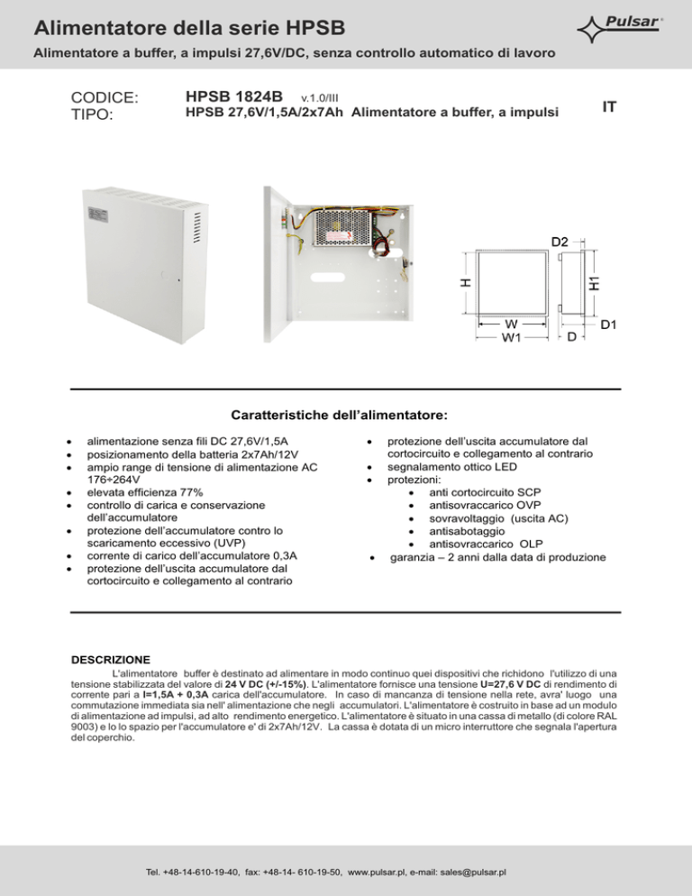 Pulsar Alimentatore della serie HPSB Alimentatore a buffer, a impulsi 27,6V/DC, senza controllo automatico di lavoro HPSB 1824B CODICE: TIPO: v.1.0/III HPSB 27,6V/1,5A/2x7Ah Alimentatore a buffer, a impulsi IT Caratteristiche dell’alimentatore: · · · · · · · · alimentazione senza fili DC 27,6V/1,5A posizionamento della batteria 2x7Ah/12V ampio range di tensione di alimentazione AC 176÷264V elevata efficienza 77% controllo di carica e conservazione dell’accumulatore protezione dell’accumulatore contro lo scaricamento eccessivo (UVP) corrente di carico dell’accumulatore 0,3A protezione dell’uscita accumulatore dal cortocircuito e collegamento al contrario protezione dell’uscita accumulatore dal cortocircuito e collegamento al contrario · segnalamento ottico LED · protezioni: · anti cortocircuito SCP · antisovraccarico OVP · sovravoltaggio (uscita AC) · antisabotaggio · antisovraccarico OLP · garanzia – 2 anni dalla data di produzione · DESCRIZIONE L'alimentatore buffer è destinato ad alimentare in modo continuo quei dispositivi che richidono l'utilizzo di una tensione stabilizzata del valore di 24 V DC (+/-15%). L'alimentatore fornisce una tensione U=27,6 V DC di rendimento di corrente pari a I=1,5A + 0,3A carica dell'accumulatore. In caso di mancanza di tensione nella rete, avra' luogo una commutazione immediata sia nell' alimentazione che negli accumulatori. L'alimentatore è costruito in base ad un modulo di alimentazione ad impulsi, ad alto rendimento energetico. L'alimentatore è situato in una cassa di metallo (di colore RAL 9003) e lo lo spazio per l'accumulatore e' di 2x7Ah/12V. La cassa è dotata di un micro interruttore che segnala l'apertura del coperchio. wyjście TAMPER : przewody 30cm Tel. +48-14-610-19-40, fax: +48-14- 610-19-50, www.pulsar.pl, e-mail: sales@pulsar.pl ® Alimentatore della serie HPSB Pulsar Alimentatore a buffer, a impulsi 27,6V/DC, senza controllo automatico di lavoro DATI TECNICI Tipo alimentatore Tensione d’alimentazione Presa di potenza Potenza dell’alimentatore Efficienza Tensione d’uscita Corrente d’uscita Corrente d’uscita tAMB<30°C Corrente d’uscita tAMB=40°C Campo di regolazione della tensione Tensione di pulsazione Corrente di carico dell’accumulatore Sicurezza contro cortocircuito SCP Protezione nel circuito dell'accumulatore OLP Protezione a massimo di tensione OVP Protezione dell’accumulatore contro lo scaricamento eccessivo UVP Segnalazione ottica lavoro Condizioni lavoro Scatola Dimensioni della scatola Peso netto/lordo Posizionamento della batteria Chiusura Protezione antisabotaggio Osservazioni A (EPS - External Power Source) 176÷264V AC 50÷60Hz 0,6A@230VAC max. 50W max. 77% 27,6V DC – lavoro a buffer 19V÷27,0V DC – lavoro a batterie 1,5A + 0,3A carica dell’accumulatore 1,5 A + 0,3A carica dell’accumulatore - vedi grafico 1 1,0 A + 0,3A carica dell’accumulatore - vedi grafico 1 24÷28V DC 150mV p-p max. 0,3A max. @ 2x7Ah (± 5%) elettroniche PTC U>115% ÷ 150% - scollegamento della tensione d’uscita, ripristinato automaticamente U<19 V (± 5%) - scollegamento del morsetto Sì - i LED II classe ambientale, -10 oC÷40 oC metallica, IP20, colore RAL9003 285 x 297 x 80+8 [mm] (280 x 292 x 80) (WxHxD) 2,20kg / 2,30kg 2x7Ah/12V (SLA) max. Vite a cilindro x 2 (possibilità di montaggio di una serratura) 1 x microinterruttore: apertura della scatola, 0,5A@50VDC max, NC Distante dalla parete (superficie) di 8 mm. Raffreddamento alimentatore: di tipo convettivo, Giunti: Uscite: Φ0,63÷2,5 I/O PCB: Φ0,41÷1,63, Uscite dell’accumulatore: 6,3F-2,5/40cm. Grafico 1. Corrente dell'alimentatore ammissibile in uscita a seconda, della temperatura dell'ambiente. Tel. +48-14-610-19-40, fax: +48-14- 610-19-50, www.pulsar.pl, e-mail: sales@pulsar.pl ® Pulsar Alimentatore della serie HPSB ® Alimentatore a buffer, a impulsi 27,6V/DC, senza controllo automatico di lavoro Configurazioni opzionali dell'alimentatore: Accumulatore 7Ah HPSB1824B Alimentatore a buffer HPSB 27,6V/2x0,75A/2x7Ah. - HPSB1824B + LB2 2x0,75A (AWZ586) + 2x7Ah AC 230V LB2 27,6V 27,6V 2x0,75A DC 27,6V 2 x accumulatore 7Ah HPSB1824B Alimentatore a buffer HPSB 27,6V/3x0,5A/2x7Ah. AC 230V - HPSB1824B + LB4 3x0,5A (AWZ574 o AWZ576) + 2x7Ah LB4 27,6V 27,6V 3x0,5A DC 27,6V 2 x accumulatore 7Ah Alimentatore a buffer HPSB 27,6V/24V/1,5A/2x7Ah. RN25024 HPSB1824B 230V AC - HPSB1824B + RN25024 (27,6V/24V) + 2x7Ah 27,6V 27,6V 24V 24V DC 27,6V 2 x accumulatore 7Ah Alimentatore a buffer HPSB 27,6V/24V/2x0,75A/2x7Ah. HPSB1824B 230V AC - HPSB1824B + RN25024 (27,6V/24V) + LB2 2x0,75A (AWZ586) + 2x7Ah RN25024 27,6V 27,6V LB2 24V 24V 2x0,75A 24V DC 27,6V 2 x accumulatore 7Ah HPSB1824B Alimentatore a buffer HPSB 27,6V/24V/3x0,5A/2x7Ah. 230V AC - HPSB1824B + RN25024 (27,6V/24V) + LB4 3x0,5A (AWZ574 o AWZ576) + 2x7Ah LB4 RN25024 27,6V 27,6V 24V 24V DC 27,6V 2 x accumulatore 7Ah HPSB1824B Alimentatore a buffer HPSB 27,6V/5V÷18V /2A÷1,3A/2x7Ah. - HPSB1824B + DCDC20 (5V÷18V/2A÷1,3A) + 2x7Ah 230V AC 27,6V DC DC 27,6V 2 x accumulatore 7Ah wyjście TAMPER : przewody 30cm Tel. +48-14-610-19-40, fax: +48-14- 610-19-50, www.pulsar.pl, e-mail: sales@pulsar.pl 5V÷18V/2A÷1,3A DC 24V 3x0,5A