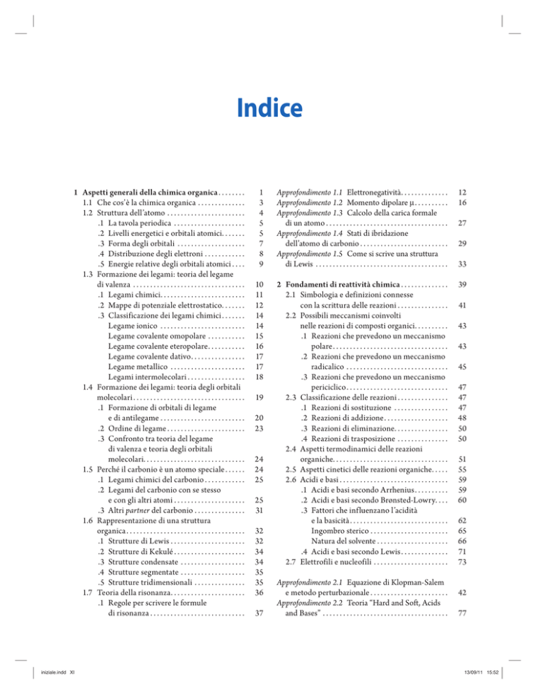 Indice 1 Aspetti generali della chimica organica . . . . . . . . 1.1 Che cos’è la chimica organica . . . . . . . . . . . . . . 1.2 Struttura dell’atomo . . . . . . . . . . . . . . . . . . . . . . . .1 La tavola periodica . . . . . . . . . . . . . . . . . . . . . .2 Livelli energetici e orbitali atomici. . . . . . . .3 Forma degli orbitali . . . . . . . . . . . . . . . . . . . . .4 Distribuzione degli elettroni . . . . . . . . . . . . .5 Energie relative degli orbitali atomici . . . . 1.3 Formazione dei legami: teoria del legame di valenza . . . . . . . . . . . . . . . . . . . . . . . . . . . . . . . . . .1 Legami chimici. . . . . . . . . . . . . . . . . . . . . . . . . .2 Mappe di potenziale elettrostatico. . . . . . . .3 Classificazione dei legami chimici . . . . . . . Legame ionico . . . . . . . . . . . . . . . . . . . . . . . . . Legame covalente omopolare . . . . . . . . . . . Legame covalente eteropolare. . . . . . . . . . . Legame covalente dativo. . . . . . . . . . . . . . . . Legame metallico . . . . . . . . . . . . . . . . . . . . . . Legami intermolecolari . . . . . . . . . . . . . . . . . 1.4 Formazione dei legami: teoria degli orbitali molecolari . . . . . . . . . . . . . . . . . . . . . . . . . . . . . . . . . .1 Formazione di orbitali di legame e di antilegame . . . . . . . . . . . . . . . . . . . . . . . . . .2 Ordine di legame . . . . . . . . . . . . . . . . . . . . . . . .3 Confronto tra teoria del legame di valenza e teoria degli orbitali molecolari. . . . . . . . . . . . . . . . . . . . . . . . . . . . . . 1.5 Perché il carbonio è un atomo speciale . . . . . . .1 Legami chimici del carbonio . . . . . . . . . . . . .2 Legami del carbonio con se stesso e con gli altri atomi . . . . . . . . . . . . . . . . . . . . . .3 Altri partner del carbonio . . . . . . . . . . . . . . . 1.6 Rappresentazione di una struttura organica. . . . . . . . . . . . . . . . . . . . . . . . . . . . . . . . . . . .1 Strutture di Lewis . . . . . . . . . . . . . . . . . . . . . . .2 Strutture di Kekulé . . . . . . . . . . . . . . . . . . . . . .3 Strutture condensate . . . . . . . . . . . . . . . . . . . .4 Strutture segmentate . . . . . . . . . . . . . . . . . . . .5 Strutture tridimensionali . . . . . . . . . . . . . . . 1.7 Teoria della risonanza. . . . . . . . . . . . . . . . . . . . . . .1 Regole per scrivere le formule di risonanza . . . . . . . . . . . . . . . . . . . . . . . . . . . . iniziale.indd XI 1 3 4 5 5 7 8 9 Approfondimento 1.1 Elettronegatività. . . . . . . . . . . . . . Approfondimento 1.2 Momento dipolare ¶ . . . . . . . . . . Approfondimento 1.3 Calcolo della carica formale di un atomo . . . . . . . . . . . . . . . . . . . . . . . . . . . . . . . . . . . . Approfondimento 1.4 Stati di ibridazione dell’atomo di carbonio . . . . . . . . . . . . . . . . . . . . . . . . . . Approfondimento 1.5 Come si scrive una struttura di Lewis . . . . . . . . . . . . . . . . . . . . . . . . . . . . . . . . . . . . . . . 10 11 12 14 14 15 16 17 17 18 2 Fondamenti di reattività chimica . . . . . . . . . . . . . . 2.1 Simbologia e definizioni connesse con la scrittura delle reazioni . . . . . . . . . . . . . . . 2.2 Possibili meccanismi coinvolti nelle reazioni di composti organici. . . . . . . . . . .1 Reazioni che prevedono un meccanismo polare. . . . . . . . . . . . . . . . . . . . . . . . . . . . . . . . . . .2 Reazioni che prevedono un meccanismo radicalico . . . . . . . . . . . . . . . . . . . . . . . . . . . . . . .3 Reazioni che prevedono un meccanismo periciclico. . . . . . . . . . . . . . . . . . . . . . . . . . . . . . 2.3 Classificazione delle reazioni . . . . . . . . . . . . . . . .1 Reazioni di sostituzione . . . . . . . . . . . . . . . . .2 Reazioni di addizione. . . . . . . . . . . . . . . . . . . .3 Reazioni di eliminazione. . . . . . . . . . . . . . . . .4 Reazioni di trasposizione . . . . . . . . . . . . . . . 2.4 Aspetti termodinamici delle reazioni organiche. . . . . . . . . . . . . . . . . . . . . . . . . . . . . . . . . . 2.5 Aspetti cinetici delle reazioni organiche. . . . . 2.6 Acidi e basi . . . . . . . . . . . . . . . . . . . . . . . . . . . . . . . . .1 Acidi e basi secondo Arrhenius. . . . . . . . . . .2 Acidi e basi secondo Brønsted-Lowry. . . . .3 Fattori che influenzano l’acidità e la basicità. . . . . . . . . . . . . . . . . . . . . . . . . . . . . Ingombro sterico . . . . . . . . . . . . . . . . . . . . . . . Natura del solvente . . . . . . . . . . . . . . . . . . . . . .4 Acidi e basi secondo Lewis . . . . . . . . . . . . . . 2.7 Elettrofili e nucleofili . . . . . . . . . . . . . . . . . . . . . . 19 20 23 24 24 25 25 31 32 32 34 34 35 35 36 37 Approfondimento 2.1 Equazione di Klopman-Salem e metodo perturbazionale . . . . . . . . . . . . . . . . . . . . . . . Approfondimento 2.2 Teoria “Hard and Soft, Acids and Bases” . . . . . . . . . . . . . . . . . . . . . . . . . . . . . . . . . . . . . 12 16 27 29 33 39 41 43 43 45 47 47 47 48 50 50 51 55 59 59 60 62 65 66 71 73 42 77 13/09/11 15:52 CHIMICA ORGANICA XII 3 Alcani e cicloalcani. . . . . . . . . . . . . . . . . . . . . . . . . . . . 3.1 Struttura elettronica degli alcani . . . . . . . . . . . 3.2 Isomeri di struttura . . . . . . . . . . . . . . . . . . . . . . . . 3.3 Radicali alchilici . . . . . . . . . . . . . . . . . . . . . . . . . . . 3.4 Nomenclatura IUPAC degli alcani ramificati. . . . . . . . . . . . . . . . . . . . . . . . . . . . . . . . . . 3.5 Proprietà fisiche degli alcani. . . . . . . . . . . . . . . . .1 Punto di ebollizione . . . . . . . . . . . . . . . . . . . . .2 Punto di fusione. . . . . . . . . . . . . . . . . . . . . . . . .3 Solubilità. . . . . . . . . . . . . . . . . . . . . . . . . . . . . . . 3.6 Conformazioni degli alcani . . . . . . . . . . . . . . . . 3.7 Fonti naturali di alcani . . . . . . . . . . . . . . . . . . . . . 3.8 Reattività degli alcani . . . . . . . . . . . . . . . . . . . . . . .1 Ossidazione degli alcani: combustione. . .2 Alogenazione degli 