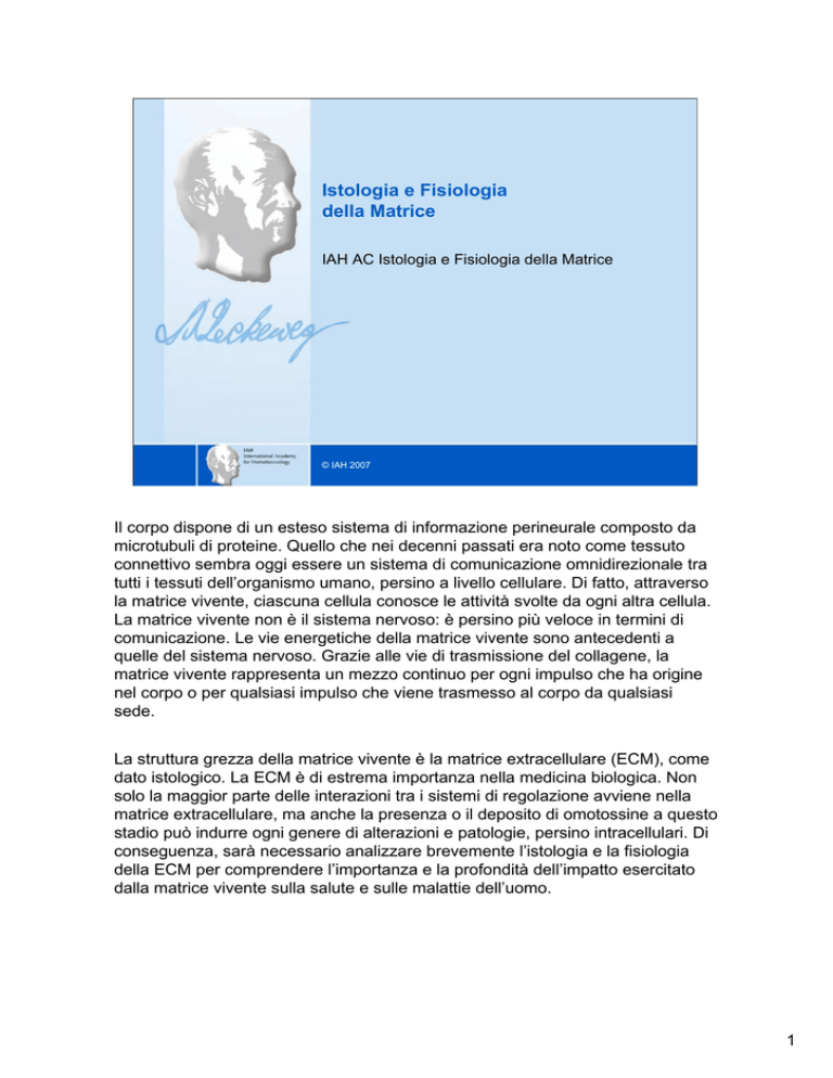 Istologia e Fisiologia della Matrice IAH AC Istologia e Fisiologia della Matrice © IAH 2007 Il corpo dispone di un esteso sistema di informazione perineurale composto da microtubuli di proteine. Quello che nei decenni passati era noto come tessuto connettivo sembra oggi essere un sistema di comunicazione omnidirezionale tra tutti i tessuti dell’organismo umano, persino a livello cellulare. Di fatto, attraverso la matrice vivente, ciascuna cellula conosce le attività svolte da ogni altra cellula. La matrice vivente non è il sistema nervoso: è persino più veloce in termini di comunicazione. Le vie energetiche della matrice vivente sono antecedenti a quelle del sistema nervoso. Grazie alle vie di trasmissione del collagene, la matrice vivente rappresenta un mezzo continuo per ogni impulso che ha origine nel corpo o per qualsiasi impulso che viene trasmesso al corpo da qualsiasi sede. La struttura grezza della matrice vivente è la matrice extracellulare (ECM), come dato istologico. La ECM è di estrema importanza nella medicina biologica. Non solo la maggior parte delle interazioni tra i sistemi di regolazione avviene nella matrice extracellulare, ma anche la presenza o il deposito di omotossine a questo stadio può indurre ogni genere di alterazioni e patologie, persino intracellulari. Di conseguenza, sarà necessario analizzare brevemente l’istologia e la fisiologia della ECM per comprendere l’importanza e la profondità dell’impatto esercitato dalla matrice vivente sulla salute e sulle malattie dell’uomo. 1 Nozioni fondamentali 1. 2. 3. 4. Istologia della matrice extracellulare (ECM) Fisiologia della matrice extracellulare La matrice intracellulare La matrice nucleare © IAH 2007 2 Dal momento in cui il fisiologo francese Claude Bernard postulò il suo “ambiente interno”, nel 19° secolo, si spalancò un nuovo mondo per il campo dell’istologia e della fisiologia. Oggi si parla di realtà istologica della matrice extracellulare e persino nella moderna medicina complementare si tende a citare la matrice vivente, un’altra dimensione in fatto di comprensione fisiologica del corpo umano. La matrice vivente è costituita da tre livelli che si compenetrano l’uno l’altro: la matrice extracellulare, la matrice intracellulare e la matrice nucleare. Non solo, a ciascun livello della matrice si osservano interazioni relative a impulsi vibranti, segnali elettrici e scambi di mediatori. I 3 livelli interagiscono e si influenzano l’un l’altro nei loro confini fisico-anatomici. Ciò significa che qualsiasi alterazione avvenga al di fuori della cellula (nella matrice extracellulare) potrebbe avere una conseguenza intracellulare o persino intranucleare e viceversa. Anche se composta da 3 diversi livelli, la matrice vivente è un sistema interattivo coerente. Oltre a queste interessanti caratteristiche di comunicazione interattiva tra i diversi livelli della matrice vivente, l’istologia e la fisiologia della matrice extracellulare sono particolarmente importanti per comprendere il terreno d’azione della medicina omotossicologica. L’obiettivo della lezione è comprendere la matrice e sapere intervenire su di essa con la terapia di regolazione. 2 Perché è importante studiare la matrice? • Ambiente idrofilico della cellula • Struttura elettricamente carica • Capacità di rigenerazione • Sistema informativo complesso • Deposito di omotossine © IAH 2007 3 Esistono cinque buoni motivi per studiare la matrice nell’ambito della medicina omotossicologica: 1. L’intera matrice, a causa di una elevata concentrazione di proteoglicani, diventa idrofilica. Come vedremo ulteriormente in dettaglio, questo ambiente idrofilico della cellula facilita il trasporto delle sostanze ma al tempo stesso facilita la permanenza e il deposito delle tossine idrosolubili nella matrice. 2. La carica elettrica dei proteoglicani è negativa. Questo permette alle omotossine positivamente cariche di aderire e rimanere nella struttura della ECM. La carica elettrica riveste anche un ruolo cruciale per il flusso di elettroni nella matrice. 3. Grazie alla presenza dei fibroblasti, la struttura della matrice può essere riparata in pochi minuti dopo una lesione. Il fibroblasto svolge un ruolo essenziale nella protezione della cellula vivente ripristinando continuamente la struttura reticolare tridimensionale che la circonda. 4. Gran parte delle comunicazioni interattive tra i diversi sistemi di autoregolazione avviene nella matrice e comprende complessi circuiti di feedback dei mediatori, controllo del pH, controllo del potenziale elettrico, ecc. 5. La capacità di trattenere le omotossine lontano dalla cellula è una caratteristica positiva della matrice che può causare problemi a lungo termine se quelle stesse omotossine non vengono drenate dalla matrice ed eliminate. In realtà, notiamo che molte patologie sono riconducibili a un deposito di omotossine nella ECM e all’effetto negativo esercitato da queste omotossine sul funzionamento della cellula. 3 1. Istologia della ECM © IAH 2007 Guardiamo ora più da vicino l’istologia della matrice extracellulare. Quali sono le sue componenti? 4 Grazie a H. Heine © IAH 2007 5 Ad eccezione dell’ameba e di altri organismi monocellulari che hanno un contatto diretto con l’ambiente esterno, tutti gli altri organismi pluricellulari sono provvisti di un’area di protezione cellulare tra l’ambiente esterno e le cellule, a prescindere dalla loro posizione nell’organismo e dal loro compito. Quest’area di protezione cellulare è denominata spazio extracellulare e non consente a nessuna sostanza di passare direttamente dall’ambiente esterno alla cellula. La cellula vivente, sia che faccia parte di una struttura organica, e sia innestata su una membrana basale, sia che agisca singolarmente rispetto alle altre cellule della struttura, sarà sempre circondata dalla matrice. Questa matrice è un sottile filtro biofisico strutturato, tridimensional