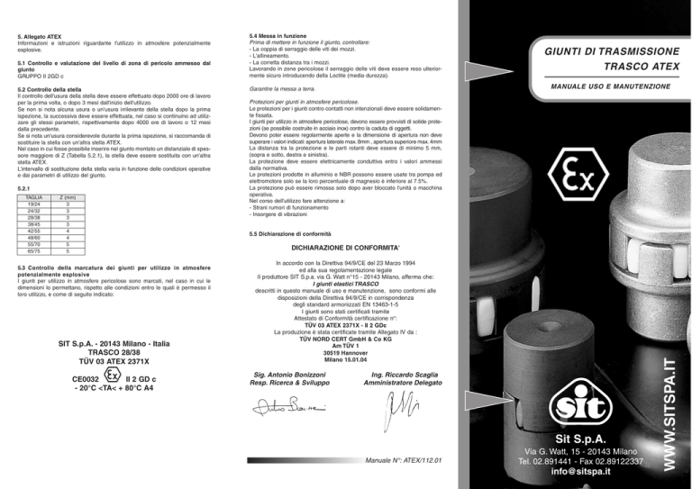 5.1 Controllo e valutazione del livello di zona di pericolo ammesso dal giunto GRUPPO II 2GD c 5.2 Controllo della stella Il controllo dell'usura della stella deve essere effettuato dopo 2000 ore di lavoro per la prima volta, o dopo 3 mesi dall'inizio dell'utilizzo. Se non si nota alcuna usura o un'usura irrilevante della stella dopo la prima ispezione, la successiva deve essere effettuata, nel caso si continuino ad utilizzare gli stessi parametri, rispettivamente dopo 4000 ore di lavoro o 12 mesi dalla precedente. Se si nota un'usura considerevole durante la prima ispezione, si raccomanda di sostituire la stella con un'altra stella ATEX. Nel caso in cui fosse possibile inserire nel giunto montato un distanziale di spessore maggiore di Z (Tabella 5.2.1), la stella deve essere sostituita con un'altra stella ATEX. L'intervallo di sostituzione della stella varia in funzione delle condizioni operative e dai parametri di utilizzo del giunto. 5.2.1 TAGLIA 19/24 24/32 28/38 38/45 42/55 48/60 55/70 65/75 Z (mm) 3 3 3 3 4 4 5 5 5.3 Controllo della marcatura dei giunti per utilizzo in atmosfere potenzialmente esplosive I giunti per utilizzo in atmosfere pericolose sono marcati, nel caso in cui le dimensioni lo permettano, rispetto alle condizioni entro le quali è permesso il loro utilizzo, e come di seguito indicato: SIT S.p.A. - 20143 Milano - Italia TRASCO 28/38 TÜV 03 ATEX 2371X CE0032 II 2 GD c - 20°C <TA< + 80°C A4 5.4 Messa in funzione Prima di mettere in funzione il giunto, controllare: - La coppia di serraggio delle viti dei mozzi. - L'allineamento. - La corretta distanza tra i mozzi. Lavorando in zone pericolose il serraggio delle viti deve essere reso ulteriormente sicuro introducendo della Loctite (media durezza). GIUNTI DI TRASMISSIONE TRASCO ATEX MANUALE USO E MANUTENZIONE Garantire la messa a terra. Protezioni per giunti in atmosfere pericolose. Le protezioni per i giunti contro contatti non intenzionali deve essere solidamente fissata. I giunti per utilizzo in atmosfere pericolose, devono essere provvisti di solide protezioni (se possibile costruite in acciaio inox) contro la caduta di oggetti. Devono poter essere regolarmente aperte e la dimensione di apertura non deve superare i valori indicati: apertura laterale max. 8mm , apertura superiore max. 4mm La distanza tra la protezione e le parti rotanti deve essere di minimo 5 mm, (sopra e sotto, destra e sinistra). La protezione deve essere elettricamente conduttiva entro i valori ammessi dalla normativa. Le protezioni prodotte in alluminio e NBR possono essere usate tra pompa ed elettromotore solo se la loro percentuale di magnesio è inferiore al 7.5%. La protezione può essere rimossa solo dopo aver bloccato l'unità o macchina operativa. Nel corso dell'utilizzo fare attenzione a: - Strani rumori di funzionamento - Insorgere di vibrazioni 5.5 Dichiarazione di conformità DICHIARAZIONE DI CONFORMITA' In accordo con la Direttiva 94/9/CE del 23 Marzo 1994 ed alla sua regolamentazione legale Il produttore SIT S.p.a. via G. Watt n°15 - 20143 Milano, afferma che: I giunti elastici TRASCO descritti in questo manuale di uso e manutenzione, sono conformi alle disposizioni della Direttiva 94/9/CE in corrispondenza degli standard armonizzati EN 13463-1-5 I giunti sono stati certificati tramite Attestato di Conformità certificazione n°: TÜV 03 ATEX 2371X - II 2 GDc La produzione è stata certificate tramite Allegato IV da : TÜV NORD CERT GmbH & Co KG Am TÜV 1 30519 Hannover Milano 15.01.04 Sig. Antonio Bonizzoni Resp. Ricerca & Sviluppo Ing. Riccardo Scaglia Amministratore Delegato Sit S.p.A. Manuale N°: ATEX/112.01 Via G. Watt, 15 - 20143 Milano Tel. 02.891441 - Fax 02.89122337 info@sitspa.it WWW.SITSPA.IT 5. Allegato ATEX Informazioni e istruzioni riguardante l'utilizzo in atmosfere potenzialmente esplosive. Il giunto TRASCO è un giunto elastico omocinetico che permette di compensare disallineamenti angolari, radiali e assiali. INDICE 1. Caratteristiche tecniche 1.1 Descrizione 1.2 Mozzi 1.3 Anello dentato 2. Informazioni 2.1 Informazioni generali 2.2 Uso corretto 2.3 Prestazioni 3. Immagazzinamento 4. Assemblaggio 4.1 Elenco componenti 4.2 Lavorazione dei mozzi 4.3 Posizione e misura del grano per pressione 4.4 Assemblaggio del giunto 4.5 Disallineamenti dei giunti 5. Allegato ATEX Istruzioni ed informazioni riguardanti l'utilizzo del giunto in zone con atmosfere potenzialmente esplosive. 5.1 Controllo e valutazione del livello di zona di pericolo ammesso dal giunto 5.2 Controllo della stella 5.3 Controllo della marcatura del giunto per utilizzo in atmosfere potenzialmente esplosive 5.4 Messa in funzione 5.5 Dichiarazione di conformità 1.1 Descrizione Il giunto TRASCO è il giunto elastico ed omocinetico che nella categoria assicura le massime prestazioni a parità d'ingombro. Risulta essere infatti molto compatto e permette una sicura trasmissione del moto fra motore e macchina condotta, assorbendo urti e vibrazioni torsionali. Il giunto TRASCO permette inoltre, tramite la deformazione elastica dell'anello dentato, di compensare disallineamenti angolari, radiali, piccole variazioni di lunghezza degli alberi. I profili dei denti del mozzo e dell'anello elastico sono studiati in modo da ottenere una distribuzione uniforme della pressione. Gli sforzi a cui è soggetto l'elemento elastico sono solo di compressione e non inducono forze assiali o radiali, conferendo al giunto TRASCO grande capacità di carico e durata. Il montaggio del giunto può essere sia orizzontale sia verticale e sopporta bene variazioni ed inversioni di carico. 1.2 Mozzi Il giunto TRASCO è costituito da due mozzi metallici che presentano delle cavità a sezione circolare che ospitano i denti della corona elastica. Il materiale dei mozzi di serie è ghisa G25 o alluminio. I giunti TRASCO vengono costruiti nella serie "base"in due versioni:"S" e precisa "P", la serie per bussola è solo in esecuzione precisa.I mozzi in esecuzione "P" hanno la sede dell'elemen
