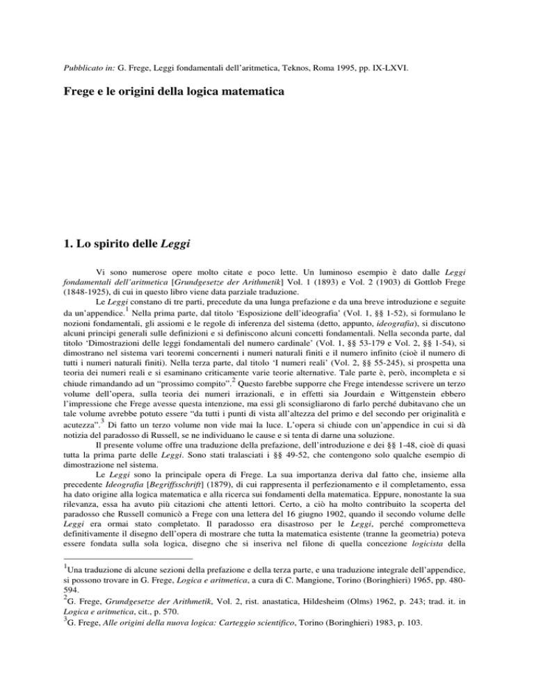 Pubblicato in: G. Frege, Leggi fondamentali dell’aritmetica, Teknos, Roma 1995, pp. IX-LXVI. Frege e le origini della logica matematica 1. Lo spirito delle Leggi Vi sono numerose opere molto citate e poco lette. Un luminoso esempio è dato dalle Leggi fondamentali dell’aritmetica [Grundgesetze der Arithmetik] Vol. 1 (1893) e Vol. 2 (1903) di Gottlob Frege (1848-1925), di cui in questo libro viene data parziale traduzione. Le Leggi constano di tre parti, precedute da una lunga prefazione e da una breve introduzione e seguite 1 da un’appendice. Nella prima parte, dal titolo ‘Esposizione dell’ideografia’ (Vol. 1, §§ 1-52), si formulano le nozioni fondamentali, gli assiomi e le regole di inferenza del sistema (detto, appunto, ideografia), si discutono alcuni principi generali sulle definizioni e si definiscono alcuni concetti fondamentali. Nella seconda parte, dal titolo ‘Dimostrazioni delle leggi fondamentali del numero cardinale’ (Vol. 1, §§ 53-179 e Vol. 2, §§ 1-54), si dimostrano nel sistema vari teoremi concernenti i numeri naturali finiti e il numero infinito (cioè il numero di tutti i numeri naturali finiti). Nella terza parte, dal titolo ‘I numeri reali’ (Vol. 2, §§ 55-245), si prospetta una teoria dei numeri reali e si esaminano criticamente varie teorie alternative. Tale parte è, però, incompleta e si 2 chiude rimandando ad un “prossimo compito”. Questo farebbe supporre che Frege intendesse scrivere un terzo volume dell’opera, sulla teoria dei numeri irrazionali, e in effetti sia Jourdain e Wittgenstein ebbero l’impressione che Frege avesse questa intenzione, ma essi gli sconsigliarono di farlo perché dubitavano che un tale volume avrebbe potuto essere “da tutti i punti di vista all’altezza del primo e del secondo per originalità e 3 acutezza”. Di fatto un terzo volume non vide mai la luce. L’opera si chiude con un’appendice in cui si dà notizia del paradosso di Russell, se ne individuano le cause e si tenta di darne una soluzione. Il presente volume offre una traduzione della prefazione, dell’introduzione e dei §§ 1-48, cioè di quasi tutta la prima parte delle Leggi. Sono stati tralasciati i §§ 49-52, che contengono solo qualche esempio di dimostrazione nel sistema. Le Leggi sono la principale opera di Frege. La sua importanza deriva dal fatto che, insieme alla precedente Ideografia [Begriffsschrift] (1879), di cui rappresenta il perfezionamento e il completamento, essa ha dato origine alla logica matematica e alla ricerca sui fondamenti della matematica. Eppure, nonostante la sua rilevanza, essa ha avuto più citazioni che attenti lettori. Certo, a ciò ha molto contribuito la scoperta del paradosso che Russell comunicò a Frege con una lettera del 16 giugno 1902, quando il secondo volume delle Leggi era ormai stato completato. Il paradosso era disastroso per le Leggi, perché comprometteva definitivamente il disegno dell’opera di mostrare che tutta la matematica esistente (tranne la geometria) poteva essere fondata sulla sola logica, disegno che si inseriva nel filone di quella concezione logicista della 1 Una traduzione di alcune sezioni della prefazione e della terza parte, e una traduzione integrale dell’appendice, si possono trovare in G. Frege, Logica e aritmetica, a cura di C. Mangione, Torino (Boringhieri) 1965, pp. 480594. 2 G. Frege, Grundgesetze der Arithmetik, Vol. 2, rist. anastatica, Hildesheim (Olms) 1962, p. 243; trad. it. in Logica e aritmetica, cit., p. 570. 3 G. Frege, Alle origini della nuova logica: Carteggio scientifico, Torino (Boringhieri) 1983, p. 103. matematica le cui origini risalgono almeno a Leibniz. In particolare, secondo Leibniz, il principio di contraddizione o di identità sarebbe bastato da solo “a dimostrare tutta l’aritmetica e tutta la geometria, cioè 4 tutti i principi matematici”. Col principio di contraddizione soltanto, però, ben difficilmente si sarebbe potuto realizzare il disegno logicista, e nelle Leggi Frege si propone di determinare quali principi logici aggiuntivi sarebbero necessari per farlo. Il fallimento del suo tentativo non spiega del tutto la scarsa frequentazione dell’opera, che contrasta col vivo interesse che, invece, specie nell’ambito della cultura anglosassone, hanno riscosso e continuano a riscuotere altre opere di Frege, come I fondamenti dell’aritmetica [Die Grundlagen der Arithmetik] (1884), che pure si iscrivono nel suo disegno logicista. Forse la spiegazione più plausibile sta nel fatto che, mentre altre opere di Frege sembrano presentare più valenze, le Leggi sono così essenzialmente e indissolubilmente legate al disegno logicista che non si prestano agevolmente ad altre letture, anche se non mancano, come vedremo, tentativi di leggere diversamente alcuni paragrafi dell’opera. Va subito chiarito, però, che nelle Leggi il disegno logicista non era fine a sé stesso ma era solo un mezzo per raggiungere una finalità epistemologica più generale, cioè quella di “confutare i dubbi sulla validità 5 della nostra conoscenza matematica”. La responsabilità di tali dubbi viene individuata da Frege in perfetta sintonia con le coeve denunce di Cantor. In una recensione, peraltro parzialmente critica, a un lavoro di quest’ultimo, Frege dichiara di poter ripetere, “con piena approvazione, una frase dell’autore: ‘Così vediamo la potente scepsi accademico-positivistica ora imperante in Germania, finalmente giunta anche all’aritmetica, dove sembra trarre le ultime conseguenze che ancora le sono possibili, con il risultato più clamoroso e forse per lei 6 medesima più fatale’. Proprio così!”. Parlando di scepsi accademico-positivistica Cantor intende riferirsi in particolare a Kronecker e a Helmholtz. Kronecker proclamava, contro Weierstrass e Cantor, che le grandezze irrazionali e continue andavano eliminate dalla matematica e che l’uso dell’infinito attuale era infondato. Secondo lui tutte le discipline matematiche, a