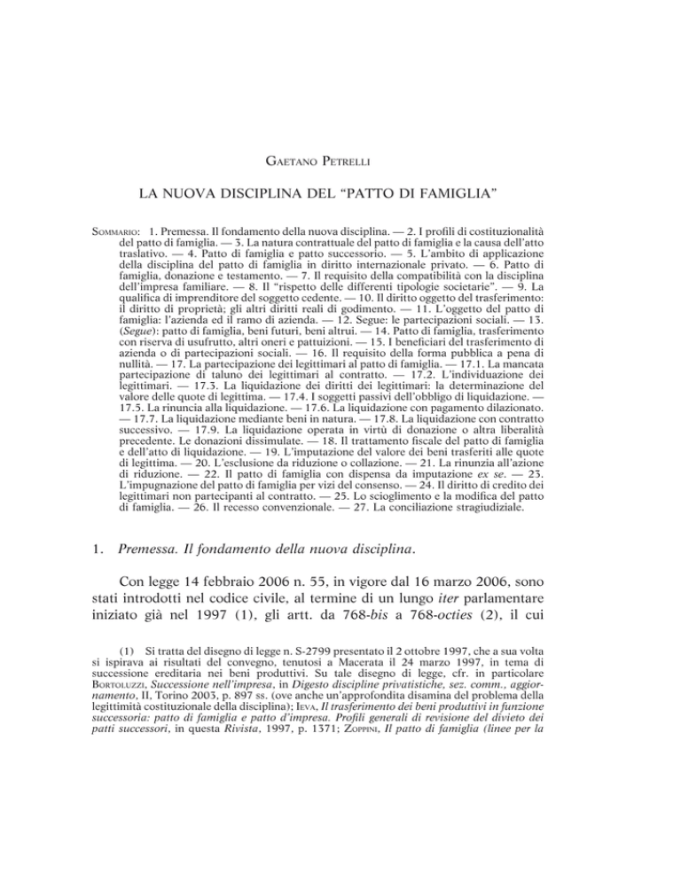 GAETANO PETRELLI LA NUOVA DISCIPLINA DEL “PATTO DI FAMIGLIA” SOMMARIO: 1. Premessa. Il fondamento della nuova disciplina. — 2. I profili di costituzionalità del patto di famiglia. — 3. La natura contrattuale del patto di famiglia e la causa dell’atto traslativo. — 4. Patto di famiglia e patto successorio. — 5. L’ambito di applicazione della disciplina del patto di famiglia in diritto internazionale privato. — 6. Patto di famiglia, donazione e testamento. — 7. Il requisito della compatibilità con la disciplina dell’impresa familiare. — 8. Il “rispetto delle differenti tipologie societarie”. — 9. La qualifica di imprenditore del soggetto cedente. — 10. Il diritto oggetto del trasferimento: il diritto di proprietà; gli altri diritti reali di godimento. — 11. L’oggetto del patto di famiglia: l’azienda ed il ramo di azienda. — 12. Segue: le partecipazioni sociali. — 13. (Segue): patto di famiglia, beni futuri, beni altrui. — 14. Patto di famiglia, trasferimento con riserva di usufrutto, altri oneri e pattuizioni. — 15. I beneficiari del trasferimento di azienda o di partecipazioni sociali. — 16. Il requisito della forma pubblica a pena di nullità. — 17. La partecipazione dei legittimari al patto di famiglia. — 17.1. La mancata partecipazione di taluno dei legittimari al contratto. — 17.2. L’individuazione dei legittimari. — 17.3. La liquidazione dei diritti dei legittimari: la determinazione del valore delle quote di legittima. — 17.4. I soggetti passivi dell’obbligo di liquidazione. — 17.5. La rinuncia alla liquidazione. — 17.6. La liquidazione con pagamento dilazionato. — 17.7. La liquidazione mediante beni in natura. — 17.8. La liquidazione con contratto successivo. — 17.9. La liquidazione operata in virtù di donazione o altra liberalità precedente. Le donazioni dissimulate. — 18. Il trattamento fiscale del patto di famiglia e dell’atto di liquidazione. — 19. L’imputazione del valore dei beni trasferiti alle quote di legittima. — 20. L’esclusione da riduzione o collazione. — 21. La rinunzia all’azione di riduzione. — 22. Il patto di famiglia con dispensa da imputazione ex se. — 23. L’impugnazione del patto di famiglia per vizi del consenso. — 24. Il diritto di credito dei legittimari non partecipanti al contratto. — 25. Lo scioglimento e la modifica del patto di famiglia. — 26. Il recesso convenzionale. — 27. La conciliazione stragiudiziale. 1. Premessa. Il fondamento della nuova disciplina. Con legge 14 febbraio 2006 n. 55, in vigore dal 16 marzo 2006, sono stati introdotti nel codice civile, al termine di un lungo iter parlamentare iniziato già nel 1997 (1), gli artt. da 768-bis a 768-octies (2), il cui (1) Si tratta del disegno di legge n. S-2799 presentato il 2 ottobre 1997, che a sua volta si ispirava ai risultati del convegno, tenutosi a Macerata il 24 marzo 1997, in tema di successione ereditaria nei beni produttivi. Su tale disegno di legge, cfr. in particolare BORTOLUZZI, Successione nell’impresa, in Digesto discipline privatistiche, sez. comm., aggiornamento, II, Torino 2003, p. 897 ss. (ove anche un’approfondita disamina del problema della legittimità costituzionale della disciplina); IEVA, Il trasferimento dei beni produttivi in funzione successoria: patto di famiglia e patto d’impresa. Profili generali di revisione del divieto dei patti successori, in questa Rivista, 1997, p. 1371; ZOPPINI, Il patto di famiglia (linee per la 402 Rivista del notariato - LX contenuto costituisce oggetto del presente lavoro. Si tratta di una disciplina profondamente innovativa, che deroga parzialmente al divieto dei patti successori, contenuto nell’art. 458 c.c.: disposizione, quest’ultima, che è stata anch’essa modificata dalla legge in commento, facendo salvo per l’appunto quanto disposto dagli artt. 768-bis e seguenti. L’art. 768-bis c.c. contiene la definizione di patto di famiglia, qualificato come il contratto con cui “l’imprenditore trasferisce, in tutto o in parte, l’azienda, e il titolare di partecipazioni societarie trasferisce, in tutto o in parte, le proprie quote, a uno o più discendenti”. L’essenza del patto di famiglia non risiede, peraltro, in tale vicenda traslativa inter vivos, realizzabile evidentemente anche prima ed a prescindere dalle norme in esame; quanto piuttosto nella disciplina dettata dai successivi articoli, che prevedono — a fronte della “liquidazione” dei legittimari da effettuarsi con lo stesso o con successivo contratto — il non assoggettamento a collazione e riduzione della liberalità effettuata al discendente; realizzando conseguentemente un particolare “effetto di stabilità” del trasferimento dell’azienda o delle partecipazioni sociali. La “stabilità” e “non aleatorietà” del trasferimento è funzionale ad agevolare il “passaggio generazionale” delle piccole e medie imprese — considerato quale obiettivo importante nel contesto del più generale fine della “competitività” del sistema imprenditoriale italiano — allo scopo di assicurare “continuità all’impresa” e “funzionalità futura” all’azienda, e di evitare la successiva “frammentazione del controllo”, che frequentemente si riverbera sull’efficienza della gestione imprenditoriale (3). Si è infatti evidenziato che “in un tessuto socioeconomico, come quello italiano, contraddistinto dalla massima proliferazione di piccole imprese a carattere individuale, la successione nei beni produttivi evoca immediatamente l’idea riforma dei patti sulle successioni future), in Riv. dir. priv., 1998, p. 255. Cfr. anche, sulla medesima problematica, SCHLESINGER, Interessi dell’impresa e interessi familiari nella vicenda successoria, in La trasmissione familiare della ricchezza. Limiti e prospettive di riforma del sistema successorio, Padova 1995, p. 131. Diverse soluzioni adottate con la normativa in commento risentono dell’in