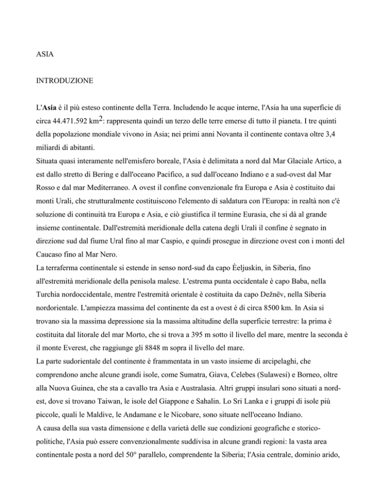 L'Asia è il più esteso continente della Terra. Includendo le acque interne, l'Asia ha una superficie di