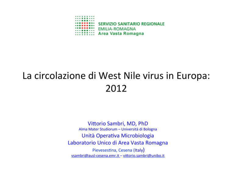 La circolazione di West Nile virus in Europa: 2012 Vi:orio Sambri, MD, PhD Alma Mater Studiorum – Università di Bologna Unità OperaJva Microbiologia Laboratorio Unico di Area Vasta Romagna PievesesJna, Cesena (Italy) vsambri@ausl-­‐cesena.emr.it – vi:orio.sambri@unibo.it Overview • Il virus • La diffusione geografica di WNV • Epidemiologia in Europa • Epidemiologia in Italia vi:orio sambri_WNV_RER 2013 2 West Nile virus -­‐ WNV • Flavivirus trasmesso da zanzare • ApparJene al gruppo anJgenico del JEV • Isolato nel 1937 a Omogo (West Nile – Uganda) • Neurotropico nei mammiferi • Diffuso in tu:o il mondo • 6 lineage geneJci vi:orio sambri_WNV_RER 2013 3 Genoma WNV • 11 kb +ssRNA • 3 geni stru:urali e 7 NS • 1 singola poliproteina vi:orio sambri_WNV_RER 2013 4 Ciclo biologico WNV vi:orio sambri_WNV_RER 2013 5 WNV Trasmissione all’Uomo • Zanzare • Incidente di laboratorio • Trasfuzioni di sangue e SOT • • Transplacentare Latte materno 6 vi:orio sambri_WNV_RER 2013 7 Flamingo Nat’l Park, FL. 2010 vi:orio sambri_WNV_RER 2013 8 Clinical Epidemiology of WNV infection in humans E n c e p h a l i J s (meningoencephaliJs) f e v e r , w e a k n e s s , h e a d a c h e , m y a l g i a , nausea, vomiJng ( 3 – 6 gg.) Incubation period: 3-14 days vi:orio sambri_WNV_RER 2013 9 Euro Surveill. 2010;15(34):pii=19644 vi:orio sambri_WNV_RER 2013 10 WNV Europa 2012 vi:orio sambri_WNV_RER 2013 11 WNV Europa 2010/12 vi:orio sambri_WNV_RER 2013 12 WNV Ro:e di migrazione vi:orio sambri_WNV_RER 2013 13 Storia della diffusione in Europa e bacino mediterraneo • • • • Fino a metà anni 90: casi sporadici 1994 Algeria 1996 Romania (393 casi/17 morJ) 1999 Russia (316 casi/40 morJ) – 1999-­‐2010 • 928 Volgograd • 322 Astrackan • 40 Rostov • • • • 1998/2000 Italia e Francia (cavalli) 2008 Italia (ER: uomo e cavalli) 2010 Spagna (uomo e cavalli) 2010/2011: Balcani (Grecia, Serbia, FYRM, Montenegro, Croazia, Kosovo) vi:orio sambri_WNV_RER 2013 14 WNV Europa 2012 Conferma, Sospe/ Grecia 44 161 Ungheria 7 12 Italia 39 50 Romania 13 14 Algeria 1 1 Croazia 3 5 FYRM 1 6 Israele 31 59 Kosovo 0 4 Montenegro 0 1 OPT 1 1 Russia ND 447 Serbia 41 70 Tunisia 33 63 Ucraina ND 12 TOTALE 214 906 West Nile virus in Europe: emergence, epidemiology, diagnosis, treatment, preven,on. vi:orio sambri_WNV_RER 2013 V. Sambri et al. CMI 2013, in press ecd.europa.eu/en/healthtopics/west_nile_fever_maps/pages/index.asp Paese 15 Eterogeneità filogeneJca Heterogeneity of West Nile virus genotype 1a in Italy, 2011 Giada Rossini, Fabrizio Carletti,Roberto Rigoli, Sandro Piga,Patrizia Bagnarelli, Paolo Gaibani, Anna Pierro, Alessandro Nanni Costa, Paolo Grossi, Giuseppe Ippolito, Maria Paola Landini, Antonino Di Caro, Maria Rosaria Capobianchi and Vittorio Sambri Journal of General Virology (2013) WNV “Livenza” (lineage 1°) 2011 Barzon et al.2012 vi:orio sambri_WNV_RER 2013 16 Il “problema” WNV Lineage 2 Explosive spread of a neuroinvasive lineage 2 West Nile virus in Central Europe, 2008/2009. Bakony et al., Veterinary Microbiology. 2013 Ungheria 2004 ≅ Grecia 2010 (99.6%) vi:orio sambri_WNV_RER 2013 Russia: 2004, 2007, 2010 17 Grecia • 2010: o o o o o 6 Luglio / 5 O:obre 11 prefe:ure (incidenza 15/100.000) 197 WNND (WNF ?) Età media 72 (12-­‐88) 17% fatality rate • 2011: o 13 prefe:ure o 75 WNND o 10% fatality rate • 2012: o 2 aree principali (Atene – Xanthi e Kavala) o 109 WNND/52 WNF o 16% fatality rate vi:orio sambri_WNV_RER 2013 18 Provincia Conferma, Sospe/ Data prima no,fica Gorizia 1 1 27 se:embre Matera 1 1 31 o:obre Oristano 2 2 19 se:embre Padova 0 1 4 o:obre Pordenone 2 2 27 se:embre Treviso 6 7 31 agosto Udine 1 1 31 o:obre Venezia 24 33 7 agosto Vicenza 2 2 7 se:embre vi:orio sambri_WNV_RER 2013 ecd.europa.eu/en/healthtopics/west_nile_fever_maps/pages/index.asp WNV Italia 2012 19 Seroprevalence of West Nile virus anJbodies in blood donors living in the metropolitan area of Milan, Italy, 2009-­‐2011 Gaibani et al., NEW MICROBIOLOGICA, 36, 81-­‐83, 2013 A seroprevalence study for anJ-­‐West Nile virus-­‐specific anJbodies was carried out in healthy blood donors resident in the metropolitan area of Milan in two different years, 2009 and 2011. In 2009 no posiJve sera were found, where-­‐ as 5 posiJve sera were found in 2011, revealing viral circulaJon in this naive area. The seroprevalence rate idenJfied in 2011 was 0.57%, suggesJng that the area of WNV circulaJon in Italy is larger than that previously idenJfied. vi:orio sambri_WNV_RER 2013 20 Sardegna 2011/2012 West Nile Virus outbreak in Sardinia, Italy, in 2011 Spissu et al. J Infect Dev Ctries 2013; 7(1):006-­‐009. WNND: • Uomo 4 (2 decessi); Cavallo 91 (0 decessi) West Nile virus lineage 2 in Sardinian wild birds in 2012: a further threat to public health Savini et al. Epidemiol. Infect., 2103. • Lineage 2 in 3 uccelli (Olbia e Centro Sardegna) • Variazioni aminoacidiche in 2/3 (diverse da Grecia 2010 e Ungheria 2004) vi:orio sambri_WNV_RER 2013 21 vi:orio sambri_WNV_RER 2013 22 USUv 2013 Detec,on of Usutu virus infec,on in a healthy blood donor from south-­‐west Germany, 2012. Allering L, Jöst H, Emmerich P, Günther S, LaIwein E, Schmidt M, Seifried E, Sambri V, Hourfar K, Schmidt-­‐Chanasit J. Euro Surveill. 2012 Mosquito, bird and human surveillance of West Nile and Usutu viruses in Emilia-­‐Romagna Region (Italy) in 2010. Calzolari M, Gaibani P, Bellini R, Defilippo F, Pierro A, Albieri A, Maioli G,Luppi A, Rossini G, Balzani A, Tamba M, GalleT G, GelaU A, Carrieri M,Poglayen G, Cavrini F, Natalini S, DoIori M, Sambri V, Angelini P, Bonilauri P. PLoS One. 2012. Detec,on of Usutu-­‐virus-­‐specific IgG in blood donors from northern Italy. Gaibani P, Pierro A, Alicino R, Rossini G, Cavrini F, Landini MP, Sambri V. Vector Borne ZoonoJc Dis. 2012 Detec,on of specific an,bodies against West Nile and Usutu viruses in healthy blood donors in Nort