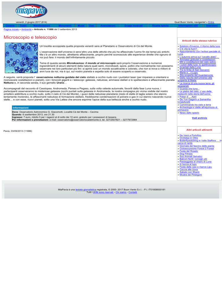 venerdì, 2 giugno 2017 (614) Cinema Teatri Manifestazioni Qual Buon Vento, navigante! » Entra Monumenti Musei Oasi Associazioni Gruppi musicali Ricette tipiche Informazioni utili Inserzioni Pagina inziale » Ambiente » Articolo n. 11886 del 3 settembre 2013 Microscopio e telescopio Articoli della stessa rubrica Un’insolita accoppiata quella proposta venerdì sera al Planetario e Osservatorio di Cà del Monte. L’osservazione dell’universo è senz’altro una delle attività che più ha affascinato l’uomo fin dai tempi più antichi. Ma c’è un altro mondo, altrettanto affascinante, proprio perché sconosciuto alle esperienze dirette che ognuno di noi può fare: il mondo dell’infinitamente piccolo. Tema di questa serata Microkosmos: il mondo al microscopio sarà proprio l’osservazione a numerosi ingrandimenti di alcuni elementi della natura quali semi, microfossili, spore, pollini che normalmente non possiamo osservare nei loro particolari più fini: si aprirà così un mondo accattivante e colorato, che non si trova a milioni di anni luce da noi, ma è qui, sul nostro pianeta e aspetta solo di essere scoperto e osservato. A seguire, verrà proposta l’ osservazione notturna guidata del cielo stellato a occhio nudo con i puntatori laser (per imparare a orientarsi e riconoscere costellazioni e pianeti), con i binocoli giganti e i telescopi: galassie, nebulose, ammassi stellari e lo spettacolare e affascinante pianeta Nettuno e, in seconda serata, il suo gemello Urano… Accompagnati dal racconto di Cassiopea, Andromeda, Perseo e Pegaso, sulla volta celeste autunnale, favoriti dalla fase Luna nuova, i partecipanti osserveranno le misteriose galassie (occhi puntati sulla galassia in Andromeda, la nostra compagna più vicina visibile dal nostro emisfero addirittura a occhio nudo, sotto il cielo di Cà del Monte), i gusci delle nebulose planetarie (resto di stelle di taglia solare che stanno lentamente morendo), le affascinanti nebulose di formazione stellare, freddissime condensazioni di polvere e gas in cui stanno nascendo nuove stelle… e con esse, nuovi pianeti, sotto una Via Lattea che ancora esprime l’apice della sua bellezza anche a occhio nudo. Informazioni Dove: Osservatorio Astronomico G. Giacomotti, Località Cà del Monte – Cecima Quando: 6 ssettembre 2013, ore 21.30 Ingresso: 7 euro, ridotto 5 per i ragazzi al di sotto dei 10 anni, gratuito per i possessori di tessera. Per informazioni e prenotazioni: e-mail: osservatorio@osservatoriocadelmonte.it, tel. 327/2507821 – 327/7672984 » Solstizio d'inverno, il ritorno della luce » C’è vita la fuori? » Appuntamento con l’eclissi parziale di Luna » L’autunno arriva sul “cavallo alato” » Ammassi globulari e costellazioni » Miti e costellazioni del cielo estivo » I colori della luce: lo spettroscopio » Incantati dalla Luna » Tra le Erbe di San Giovanni » Marte e... il Lupo » Alla scoperta del Guardamonte » Dalla nascita dell'universo alla scoperta di Marte » La ricerca di una nuova terra: gli esopianeti » Guarda che luna… » Le pietre del cielo. L’uso delle meteoriti nella storia dell’uomo » Poker d’… Astri » Da Yuri Gagarin a Samantha Cristoforetti » Camminando tra cielo e terra » Archeologia e stelle all’equinozio di primavera » News dallo spazio Vedi archivio Altri articoli attinenti Pavia, 03/09/2013 (11886) » Da Varzi a Portofino » Orchidee in Oltre » Butterflywatching in Valle Staffora…. In cerca di rarità » Giornata del fascino delle piante » Cicloescursione Forest 2 Forest » Festa del Roseto » Dog Fitness » Sos Animali Selvatici » Balconi fioriti: consigli utili » Passeggiata al chiaro di Luna » In bocca al lupo » Festa delle oasi e riserve Lipu » Caccia alle Uova » Sabato con Shanti » Mostra dei Pelargoni MiaPavia è una testata giornalistica registrata, © 2000- 2017 Buon Vento S.r.l. - P.I. IT01858930181 Tutti i diritti sono riservati - Chi siamo - Contatti