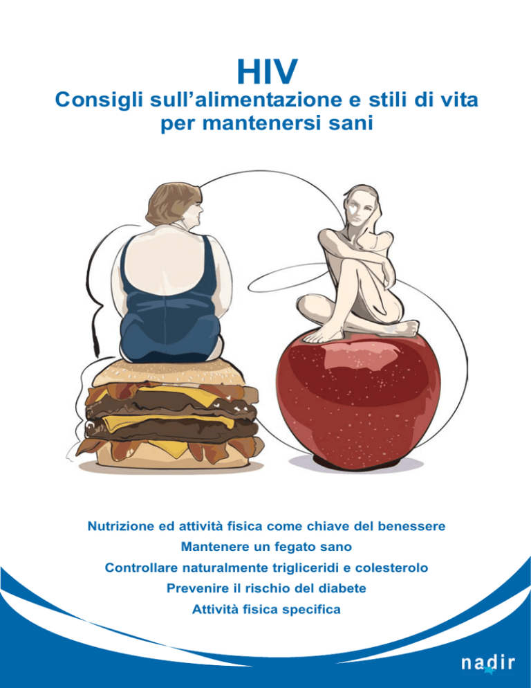 HIV Consigli sull’alimentazione e stili di vita per mantenersi sani Nutrizione ed attività fisica come chiave del benessere Mantenere un fegato sano Controllare naturalmente trigliceridi e colesterolo Prevenire il rischio del diabete Attività fisica specifica HIV Consigli sull’alimentazione e stili di vita per mantenersi sani Nutrizione ed attività fisica come chiave del benessere Mantenere un fegato sano Controllare naturalmente trigliceridi e colesterolo Prevenire il rischio del diabete Attività fisica specifica Indice 1 HIV: LA NUTRIZIONE COME CHIAVE DEL BENESSERE 2 MANTENERE UN FEGATO SANO 11 3 COMBATTERE I TRIGLICERIDI ALTI 15 4 COMBATTERE IL COLESTEROLO ALTO 19 5 HIV: L’ATTIVITÀ FISICA COME CHIAVE DEL BENESSERE 21 6 AZIONE INDIRETTA E DIRETTA DELL’ATTIVITÀ FISICA 25 7 APPROFONDIMENTO 1: CARDIO-FITNESS E DIABETE 29 8 APPROFONDIMENTO 2: ATEROSCLEROSI, MALATTIE 30 7 CARDIOCIRCOLATORIE, ALIMENTAZIONE E SALUTE 9 ASSOCIAZIONE NADIR ONLUS 32 Autori Questa pubblicazione è stata curata da Nadir Onlus - HIV Treatment Group, associazione non lucrativa di utilità sociale a servizio delle persone sieropositive. In particolare: Simone Marcotullio, David Osorio, Filippo Schloesser. La pubblicazione è stata supervisionata e condivisa con gli esperti della Clinica delle Malattie Infettive e Tropicali - Policlinico di Modena - Università degli Studi di Modena e Reggio Emilia. In particolare: Dr. Giovanni Guaraldi Medico infettivologo Dr. Francesco Giurcin Dietista Dr. Costantino Bertucelli Preparatore fisico - terapista della riabilitazione Premesse importanti In presenza di particolari patologie o condizioni è opportuno richiedere un colloquio medico-paziente sulle abitudini di vita, in particolare quelle alimentari. Le indicazioni di questo opuscolo sono assolutamente generali e non intendono sostituire quanto possa scaturire da un colloquio medico-paziente. CAP. 1 HIV: LA NUTRIZIONE COME CHIAVE DEL BENESSERE La dieta di una qualunque persona, con HIV o senza, dovrebbe cercare di incontrare tutti gli elementi nutrizionali di cui necessita. Essere HIV-positivi non significa dover cambiare drasticamente un regime alimentare, ma piuttosto renderlo più attento e bilanciato. Per “maneggiare” una materia bisogna acquisire competenze. L’educazione nutrizionale dovrebbe essere quindi parte integrante del bagaglio di competenze di una persona con HIV. La mediazione e l’intervento in tal senso della struttura sanitaria a cui la persona afferisce sarebbe dunque più che auspicabile. In generale una dieta salutare e bilanciata aiuterà a mantenere il giusto peso corporeo, le corrette assunzioni di cibo e come conseguenza lo stato di salute. Tutto ciò potrebbe anche implicare un cambiamento delle abitudini di vita di una persona. Questa mini-rivoluzione va inquadrata in un contesto generale del “volersi bene” ed aiutare il proprio fisico. Mangiare bene ed in modo appropriato aiuta a mantenere il buon funzionamento del sistema immunitario, a proteggere il corpo contro le infezioni e a rimanere in forma. Esistono situazioni particolari. Ad esempio se si assumono farmaci antiretrovirali, è più importante avere una nutrizione specifica e corretta, in quanto essi possono causare cambiamenti nelle modalità di metabolizzazio- ne, utilizzo e immagazzinamento di alcune componenti, in particolare dei grassi. Altre condizioni associate all’HIV influenzano il consumo del cibo, la digestione e l’assorbimento, mentre altre ancora influiscono sulle funzioni del corpo. Molti dei sintomi di queste condizioni (diarree, perdita di peso, irritazione della bocca e della gola, nausea o vomito) sono gestibili attraverso un’alimentazione appropriata. Una buona nutrizione sarà dunque di complemento e di rinforzo rispetto all’effetto di qualsiasi terapia per HIV e rispetto all’effetto naturale della patologia stessa sul corpo. MACRONUTRIENTI E MICRONUTRIENTI Le sostanze alimentari di cui un organismo ha bisogno per il normale sviluppo e il mantenimento di uno stato di buona salute sono dette “nutrienti”. Tra questi si distinguono: - I MACRONUTRIENTI , cioè proteine, lipidi (grassi) e carboidrati necessari per la produzione di energia e per la crescita; - I MICRONUTRIENTI , cioè le vitamine e sali i minerali. Oltre a macro- e ai micronutrienti, altri costituenti comuni degli alimenti sono l’acqua , le fibre alimentari e l’etanolo (alcol). 7 Le vitamine e i sali minerali, necessari in piccole quantità (milligrammi o microgrammi), svolgono importanti funzioni di regolazione dei processi metabolici, oltre a essere parte costituente di alcuni organi. Le carenze croniche di micronutrienti possono essere dannose per l’organismo ed essere causa di condizioni patologiche. Una dieta salutare e bilanciata fornisce dunque le giuste quantità e proporzioni di nutrienti, in modo da fare fronte ai fabbisogni specifici per età, sesso ed eventuale condizione di malattia. Prevenire è meglio che curare: iniziare quanto prima a fare una dieta sana e bilanciata è raccomandabile. 8 ALIMENTAZIONE: UNA CHIAVE PER GESTIRE LE COMPLICANZE DA HIV Una persona con HIV che non ha sintomi della malattia non ha bisogno di una dieta specifica, tuttavia è consigliabile adottare un regime alimentare salutare e bilanciato per soddisfare le esigenze proteiche ed energetiche. In presenza del virus, infatti, le difese del sistema immunitario lavorano di più per combattere l’infezione. Questo processo aumenta le esigenze di energia e di nutrienti. Altre infezioni e la febbre, per esempio, aumentano ulteriormente le esigenze di cibo del corpo. Le persone con HIV devono quindi mangiare di più, ma soprattutto meglio, per soddisfare le esigenze extra di energia e di nutrienti. Per migliorare la prognosi è assolutamente necessario trattare e, se possibile, prevenire la malnutrizione. Un supporto nutrizionale precoce permette più facilmente di prevenire la perdita di massa magra (ovvero le masse muscolari) o addi