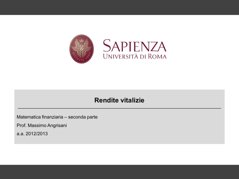 Rendite vitalizie Matematica finanziaria – seconda parte Prof. Massimo Angrisani a.a. 2012/2013 1 Cos’è una rendita vitalizia 2 Un individuo di età x si “assicura”, a partire da tale età, il pagamento di un importo (rata) unitario alla fine di ciascun anno finché rimane in vita. L’assicuratore richiede un compenso, detto “premio”. Struttura tradizionale: sono fissate le somme assicurate. Prof. Massimo Angrisani – Matematica finanziaria – a.a. 2012/2013 Cos’è una rendita 3 Supponiamo che all’epoca 0 l’assicurato di età x (intera, esatta) paghi un premio unico U. Se con certezza, a partire da tale epoca, l’assicurato percepisce le prime n rate unitarie alla fine di ciascun anno, si deve tener conto solo dell’aspetto finanziario di tale operazione. Sia i il tasso annuo effettivo di interesse considerato in regime di capitalizzazione composta. Il valore attuale della prima rata unitaria di rendita calcolato all’inizio del primo anno (epoca 0) è v = 1 1+ i v è il fattore di sconto. Prof. Massimo Angrisani – Matematica finanziaria – a.a. 2012/2013 Rendita finanziaria 4 U 1 0 1 1 2 1 … 3 v v2 v3 . . . vn Prof. Massimo Angrisani – Matematica finanziaria – a.a. 2012/2013 1 n Rendita finanziaria 5 In tale caso U= n −1 n ∑ 1⋅ v h = v ∑ vh h 1= h 0 = Somma di n-1 termini in progressione geometrica 1 − vn 1 − vn = U v= 1− v i Operazione finanziaria certa. U (valore attuale) dipende da n e da i (tasso di attualizzazione). Prof. Massimo Angrisani – Matematica finanziaria – a.a. 2012/2013 Esempio 6 Valore attuale rendita certa posticipata i 0% 1% 2% n 1 1 0,990099 0,980584 2 2 1,970395 1,942317 3 3 2,940985 2,885741 4 4 3,901966 3,811382 5 5 4,853431 4,719745 6 6 5,795476 5,61132 7 7 6,728195 6,486579 8 8 7,651678 7,345977 9 9 8,566018 8,189954 10 10 9,471305 9,018936 … … … … 15 15 13,86505 12,95283 20 20 18,04555 16,56802 25 25 22,02316 19,90398 30 30 25,80771 22,99432 … … … … 40 40 32,83469 28,54899 3% 4% 5% 0,971431 1,915636 2,833873 3,727328 4,597112 5,444274 6,269799 7,074617 7,859607 8,625595 … 12,19645 15,3934 18,28066 20,90827 … 25,53485 0,962616 1,890237 2,785045 3,649039 4,484057 5,291787 6,073782 6,83148 7,566204 8,279184 … 11,55504 14,42818 16,98144 19,27543 … 23,25686 0,95412 1,86602 2,738965 3,575876 4,379376 5,151827 5,895361 6,611909 7,303227 7,970909 … 11,00169 13,61582 15,90967 17,95045 … 21,45457 La base finanziaria 7 Prof. Massimo Angrisani – Matematica finanziaria – a.a. 2012/2013 BASE DEMOGRAFICA OSSERVAZIONI Notazioni attuariali (1) 9 x variabile età generalmente si considerano solo le età intere con ω“età estrema” t t qx Probabilità di decesso entro t anni all’età x ω px = 1 − t qx qx t / u= x = 0,1, 2,...ω t Probabilità di sopravvivenza per t anni all’età x px × u qx +t Probabilità di decesso tra le età x+t e x+t+u valutata all’età x ; risulta pari al prodotto della probabilità di sopravvivenza per t anni per la probabilità di decesso entro u anni all’età x +t Prof. Massimo Angrisani – Matematica finanziaria – a.a. 2012/2013 Probabilità di decesso e di sopravvivenza (2) 10 In particolare, se t =1 Probabilità di decesso entro un anno all’età x qx (“tasso annuo di decesso”) px = 1 − qx Probabilità di sopravvivenza per un anno all’età x (“tasso annuo di sopravvivenza ”) Risulta anche t /1 q x = t/ qx Probabilità differita di decesso tra l’età x+t e x+t+1 ; probabilità che la durata (residua troncata) di vita all’età x sia uguale a t, con x e t valori interi Prof. Massimo Angrisani – Matematica finanziaria – a.a. 2012/2013 Probabilità di decesso e di sopravvivenza (3) 11 In particolare, se x =0 t /1 q0 Probabilità “differita” di decesso entro un anno all’età t (valutata alla nascita), con ω −1 ∑ t /1 q0 =1 t =0 Prof. Massimo Angrisani – Matematica finanziaria – a.a. 2012/2013 Curva dei decessi 12 t/1q0 popolazione italiana maschi 2006 (fonte HMD) 0,045000 0,040000 0,035000 0,030000 0,025000 0,020000 0,015000 0,010000 0,005000 0,000000 0 20 40 60 80 Age Prof. Massimo Angrisani – Matematica finanziaria – a.a. 2012/2013 100 120 Probabilità annua di decesso 13 qx popolazione italiana maschi 2006 (fonte HMD) 0,6 0,5 0,4 0,3 0,2 0,1 0 0 20 40 60 Age Prof. Massimo Angrisani – Matematica finanziaria – a.a. 2012/2013 80 100 120 Valori sintetici della durata di vita 14 Vita attesa incompleta +∞ ex = ∑ h px h =1 Vita attesa completa o e= x ex + 1 2 Prof. Massimo Angrisani – Matematica finanziaria – a.a. 2012/2013 Tavola di sopravvivenza (da HMD) Life table - Italy 2006 - Males (period 1x1). Last modified: 06-Feb-2009, MPv5 (May07) 15 Age 0 1 2 3 4 5 … 50 51 52 53 54 55 … 57 58 59 lx 100000 99614 99587 99574 99561 99547 … 95895 95615 95298 94945 94562 94143 … 93150 92590 91956 dx 386 27 13 13 13 10 … 281 316 353 383 419 477 … 560 634 684 qx 0,00386 0,00027 0,00013 0,00013 0,00013 0,0001 … 0,00293 0,00331 0,0037 0,00403 0,00443 0,00507 … 0,00601 0,00685 0,00744 Age 60 61 62 63 64 65 … 70 71 72 73 74 75 … 108 109 110+ Prof. Massimo Angrisani – Matematica finanziaria – a.a. 2012/2013 lx 91271 90514 89697 88794 87805 86775 … 80100 78415 76600 74503 72331 70017 … 10 5 2 dx 757 817 903 989 1030 1143 … 1685 1815 2097 2172 2313 2578 … 5 3 2 qx 0,0083 0,00903 0,01007 0,01113 0,01173 0,01318 … 0,02103 0,02315 0,02738 0,02915 0,03198 0,03683 … 0,5049 0,51926 1,000 Tavola di sopravvivenza (mortalità) 16 E’ una rappresentazione tabulare della mortalità . La determinazione delle probabilità di morte esprimenti il rischio che una persona di età x muoia prima del compimento del compleanno x+n, consente la determinazione delle ulteriori funzioni biometriche contenute nella tavola di mortalità. l0 degli individui in vita all’età 0 (generalmente l0 =100000) – radice della tavola Numero (atteso) degli individui in vita all’età x : lx+1=lx*(1-qx) Numero (atteso) dei dec