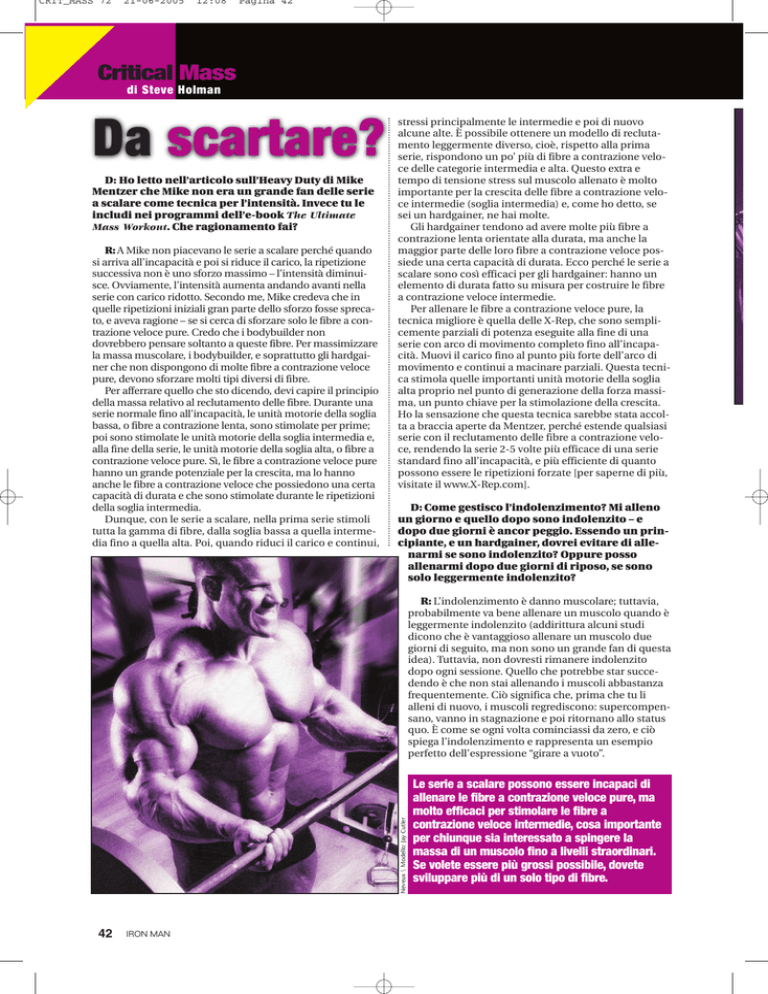 CRIT_MASS 72 21-06-2005 12:08 Pagina 42 Critical Mass di Steve Holman Da scartare? D: Ho letto nell’articolo sull’Heavy Duty di Mike Mentzer che Mike non era un grande fan delle serie a scalare come tecnica per l’intensità. Invece tu le includi nei programmi dell’e-book The Ultimate Mass Workout. Che ragionamento fai? R: A Mike non piacevano le serie a scalare perché quando si arriva all’incapacità e poi si riduce il carico, la ripetizione successiva non è uno sforzo massimo – l’intensità diminuisce. Ovviamente, l’intensità aumenta andando avanti nella serie con carico ridotto. Secondo me, Mike credeva che in quelle ripetizioni iniziali gran parte dello sforzo fosse sprecato, e aveva ragione – se si cerca di sforzare solo le fibre a contrazione veloce pure. Credo che i bodybuilder non dovrebbero pensare soltanto a queste fibre. Per massimizzare la massa muscolare, i bodybuilder, e soprattutto gli hardgainer che non dispongono di molte fibre a contrazione veloce pure, devono sforzare molti tipi diversi di fibre. Per afferrare quello che sto dicendo, devi capire il principio della massa relativo al reclutamento delle fibre. Durante una serie normale fino all’incapacità, le unità motorie della soglia bassa, o fibre a contrazione lenta, sono stimolate per prime; poi sono stimolate le unità motorie della soglia intermedia e, alla fine della serie, le unità motorie della soglia alta, o fibre a contrazione veloce pure. Sì, le fibre a contrazione veloce pure hanno un grande potenziale per la crescita, ma lo hanno anche le fibre a contrazione veloce che possiedono una certa capacità di durata e che sono stimolate durante le ripetizioni della soglia intermedia. Dunque, con le serie a scalare, nella prima serie stimoli tutta la gamma di fibre, dalla soglia bassa a quella intermedia fino a quella alta. Poi, quando riduci il carico e continui, stressi principalmente le intermedie e poi di nuovo alcune alte. È possibile ottenere un modello di reclutamento leggermente diverso, cioè, rispetto alla prima serie, rispondono un po’ più di fibre a contrazione veloce delle categorie intermedia e alta. Questo extra e tempo di tensione stress sul muscolo allenato è molto importante per la crescita delle fibre a contrazione veloce intermedie (soglia intermedia) e, come ho detto, se sei un hardgainer, ne hai molte. Gli hardgainer tendono ad avere molte più fibre a contrazione lenta orientate alla durata, ma anche la maggior parte delle loro fibre a contrazione veloce possiede una certa capacità di durata. Ecco perché le serie a scalare sono così efficaci per gli hardgainer: hanno un elemento di durata fatto su misura per costruire le fibre a contrazione veloce intermedie. Per allenare le fibre a contrazione veloce pure, la tecnica migliore è quella delle X-Rep, che sono semplicemente parziali di potenza eseguite alla fine di una serie con arco di movimento completo fino all’incapacità. Muovi il carico fino al punto più forte dell’arco di movimento e continui a macinare parziali. Questa tecnica stimola quelle importanti unità motorie della soglia alta proprio nel punto di generazione della forza massima, un punto chiave per la stimolazione della crescita. Ho la sensazione che questa tecnica sarebbe stata accolta a braccia aperte da Mentzer, perché estende qualsiasi serie con il reclutamento delle fibre a contrazione veloce, rendendo la serie 2-5 volte più efficace di una serie standard fino all’incapacità, e più efficiente di quanto possono essere le ripetizioni forzate [per saperne di più, visitate il www.X-Rep.com]. D: Come gestisco l’indolenzimento? Mi alleno un giorno e quello dopo sono indolenzito – e dopo due giorni è ancor peggio. Essendo un principiante, e un hardgainer, dovrei evitare di allenarmi se sono indolenzito? Oppure posso allenarmi dopo due giorni di riposo, se sono solo leggermente indolenzito? Neveux \ Modello: Jay Cutler R: L’indolenzimento è danno muscolare; tuttavia, probabilmente va bene allenare un muscolo quando è leggermente indolenzito (addirittura alcuni studi dicono che è vantaggioso allenare un muscolo due giorni di seguito, ma non sono un grande fan di questa idea). Tuttavia, non dovresti rimanere indolenzito dopo ogni sessione. Quello che potrebbe star succedendo è che non stai allenando i muscoli abbastanza frequentemente. Ciò significa che, prima che tu li alleni di nuovo, i muscoli regrediscono: supercompensano, vanno in stagnazione e poi ritornano allo status quo. È come se ogni volta cominciassi da zero, e ciò spiega l’indolenzimento e rappresenta un esempio perfetto dell’espressione “girare a vuoto”. 42 IRON MAN Le serie a scalare possono essere incapaci di allenare le fibre a contrazione veloce pure, ma molto efficaci per stimolare le fibre a contrazione veloce intermedie, cosa importante per chiunque sia interessato a spingere la massa di un muscolo fino a livelli straordinari. Se volete essere più grossi possibile, dovete sviluppare più di un solo tipo di fibre. CRIT_MASS 72 21-06-2005 12:08 Pagina 43 mezzo molto più efficiente per ottenere massa tipo professionisti rispetto a fare semplicemente una serie dopo l’altra di molti esercizi. Per esempio, aggiungendo le X-Rep alle distensioni su panca inclinata, porti i pettorali oltre l’incapacità nel punto chiave di generazione della forza massima, ottenendo molta più attivazione delle fibre a contrazione veloce rispetto a quando ti fermi all’incapacità positiva. Le X-Rep sono il modo migliore per superare l’incapacità del sistema nervoso e incrementare l’attivazione delle fibre a contrazione veloce. Con le X-Rep crei anche una certa occlusione post-incapacità, perché le parziali tipo pulsazioni mantengono la tensione sul muscolo allenato. Puoi quasi sentire il sangue che è spremuto a ogni movimento di pulsazione. Con le X-Rep ottieni anche un certo allungamento da sovraccarico che può essere connesso all’iperplasia, ovvero la