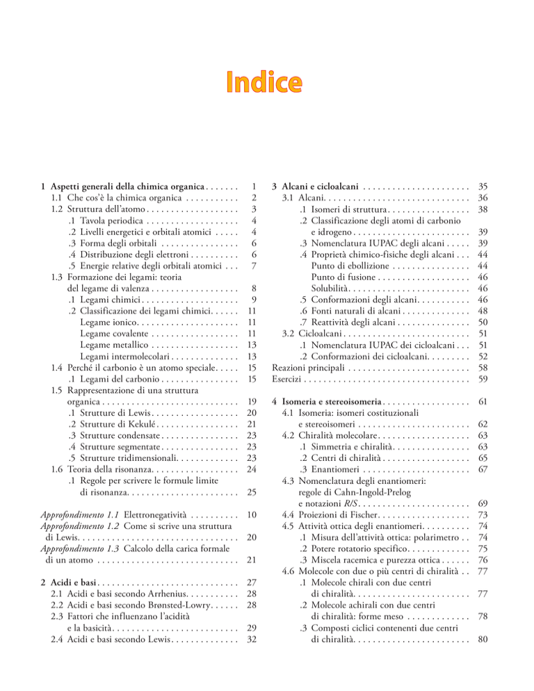 Indice 1 Aspetti generali della chimica organica . . . . . . . 1.1 Che cos’è la chimica organica . . . . . . . . . . . 1.2 Struttura dell’atomo . . . . . . . . . . . . . . . . . . . .1 Tavola periodica . . . . . . . . . . . . . . . . . . . .2 Livelli energetici e orbitali atomici . . . . . .3 Forma degli orbitali . . . . . . . . . . . . . . . . .4 Distribuzione degli elettroni . . . . . . . . . . .5 Energie relative degli orbitali atomici . . . 1.3 Formazione dei legami: teoria del legame di valenza . . . . . . . . . . . . . . . . . . .1 Legami chimici . . . . . . . . . . . . . . . . . . . . .2 Classificazione dei legami chimici. . . . . . Legame ionico. . . . . . . . . . . . . . . . . . . . . Legame covalente . . . . . . . . . . . . . . . . . . Legame metallico . . . . . . . . . . . . . . . . . . Legami intermolecolari . . . . . . . . . . . . . . 1.4 Perché il carbonio è un atomo speciale. . . . . .1 Legami del carbonio . . . . . . . . . . . . . . . . 1.5 Rappresentazione di una struttura organica . . . . . . . . . . . . . . . . . . . . . . . . . . . . .1 Strutture di Lewis . . . . . . . . . . . . . . . . . . .2 Strutture di Kekulé . . . . . . . . . . . . . . . . . .3 Strutture condensate . . . . . . . . . . . . . . . . .4 Strutture segmentate . . . . . . . . . . . . . . . . .5 Strutture tridimensionali. . . . . . . . . . . . . 1.6 Teoria della risonanza. . . . . . . . . . . . . . . . . . .1 Regole per scrivere le formule limite di risonanza. . . . . . . . . . . . . . . . . . . . . . . 1 2 3 4 4 6 6 7 8 9 11 11 11 13 13 15 15 19 20 21 23 23 23 24 25 Approfondimento 1.1 Elettronegatività . . . . . . . . . . 10 Approfondimento 1.2 Come si scrive una struttura di Lewis. . . . . . . . . . . . . . . . . . . . . . . . . . . . . . . . . 20 Approfondimento 1.3 Calcolo della carica formale di un atomo . . . . . . . . . . . . . . . . . . . . . . . . . . . . . 21 2 Acidi e basi . . . . . . . . . . . . . . . . . . . . . . . . . . . . . 2.1 Acidi e basi secondo Arrhenius. . . . . . . . . . . 2.2 Acidi e basi secondo Brønsted-Lowry. . . . . . 2.3 Fattori che influenzano l’acidità e la basicità. . . . . . . . . . . . . . . . . . . . . . . . . . 2.4 Acidi e basi secondo Lewis . . . . . . . . . . . . . . 27 28 28 29 32 3 Alcani e cicloalcani . . . . . . . . . . . . . . . . . . . . . . 3.1 Alcani. . . . . . . . . . . . . . . . . . . . . . . . . . . . . . .1 Isomeri di struttura. . . . . . . . . . . . . . . . . .2 Classificazione degli atomi di carbonio e idrogeno . . . . . . . . . . . . . . . . . . . . . . . . .3 Nomenclatura IUPAC degli alcani . . . . . .4 Proprietà chimico-fisiche degli alcani . . . Punto di ebollizione . . . . . . . . . . . . . . . . Punto di fusione . . . . . . . . . . . . . . . . . . . Solubilità. . . . . . . . . . . . . . . . . . . . . . . . . .5 Conformazioni degli alcani. . . . . . . . . . . .6 Fonti naturali di alcani . . . . . . . . . . . . . . .7 Reattività degli alcani . . . . . . . . . . . . . . . 3.2 Cicloalcani . . . . . . . . . . . . . . . . . . . . . . . . . . .1 Nomenclatura IUPAC dei cicloalcani . . . .2 Conformazioni dei cicloalcani. . . . . . . . . Reazioni principali . . . . . . . . . . . . . . . . . . . . . . . . . Esercizi . . . . . . . . . . . . . . . . . . . . . . . . . . . . . . . . . . 4 Isomeria e stereoisomeria . . . . . . . . . . . . . . . . . . 4.1 Isomeria: isomeri costituzionali e stereoisomeri . . . . . . . . . . . . . . . . . . . . . . . 4.2 Chiralità molecolare. . . . . . . . . . . . . . . . . . . .1 Simmetria e chiralità. . . . . . . . . . . . . . . . .2 Centri di chiralità . . . . . . . . . . . . . . . . . . .3 Enantiomeri . . . . . . . . . . . . . . . . . . . . . . 4.3 Nomenclatura degli enantiomeri: regole di Cahn-Ingold-Prelog e notazioni R/S . . . . . . . . . . . . . . . . . . . . . . . 4.4 Proiezioni di Fischer. . . . . . . . . . . . . . . . . . . 4.5 Attività ottica degli enantiomeri. . . . . . . . . . .1 Misura dell’attività ottica: polarimetro . . .2 Potere rotatorio specifico. . . . . . . . . . . . . .3 Miscela racemica e purezza ottica . . . . . . 4.6 Molecole con due o più centri di chiralità . . .1 Molecole chirali con due centri di chiralità. . . . . . . . . . . . . . . . . . . . . . . . .2 Molecole achirali con due centri di chiralità: forme meso . . . . . . . . . . . . . .3 Composti ciclici contenenti due centri di chiralità. . . . . . . . . . . . . . . . . . . . . . . . 35 36 38 39 39 44 44 46 46 46 48 50 51 51 52 58 59 61 62 63 63 65 67 69 73 74 74 75 76 77 77 78 80 Indice 4.7 Separazione di enantiomeri: risoluzione . . . . .1 Risoluzione per mezzo di sali diastereoisomeri . . . . . . . . . . . . . . . . . . . .2 Risoluzione per mezzo di enzimi. . . . . . . Esercizi . . . . . . . . . . . . . . . . . . . . . . . . . . . . . . . . . . XI 82 83 84 85 Approfondimento 4.1 Conformazione e configurazione . . . . . . . . . . . . . . . . . . . . . . . . . . 70 5 Alcheni . . . . . . . . . . . . . . . . . . . . . . . . . . . . . . . . 5.1 Struttura elettronica degli alcheni . . . . . . . . 5.2 Nomenclatura IUPAC degli alcheni. . . . . . . 5.3 Proprietà chimico-fisiche degli alcheni. . . . . 5.4 Isomeria geometrica . . . . . . . . . . . . . . . . . . . .1 Notazione cis/trans . . . . . . . . . . . . . . . . . .2 Notazione E/Z. . . . . . . . . . . . . . . . . . . . . 5.5 Stabilità degli alcheni . . . . . . . . . . . . . . . . . . 5.6 Reattività degli alcheni. . . . . . . . . . . . . . . . . .1 Diagrammi di energia . . . . . . . . . . . . . . . .2 Addizione di acidi alogenidrici . . . . . . . . .3 Addizione di acqua . . . . . . . . . . . . . . . . . .4 Addizione di bromo e cloro. . . . . . . . . . . .5 Reazione con peracidi . . . . . . . . . . . . . . . .6 Reazione di idrogenazione. . . . . . . . . . . . .7 Reazione di 1,2-diossidrilazione . . . . . . . Reazioni principali . . . . . . . . . . . . . . . . . . . . . . . . . Esercizi . . . . . . . . . . . . . . . . . . . . . . . . . . . . . . . . . . 91 92 92 94 94 95 