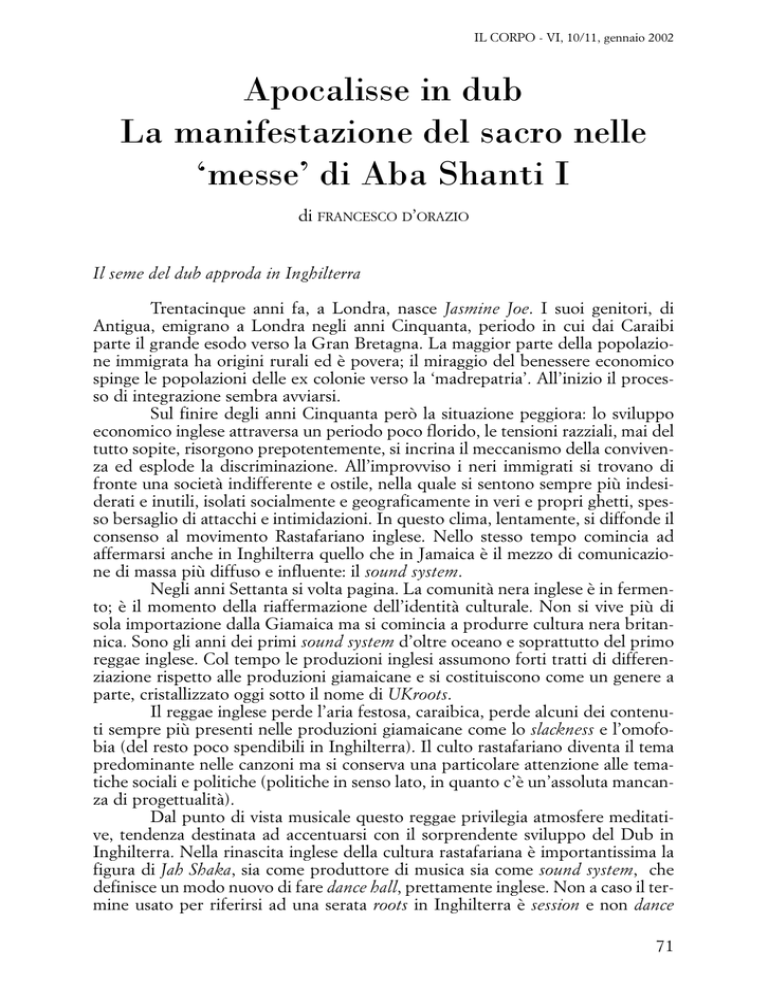 IL CORPO - VI, 10/11, gennaio 2002 Apocalisse in dub La manifestazione del sacro nelle ‘messe’ di Aba Shanti I di FRANCESCO D’ORAZIO Il seme del dub approda in Inghilterra Trentacinque anni fa, a Londra, nasce Jasmine Joe. I suoi genitori, di Antigua, emigrano a Londra negli anni Cinquanta, periodo in cui dai Caraibi parte il grande esodo verso la Gran Bretagna. La maggior parte della popolazione immigrata ha origini rurali ed è povera; il miraggio del benessere economico spinge le popolazioni delle ex colonie verso la ‘madrepatria’. All’inizio il processo di integrazione sembra avviarsi. Sul finire degli anni Cinquanta però la situazione peggiora: lo sviluppo economico inglese attraversa un periodo poco florido, le tensioni razziali, mai del tutto sopite, risorgono prepotentemente, si incrina il meccanismo della convivenza ed esplode la discriminazione. All’improvviso i neri immigrati si trovano di fronte una società indifferente e ostile, nella quale si sentono sempre più indesiderati e inutili, isolati socialmente e geograficamente in veri e propri ghetti, spesso bersaglio di attacchi e intimidazioni. In questo clima, lentamente, si diffonde il consenso al movimento Rastafariano inglese. Nello stesso tempo comincia ad affermarsi anche in Inghilterra quello che in Jamaica è il mezzo di comunicazione di massa più diffuso e influente: il sound system. Negli anni Settanta si volta pagina. La comunità nera inglese è in fermento; è il momento della riaffermazione dell’identità culturale. Non si vive più di sola importazione dalla Giamaica ma si comincia a produrre cultura nera britannica. Sono gli anni dei primi sound system d’oltre oceano e soprattutto del primo reggae inglese. Col tempo le produzioni inglesi assumono forti tratti di differenziazione rispetto alle produzioni giamaicane e si costituiscono come un genere a parte, cristallizzato oggi sotto il nome di UKroots. Il reggae inglese perde l’aria festosa, caraibica, perde alcuni dei contenuti sempre più presenti nelle produzioni giamaicane come lo slackness e l’omofobia (del resto poco spendibili in Inghilterra). Il culto rastafariano diventa il tema predominante nelle canzoni ma si conserva una particolare attenzione alle tematiche sociali e politiche (politiche in senso lato, in quanto c’è un’assoluta mancanza di progettualità). Dal punto di vista musicale questo reggae privilegia atmosfere meditative, tendenza destinata ad accentuarsi con il sorprendente sviluppo del Dub in Inghilterra. Nella rinascita inglese della cultura rastafariana è importantissima la figura di Jah Shaka, sia come produttore di musica sia come sound system, che definisce un modo nuovo di fare dance hall, prettamente inglese. Non a caso il termine usato per riferirsi ad una serata roots in Inghilterra è session e non dance 71 F. D’Orazio, Apocalisse in dub hall, distinzione che segna il passaggio dalla concezione più giamaicana di festa come momento fondante della comunità, festa orgiastica, a quella caraibico-inglese di rito religioso solenne che lascia molto meno spazio all'idea di entertainment. La metamorfosi In questo clima nasce e cresce Jasmin Joe. Si avvicina giovanissimo al mondo del reggae, attraverso il padre che suonava con un sound system nella Londra degli anni Sessanta. La carriera da sound boy comincia però più tardi, alle scuole superiori, dove fonda con alcuni amici il Jah I-tal Youth sound system. L’esperienza dura qualche anno ma poi tutti prendono strade diverse tranne Joe, che dal 1983 comincia a suonare con Jah Tubbys (JTS), detentore dell’omonimo sound system, uno dei più attivi sulla scena inglese di quegli anni. La collaborazione, soprattutto come MC1, durerà fino alla fine del decennio, periodo in cui il JTS comincia a suonare sempre più raramente. Verso la fine degli anni Settanta qualcosa comincia a cambiare. Negli anni Ottanta il ragamuffin invade la scena reggae: «…andavo a un sacco di session ma non mi davano la vibrazione che avrebbero dovuto darmi, quella vibrazione che sentivo nelle session di fine anni ’70, inizio anni ’80. Mi ricordavo che le session erano qualcosa di profondamente ispirato al Rastafarianesimo. Per me il Rastafari è sempre stato parte integrante della musica che suoniamo. Negli anni Ottanta andando alle dance hall si sentiva molta musica, ma nessun messaggio. Tutta l'enfasi che c'era prima sul Rastafari era scomparsa. Jah Rastafari è questa musica e il suo messaggio…è di Sua Maestà Imperiale che stiamo parlando, per questo, credo che separare la mia musica e il suo messaggio sia sbagliato. Se la musica perde la sua essenza che è fondata su Jah Rastafari, be’, diventa sicuramente qualche altra cosa. Diventa trip hop, hip hop…»2. Nasce l'esigenza di un nuovo sound system, che abbia la funzione di baluardo contro la ‘laicizzazione’ della musica reggae suonata dai sound system inglesi. Così nell’agosto del 1990, il JTS suona al carnevale di Leicester ma ha un nuovo nome ed un nuovo leader. Jasmin Joe, ha 25 anni. Da allora in poi sarà Aba Shanti-I. Fin dall’esordio Aba Shanti-I ha grande successo. Già nel 1995 la BASS, British Association of Sound Systems, lo nomina miglior sound system dell’anno. Ultimamente Aba Shanti si è affermato a livello internazionale. Anche i media si sono interessati alle sue performance. Dal 1998 ad oggi, tre programmi televisivi si sono già occupati di lui, in tre nazioni differenti: Francia, Germania e ovviamente Inghilterra. Due aspetti del fenomeno hanno attirato maggiormente l’attenzione della televisione. Lo “MC” è la persona che sta al microfono del sound system, introduce le canzoni, canta sulle versioni musicali dei pezzi e stabilisce il rapporto col pubblico. 2 Tutte le informazioni su Jasmin Joe sono tratte da due interviste: Jah Warrior, Aba Shanti, su Boomshackalacka 9, 1992; Prodigy of Dub - Intervista a Aba Shanti, Settembre 2000. 1 72 IL CORPO - VI, 10/11, gennaio 2002 Il