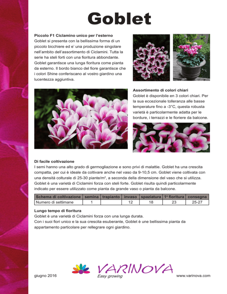 Goblet Piccolo F1 Ciclamino unico per l’esterno Goblet si presenta con la bellissima forma di un piccolo bicchiere ed e’ una produzione singolare nell’ambito dell’assortimento di Ciclamini. Tutta la serie ha steli forti con una fioritura abbondante. Goblet garantisce una lunga fioritura come pianta da esterno. Il bordo bianco del fiore garantisce che i colori Shine conferiscano al vostro giardino una lucentezza aggiuntiva. Assortimento di colori chiari Goblet è disponibile en 3 colori chiari. Per la sua eccezionale tolleranza alle basse temperature fino a -3°C, questa robusta varietà è particolarmente adatta per le bordure, i terrazzi e le fioriere da balcone. Di facile coltivazione I semi hanno una alto grado di germogliazione e sono privi di malattie. Goblet ha una crescita compatta, per cui è ideale da coltivare anche nel vaso da 9-10,5 cm. Goblet viene coltivata con una densità colturale di 25-30 piante/m2, a seconda della dimensione del vaso che si utilizza. Goblet è una varietà di Ciclamini forza con steli forte. Goblet risulta quindi particolarmente indicato per essere utilizzato come pianta da grande vaso o pianta da balcone. Schema di coltivazione semina trapianto Numero di settimane 1 invaso spaziatura 1a fioritura consegna 12 18 23 25-27 Lungo tempo di fioritura Goblet è una varietà di Ciclamini forza con una lunga durata. Con i suoi fiori unico e la sua crescita esuberante, Goblet è une bellissima pianta da appartamento particolare per rellegrare ogni giardino. giugno 2016 Easy growing www.varinova.com Goblet Elenco dell’assortimento di Goblet 9257 Shine Wine Red 9269 Shine Pink 9270 Shine Purple Imballaggi speciali per la vendita Per la vendita della nostra serie di Ciclamini sono acquistabili (per il commercio al dettaglio) etichette speciali, da ordinare da Varinova. Informazioni Si consiglia di consultare il nostro sito oppure di chiamarci per ottenere ulteriori informazioni e istruzioni per la coltivazione. Siamo volentieri a Vostra disposizione. giugno 2016 Easy growing www.varinova.com