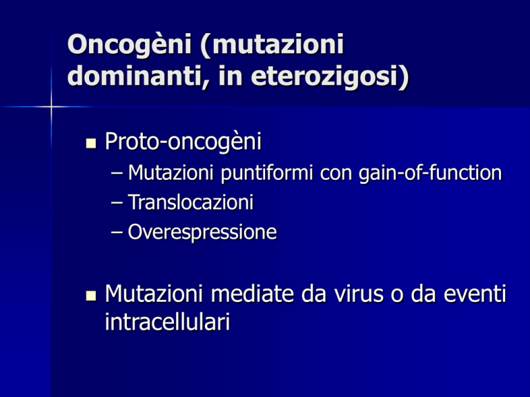 Oncogèni (mutazioni dominanti, in eterozigosi) Proto-oncogèni – Mutazioni puntiformi con gain-of-function – Translocazioni – Overespressione Mutazioni mediate da virus o da eventi intracellulari Cancro del Colon Il cancro del colon è un modello utile di interazione tra genetica ed ambiente Forme Familiare e Spontanea – Familiare – 5% – Spontanea – 95% cancro del colon Due forme di predisposizione – Familial adenomatous polyposis (FAP) Autosomico dominante 1% – Hereditary nonpolyposis colorectal cancer (HNPCC) 2 - 4% Cancro del Colon FAP – Epitelio proliferante – mutazioni in APC Cromosoma 5 Le cellule epiteliali sfuggono parzialmente al controllo del ciclo cellulare Le cellule si dividono per formare un piccolo cluster che porta ad un polipo Gli individui eterozigoti ne formano da 100 a 1000 Cancro del Colon FAP adenoma intermedio – Mutazioni dell’oncogene ras Cromosoma 12 Crescita maggiore e protrusioni a forma di dita Cancro del Colon FAP ras Adenoma avanzato – DCC - deleted in colon cancer – Mutazioni sul Cromosoma 18 Adenocarcinoma – Mutazioni sul Cromosoma 17 – Perdita o inattivazione di p53 Cancro del colon HNPCC Si sviluppa dopo l’apparire di un piccolo numero di polipi Mutazioni – Cromosoma 2 – Cromosoma 3 Cancro del colon HNPCC Chromosome 2 – MSH2- DNA repair gene – L’inattivazione causa un rapido accumularsi di mutazioni – Sviluppo del cancro del colon-retto Colon Cancer HNPCC Cromosoma 3 – MLH1 – DNA repair Mismatch repair genes (MMR) – Le mutazioni causano un’instabilità genomica diffusa, accelerando l’insorgenza di altre mutazioni Differenze tra FAP e HNPCC Le mutazioni di FAP – APC portano a 1001000 polipi – Ciscun polipo accumula lentamente mutazioni in altri geni, ras, DCC – Rapida iniziazione del tumore, lenta progressione HNPCC – mutazioni in geni del riparo del DNA – Porta a mutazioni genomiche diffuse – Lenta iniziazione, rapida progressione I fatti sul tumore alla prostata La più comune neoplasia tra gli uomini 232, 090 nuovi casi stimati per il 2005 negli USA e 30,350 morti Probabilità di diagnosi 1 in 5 nel corso della vita, con un’età mediana alla diagnosi di 72 anni Gli afro-americani hanno un incidenza maggiore del 34% e il doppio della mortalità Gli americani di origine asiatica hanno un’incidenza più bassa Sopravvivenza > 5 anni se il tumore eè limitato alla prostata The Prostate Gland Clip Male sex gland Size of a walnut Helps control urine flow Produces fluid component of semen Produces Prostate Specific Antigen (PSA) and Acid Phosphatase Mutazioni genetiche nel cancro della prostata? Germline mutations Methylation changes Loss of GSTp expression Androgen receptor - short . tandem repeats (Xq11-12) Chromosome 16q loss PTEN mutation (10q23) p53 inactivation (17p) •Early event in development of prostate cancer •CpG islands within promoter regions and open reading frames of growth regulatory genes •Glutathione S transferase -pi (GSTp) scavenges free radicals •Loss may be caused by methylation •GSTp absent in almost every prostate tumor •GSTp may be only thing stopping prostate cancer •Small polymorphic CAG repeats (microsatellites) associated with transactivation activity •Inverse relationship between CAG repeats and prostate cancer •16q is sight of tumor suppressor gene, Ecadherin •Loss of E-cad increases disease progression Astrocitomi Negli astrocitomi le più frequenti amplificazioni sono a 7p12, 8q24.1 e 12q13-q15 (i loci di EGF-R, C-MYC e CDK4) delezioni a 9p21 (il locus of p15 and p16) e 10q23.3 (PTEN) Perdita di eterozigosità LOH (loss of heterozygosity) MICROARRAY: expression profiling Tumour vs. normal CGH (comparative genomic hybridization) È una tecnica di citogenetica molecolare che identifica le aberrazioni cromosomiche È basata su un’analisi quantitativa in fluorescenza a due colori: il DNA estratto dalle cellule tumorali è marcato con un colore (es. verde) e mischiato 1:1 con un DNA da cellule normali, marcato ad es. con il rosso La miscela è ibridata ai cromosomi metafasici normali Le porzioni ugualmente rappresentate saranno giallo chiaro Le regioni delete nel tumore saranno rosse Le regionipresenti in molteplici copie nel tumore (a causa dell’amplificazione) saranno verdi