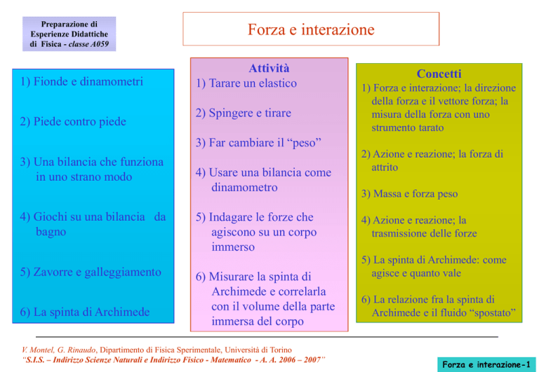 Oggetti: bilancia a due bracci, pesiera, pongo, un bicchierino di plastica, una clip, cilindro graduato, dinamometro, acqua