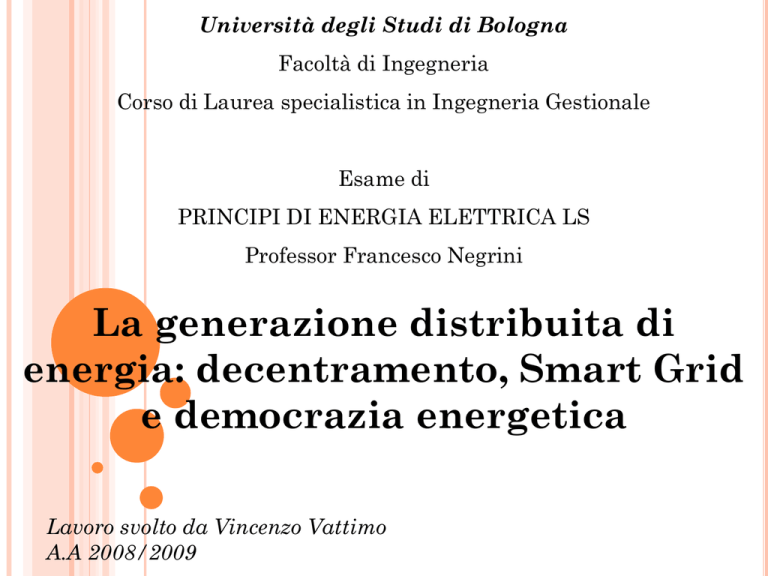 Università degli Studi di Bologna Facoltà di Ingegneria Corso di Laurea specialistica in Ingegneria Gestionale Esame di PRINCIPI DI ENERGIA ELETTRICA LS Professor Francesco Negrini La generazione distribuita di energia: decentramento, Smart Grid e democrazia energetica Lavoro svolto da Vincenzo Vattimo A.A 2008/2009 Agenda •Attuale sistema di distribuzione •Problemi dell’attuale sistema •La generazione distribuita •Le Smart Grid •Il progetto U.S.A. e Europeo per l’implementazione delle Smart Grid L'attuale sistema di distribuzione dell’energia Le reti elettriche “tradizionali” sono state concepite per trasportare energia da un numero limitato di punti di immissione ad un gran numero di consumatori. La necessità di realizzare grandi centrali, nonché tralicci per distribuire l’energia elettrica a milioni di persone, rendeva per così dire “naturali” i monopoli energetici. •Generazione centralizzata •Flusso unidirezionale dell’energia •La generazione segue il carico •Gestione basata su dati storici •Accessibilità alla rete limitata per i nuovi produttori I problemi dell’attuale sistema di distribuzione •Obsolescenza delle linee •I vincoli imposti ai transiti di potenza tra Paesi confinanti o tra zone di uno stesso Paese •Le reti sono state concepite e progettate per un servizio di tipo passivo •Lo sviluppo di nuove forme di produzione di energia, ovvero le fonti rinnovabili: incremento dei livelli di corrente di cortocircuito e la perdita di selettività delle protezioni in corrispondenza a guasti sulla rete; tensione non più controllabile Gli impianti da fonte rinnovabile sono considerati sorgenti intermittenti di elettricità La Generazione Distribuita Si basa su unità produttive (campi eolici, fotovoltaici, centrali a biomasse, cogeneratori) di piccole-medie dimensioni •Minore costo di distribuzione •Generazione da fonti rinnovabili •Maggiore efficienza produttiva •Flusso multidirezionale dell’energia •I consumatori diventano anche produttori La rete elettrica cambia completamente ruolo e funzioni. E‘ destinata trasformarsi da rete "passiva” a "attiva" e "intelligente" (smart grid), capace di gestire e regolare più flussi elettrici che viaggiano in maniera discontinua e bidirezionale. Le reti elettriche intelligenti. Le Smart Grid Una Smart Grid costituita da una serie di “mini-reti”, ove chiunque può produrre localmente energia e utilizzarla per le proprie esigenze. Al tempo stesso, grazie alla tecnologia dei contatori intelligenti, il flusso energetico deve poter avvenire in senso bidirezionale: ossia, i produttori locali potranno attingere dalla rete principale o usufruire di essa per rivendere all'ente erogatore la propria produzione di energia elettrica. Caratteristiche essenziali di una Smart Grid •Capacità di integrare in rete generazione elettrica centralizzata e diffusa; •Immissione in rete a pari condizioni di generazione costante, variabile e intermittente; •Interconnessione con altre reti di servizi e flussi di potenza; •Capacità di autoanalisi e evitare congestioni e garantire maggiore affidabilità, sicurezza e qualità del servizio; •Disponibilità di informazioni in tempo reale sia per i produttori, sia per i clienti finali; •Possibilità per i clienti finali di effettuare scelte che interagiscano con il sistema; •Capacità di quantificare e ricompensare i comportamenti e le scelte virtuose dei clienti; •Architettura di connessione globale (simile a Internet) di “intelligenza distribuita” e flussi di potenza; Problematiche delle Smart Grid •Difficoltà nell’adeguamento delle attuali infrastrutture elettriche; •Lunghi tempi di realizzazione; •Vincoli tecnici per il controllo dei generatoti remoti, previsione della produzione e gestione dei flussi di energia; •Mancanza di accordi politici. •Elevati investimenti nelle reti ICT; •Elevata complessità del software per la gestione dei flussi energetici Nel software le Smart Grid hanno trovato il principale ostacolo Rischi la natura delle Smart Grid, non troppo dissimile dal Word Wide Web, la renderebbe vulnerabile agli attacchi dai cyber criminali, i quali potrebbero condurre a dei veri e propri black-out. U.S.A.: Progetti di Implementazione Smart Grids Il neopresidente Barack Obama il 23 febbraio 2009 ha approvato lo “Stimulus Plan”, un piano per risanare l’economia dalla crisi e reinvestire in vari settori dei servizi, tra cui l’energia. “Grid Vision” 2030 del Doe Si basa su 3 principali strutture: •A national electricity “backbone”: Collegamento Nazionale di tutti i siti potenzialmente produttivi attraverso cavi ad alto voltaggio. •Regional interconnections, che include Canada e Messico: La spina dorsale del sistema costituito da cavi di trasmissione ad alta capacità che collegano la costa Est a quella Ovest, cosi come Canada e Messico. •Local, mini and Micro-grids: Collegamento locale di generatori di piccola taglia, modulari, integrati o in sistemi isolati, situati vicino al carico dell’utente. Il sistema locale è collegato al sistema regionale ADDRESS. Il progetto Europeo per le Smart Grid In Europa non è ancora passata nessuna legge riguardo le Smart Grid, però la Commissione Europea prevede di investire €750 miliardi nei prossimi trent’anni con il progetto ”European Smart Grids Technology Platform”, In vista di una progressiva liberalizzazione del mercato europeo dell’elettricità nasce il progetto ADDRESS (Active Distribution networks with full integration of demand and distributed energy resources) inserito nella piattaforma europea delle Smart Grids e attuato da un consorzio di 25 associati di 11 paesi europei, provenienti principalmente dal mondo dell'impresa elettrica e della ricerca. Iniziato il 1 settembre del 2008, ha una durata di 4 anni Obiettivo: avviare e sviluppare un quadro completo commerciale e di regole per lo sviluppo della domanda attiva di energia elet