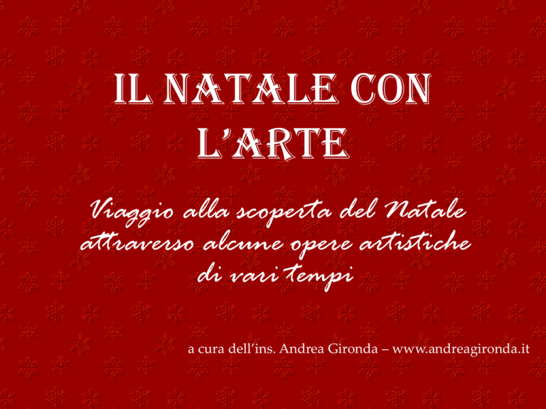 IL NATALE CON L’ARTE Viaggio alla scoperta del Natale attraverso alcune opere artistiche di vari tempi a cura dell’ins. Andrea Gironda – www.andreagironda.it L’arte attraverso il suo linguaggio espressivo è un mezzo per parlare del mistero del Natale. Molti artisti di tutti i tempi attraverso la pittura, la scultura, la musica, la poesia e altre forme artistiche hanno “parlato” del Natale agli uomini di ogni tempo. Spesso alcune opere non vogliono fermarsi ad un unico evento ma ne raggruppano diversi, cercando così di dare un messaggio ampio a chi si pone di fronte all’opera. L’ANNUNCIAZIONE affresco del Beato Angelico Presupposti biblici: Il Signore Dio prese l’uomo e lo pose nel giardino di Eden, perché lo coltivasse e lo custodisse. Il Signore Dio diede questo comando all’uomo: «Tu potrai mangiare di tutti gli alberi del giardino, ma dell’albero della conoscenza del bene e del male non devi mangiare, perché, quando tu ne mangiassi, certamente moriresti». Ma Adamo non ascoltò la voce di Dio e disobbedì alla sua parola. Il Signore Dio lo scacciò dal giardino di Eden, perché lavorasse il suolo da dove era stato tratto. Scacciò l’uomo e pose ad oriente del giardino di Eden i cherubini e la fiamma della spada folgorante, per custodire la via all’albero della vita. (dal libro della Genesi capitoli 2-3) Nel sesto mese, l’angelo Gabriele fu mandato da Dio in una città della Galilea, chiamata Nazaret, a una vergine, promessa sposa di un uomo della casa di Davide, chiamato Giuseppe. La vergine si chiamava Maria. Entrando da lei, disse: «Ti saluto, o piena di grazia, il Signore è con te». A queste parole ella rimase turbata e si domandava che senso avesse un tale saluto. L’angelo le disse: «Non temere, Maria, perché hai trovato grazia presso Dio. Ecco concepirai un figlio, lo darai alla luce e lo chiamerai Gesù. Sarà grande e chiamato Figlio dell’Altissimo; il Signore Dio gli darà il trono di Davide suo padre e regnerà per sempre sulla casa di Giacobbe e il suo regno non avrà fine». Allora Maria disse all’angelo: «Come è possibile? Non conosco uomo». Le rispose l’angelo: «Lo Spirito Santo scenderà su di te, su te stenderà la sua ombra la potenza dell’Altissimo. Colui che nascerà sarà dunque santo e chiamato Figlio di Dio. Vedi: anche Elisabetta, tua parente, nella sua vecchiaia, ha concepito un figlio e questo è il sesto mese per lei, che tutti dicevano sterile: nulla è impossibile a Dio ». Allora Maria disse: «Eccomi, sono la serva del Signore, avvenga di me quello che hai detto». E l’angelo partì da lei. Luca 1,26-38 L’affresco dell’Annunciazione risale al 1433-1434 ed è stato dipinto per la Chiesa del Convento di Cortona, oggi conservato sempre a Cortona nel Museo Diocesano. L’autore: GUIDO DI PIETRO è un artista del Trecento, morì a Roma nel 1455. Faceva parte dell’ordine dei domenicani e prese il nome di Fra Giovanni da Fiesole. Per la sua umiltà e la bellezza delle sue opere venne chiamato dai suoi contemporanei “Frate Giovanni Angelico” Vediamo alcuni particolari… Maria ha le MANI sul cuore in segno di accettazione della volontà di Dio. È seduta su un TRONO finemente tappezzato. Ha il VELO di una sposa Ha il LIBRO perché in Lei quanto annunciato si realizza Ha una VESTE di colore azzurro (contemplazione) e una veste rossa (colore regale) La presenza di Adamo ed Eva che vengono cacciati dal Paradiso è un modo per collegare due eventi tra loro molto distanti. Il loro sguardo e la loro direzione va verso Maria, la “nuova Eva” La colomba segno dello Spirito Santo e il volto di un anziano identificato con il profeta Isaia L’angelo ha una veste color rosso tenue e ha le ali perché è un messaggero che viene dal cielo. Ha un nimbo dorato sul capo (segno di dignità) con una fiammella perché ha la gloria degli angeli. Ha le mani rivolte una verso l’orecchio una verso il seno di Maria. LA NATIVITA’ mosaico di Jacopo Torriti Presupposti biblici: C’erano in quella regione alcuni pastori che vegliavano di notte facendo la guardia al loro gregge. Un angelo del Signore si presentò davanti a loro e la gloria del Signore li avvolse di luce. Essi furono presi da grande spavento, ma l’angelo disse loro: «Non temete, ecco vi annunzio una grande gioia, che sarà di tutto il popolo: oggi vi è nato nella città di Davide un salvatore, che è il Cristo Signore. Questo per voi il segno: troverete un bambino avvolto in fasce, che giace in una mangiatoia». E subito apparve con l’angelo una moltitudine dell’esercito celeste che lodava Dio e diceva: «Gloria a Dio nel più alto dei cieli e pace in terra agli uomini che egli ama». Appena gli angeli si furono allontanati per tornare al cielo, i pastori dicevano fra loro: «Andiamo fino a Betlemme, vediamo questo avvenimento che il Signore ci ha fatto conoscere». Andarono dunque senz’indugio e trovarono Maria e Giuseppe e il bambino, che giaceva nella mangiatoia. Luca 2, 8-16 L’abside della Basilica di Santa Maria Maggiore a Roma, dove si trova il mosaico della natività L’autore: Jacopo Torriti fu pittore e mosaicista. Lavora a Roma tra il 1290 e il 1295. Ha realizzato mosaici all’interno della Basilica di San Giovanni in Laterano e nella Chiesa di San Francesco ad Assisi. L’opera della natività è di datazione incerta, collocata nel XIII secolo Le dimensioni dell’immagine di Maria è sproporzionata rispetto agli altri personaggi. Anche qui ritornano i COLORI blu e rosso. Sorregge il BAMBINO quasi a volerlo presentare. La sua posizione, rivolta verso destra, la fa sembrare come sollevata in aria rispetto al resto della scena. San Giuseppe invece ha il volto di un ANZIANO, ha anche lui un manto di colore ROSSO, con una AUREOLA. Ha uno sguardo PENSIEROSO rivolto verso Maria La posizione delle MANI degli angeli e la loro DISPOSIZIONE esprimono un assenso e uno stupore per quanto sta accadendo Il CAPO del Bambino ha una aureola a forma 