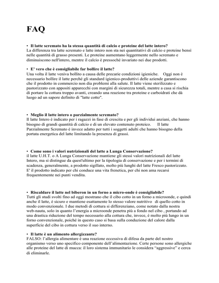 FAQ • Il latte scremato ha la stessa quantità di calcio e proteine del latte intero? La differenza tra latte scremato e latte intero non sta nei quantitativi di calcio e proteine bensì nelle quantità di grasso presenti. Le proteine aumentano leggermente nello scremato e diminuiscono nell'intero, mentre il calcio è pressoché invariato nei due prodotti. • E' vero che è consigliabile far bollire il latte? Una volta il latte veniva bollito a causa delle precarie condizioni igieniche. Oggi non è necessario bollire il latte perché gli standard igienico-produttivi delle aziende garantiscono che il prodotto in commercio non dia problemi alla salute. Il latte viene sterilizzato e pastorizzato con appositi apparecchi con margini di sicurezza totali, mentre a casa si rischia di portare la cottura troppo avanti, creando una reazione tra proteine e carboidrati che dà luogo ad un sapore definito di "latte cotto". • Meglio il latte intero o parzialmente scremato? Il latte Intero è indicato per i ragazzi in fase di crescita e per gli individui anziani, che hanno bisogno di grandi quantità di calcio e di un elevato contenuto proteico. Il latte Parzialmente Scremato è invece adatto per tutti i soggetti adulti che hanno bisogno della portata energetica del latte limitando la presenza di grassi. • Come sono i valori nutrizionali del latte a Lunga Conservazione? il latte U.H.T. o A Lunga Conservazione mantiene gli stessi valori nutrizionali del latte Intero, ma si distingue da quest'ultimo per la tipologia di conservazione e per i termini di scadenza, generalmente, a prodotto sigillato, molto più lunghi del latte Fresco pastorizzato. E' il prodotto indicato per chi conduce una vita frenetica, per chi non ama recarsi frequentemente nei punti vendita. • Riscaldare il latte nel biberon in un forno a micro-onde è consigliabile? Tutti gli studi svolti fino ad oggi mostrano che il cibo cotto in un forno a microonde, e quindi anche il latte, è sicuro e mantiene esattamente lo stesso valore nutritivo di quello cotto in modo convenzionale. I due metodi di cottura si differenziano, come notato dalla nostra web-nauta, solo in quanto l’energia a microonde penetra più a fondo nel cibo , portando ad una drastica riduzione del tempo necessario alla cottura che, invece, è molto più lungo in un forno convenzionale, poiché in questo caso si basa sulla conduzione del calore dalla superficie del cibo in cottura verso il suo interno. • Il latte è un alimento allergizzante? FALSO: l’allergia alimentare è una reazione eccessiva di difesa da parte del nostro organismo verso uno specifico componente dell’alimentazione. Certe persone sono allergiche alle proteine del latte di mucca: il loro sistema immunitario le considera “aggressive” e cerca di eliminarle. • Il latte è troppo acido, può far male allo stomaco? FALSO: il latte è neutro. Non dovrebbe pertanto essere responsabile del mal di stomaco nelle persone sensibili agli alimenti acidi. Al contrario, può causare mal di pancia o gonfiore, in questo caso si parla di intolleranza al lattosio. Questa intolleranza si spiega con un’insufficienza o addirittura assenza di un enzima digestivo chiamato lattasi che ha il compito di trasportare il lattosio nell’intestino. In questi casi l’intervento di un medico specialista vi aiuterà e vi aiuterà. Queste persone trovano in commercio vari tipi di latte a basso contenuto di lattosio o prodotti come latte fermentato, yogurt e formaggi che ne contengono poco. • Il latte favorisce l’insorgere di certi tumori? FALSO: il cancro è una malattia plurifattoriale. Non è ragionevole pensare che un solo alimento ne favorisca la comparsa.