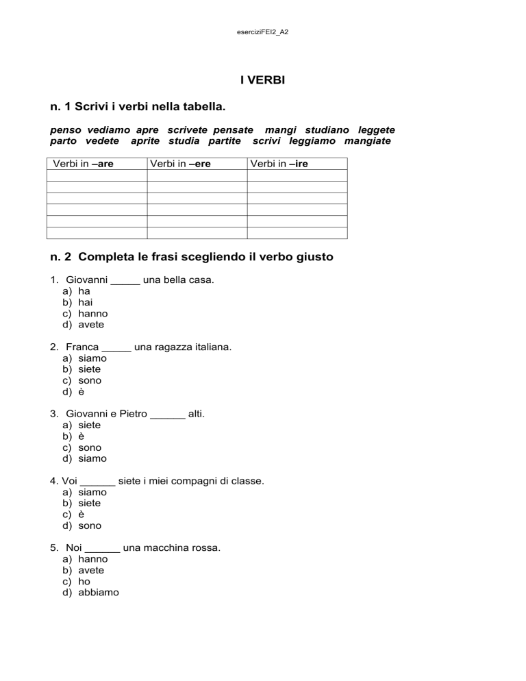 eserciziFEI2_A2 I VERBI n. 1 Scrivi i verbi nella tabella. penso vediamo apre scrivete pensate mangi studiano leggete parto vedete aprite studia partite scrivi leggiamo mangiate Verbi in –are Verbi in –ere Verbi in –ire n. 2 Completa le frasi scegliendo il verbo giusto 1. Giovanni _____ una bella casa. a) ha b) hai c) hanno d) avete 2. Franca _____ una ragazza italiana. a) siamo b) siete c) sono d) è 3. Giovanni e Pietro ______ alti. a) siete b) è c) sono d) siamo 4. Voi ______ siete i miei compagni di classe. a) siamo b) siete c) è d) sono 5. Noi ______ una macchina rossa. a) hanno b) avete c) ho d) abbiamo eserciziFEI2_A2 n. 3 Completa le frasi con il verbo fare 1. Io _______ l'idraulico. a) fate b) facciamo c) faccio d) fanno 2. Voi _______ le insegnanti. a) fate b) faccio c) fai d) facciamo 3. Noi _______ i medici. a) fate b) facciamo c) fanno d) fai 4. Tu _____ il meccanico. a) faccio b) fate c) facciamo d) fai 5. Essi _______ i postini. a) fanno b) fai c) faccio d) facciamo n. 4 Completa le frasi scegliendo tra i verbi venire, andare e stare 1. Oggi ____ a casa e non voglio uscire. a) vengo b) sto c) vado 2. Io non _____ al cinema con voi e resto qui. a) sto b) vengo c) vado 3. Voi _____ avanti. Dopo arriviamo noi. a) state b) venite c) andate 4. Noi ______ sempre a correre nel parco. eserciziFEI2_A2 a) veniamo b) stiamo c) andiamo 5. Tu _______ troppo tento in casa. a) stai b) vai c) vieni n. 5 Completa le frasi con il verbo che manca Es.: Tu (entrare) _______ in casa. Tu entri in casa. 1. Io (salire) ____ le scale. 2. Tu (entrare)_______ al cinema, io aspetto gli amici fuori e (entrare)______ dopo. 3. Loro (uscire) _______ da casa alle otto. 4. Lui (scendere) ______ le scale di corsa per non perdere il treno. 5. Tu (scendere)______ queste scale. Io (scendere)________ le scale che sono là in fondo. Ci vediamo al piano di sotto e (uscire)_____ insieme dal negozio. n.6 Inserisci le forme verbali che mancano. Anna (andare) ________ al supermercato per comperare un po’ di frutta. Il supermercato (aprire)__________ alle otto. Anna (volere)______ andare presto perché (dovere) _______ fare la spesa per tutta la settimana. Nel supermercato ci (essere) _______ due piani. Al piano superiore c’(essere)_____ il reparto alimentari. Al piano terra ci (essere) ______ i vestiti, la cartoleria e i profumi. Anna (salire) _____ le scale mobili e (andare) ______ direttamente al piano superiore. Compra tutte le cose che le servono e (fare) _______la fila alla cassa. Quando (uscire)_____ dal supermercato (essere)_______ ancora molto presto, allora decide di rientrare e di fare un giro al piano dei vestiti e dei profumi.
