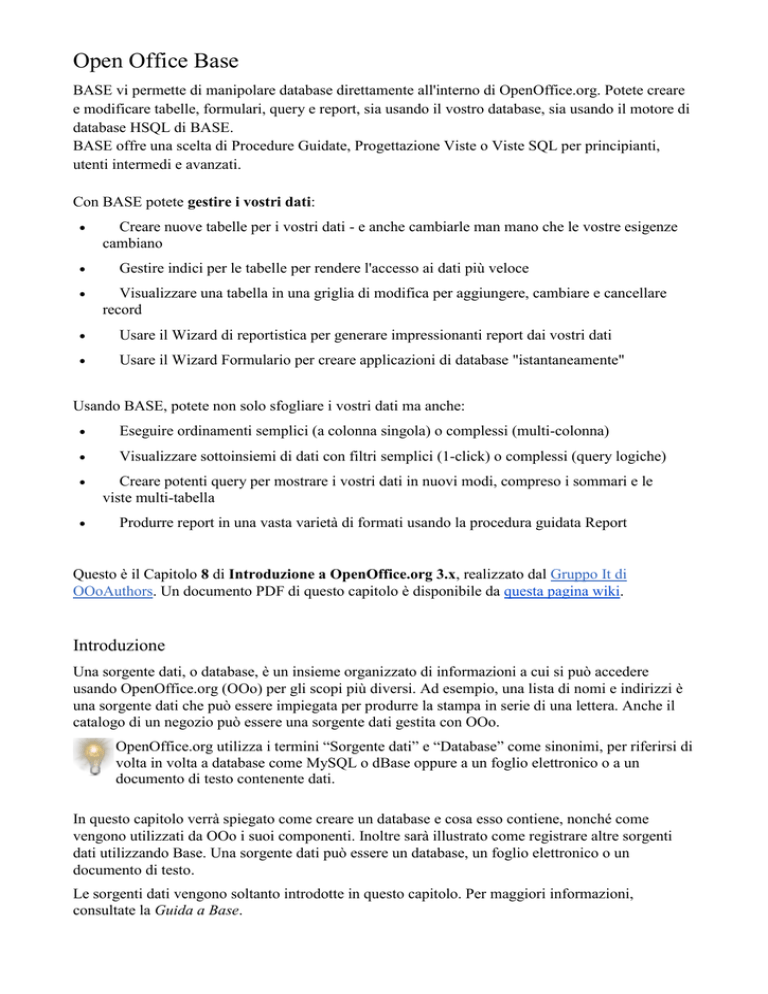 Open Office Base BASE vi permette di manipolare database direttamente all'interno di OpenOffice.org. Potete creare e modificare tabelle, formulari, query e report, sia usando il vostro database, sia usando il motore di database HSQL di BASE. BASE offre una scelta di Procedure Guidate, Progettazione Viste o Viste SQL per principianti, utenti intermedi e avanzati. Con BASE potete gestire i vostri dati: Creare nuove tabelle per i vostri dati - e anche cambiarle man mano che le vostre esigenze cambiano Gestire indici per le tabelle per rendere l'accesso ai dati più veloce Visualizzare una tabella in una griglia di modifica per aggiungere, cambiare e cancellare record Usare il Wizard di reportistica per generare impressionanti report dai vostri dati Usare il Wizard Formulario per creare applicazioni di database "istantaneamente" Usando BASE, potete non solo sfogliare i vostri dati ma anche: Eseguire ordinamenti semplici (a colonna singola) o complessi (multi-colonna) Visualizzare sottoinsiemi di dati con filtri semplici (1-click) o complessi (query logiche) Creare potenti query per mostrare i vostri dati in nuovi modi, compreso i sommari e le viste multi-tabella Produrre report in una vasta varietà di formati usando la procedura guidata Report Questo è il Capitolo 8 di Introduzione a OpenOffice.org 3.x, realizzato dal Gruppo It di OOoAuthors. Un documento PDF di questo capitolo è disponibile da questa pagina wiki. Introduzione Una sorgente dati, o database, è un insieme organizzato di informazioni a cui si può accedere usando OpenOffice.org (OOo) per gli scopi più diversi. Ad esempio, una lista di nomi e indirizzi è una sorgente dati che può essere impiegata per produrre la stampa in serie di una lettera. Anche il catalogo di un negozio può essere una sorgente dati gestita con OOo. OpenOffice.org utilizza i termini “Sorgente dati” e “Database” come sinonimi, per riferirsi di volta in volta a database come MySQL o dBase oppure a un foglio elettronico o a un documento di testo contenente dati. In questo capitolo verrà spiegato come creare un database e cosa esso contiene, nonché come vengono utilizzati da OOo i suoi componenti. Inoltre sarà illustrato come registrare altre sorgenti dati utilizzando Base. Una sorgente dati può essere un database, un foglio elettronico o un documento di testo. Le sorgenti dati vengono soltanto introdotte in questo capitolo. Per maggiori informazioni, consultate la Guida a Base. OOo Base usa HSQL come motore database. Tutti i file creati da questo motore vengono custoditi in un file compresso, in cui vengono inclusi i formulari del database. Un database è costituito da un certo numero di campi, ognuno dei quali contiene una parte dei dati. Ogni tabella del database è costituita da un gruppo di campi. Al momento di creare una tabella, vengono determinate anche le caratteristiche di ogni suo campo. I Formulari servono ad inserire i dati nei rispettivi campi di una o più tabelle associate ad ognuno di essi; possono essere anche usati per visualizzare i campi della tabella (o tabelle) loro associate. Una ricerca crea una nuova tabella, prelevando i dati che ci interessano da quelle già esistenti, in base a come viene impostata. Un rapporto organizza le informazioni contenute nei campi di una ricerca in un documento, secondo le vostre necessità. Per lavorare con i database in OOo occorre aver installato il Java Runtime Environment (JRE) di Sun. Se non lo avete installato sul vostro computer, potete scaricarlo da www.java.com ed installarlo seguendo le istruzioni presenti sul sito. Prestate attenzione al numero di versione, che deve essere 5.0 o superiore. Per registrare Java in OOo, utilizzate Strumenti > Opzioni > OpenOffice.org > Java. La versione di JRE per Windows non può essere usata, mentre possono essere usate tutte le altre. Base crea database relazionali. Ciò rende abbastanza semplice la creazione di database nei quali i campi dati si trovano in relazione tra loro. Ad esempio, consideriamo il database di una biblioteca. Esso conterrà un campo per i nomi degli autori ed un altro campo per i titoli dei libri. Vi è una relazione evidente tra l'insieme degli autori e quello dei libri: ovvero, la biblioteca potrà avere più di un libro dello stesso autore. Questo è ciò che viene definito relazione uno a molti: un solo autore e più libri. La maggior parte, se non tutte le relazioni in un database sono di questo tipo. Consideriamo un database per gli impiegati della stessa biblioteca. Uno dei campi contiene i nomi degli impiegati, mentre altri contengono il numero di codice fiscale e altri dati personali. La relazione tra i nomi ed i numeri di codice fiscale è di tipo “uno a uno”: ad ogni nome corrisponde un solo numero di codice fiscale. Se avete dimestichezza con gli insiemi matematici, un database relazionale può facilmente essere spiegato attraverso i termini loro propri: elementi, sottoinsiemi, unioni, ed intersezioni. I campi di un database costituiscono gli elementi; le tabelle costituiscono i sottoinsiemi; le relazioni vengono definite in termini di unioni ed intersezioni tra i sottoinsiemi (tabelle). Per spiegare come lavorare su un database, ne creeremo uno riguardante le spese per un automobile. Durante il processo di costruzione spiegheremo come lavora un database. Il primo passo nella creazione di un database consiste nel porsi una serie di domande. Scrivete le domande e lasciate tra di esse uno spazio libero dove successivamente inserirete le risposte; alcune tra queste dovrebbero essere abbastanza ovvie, prendendosi il giusto tempo per pensarci. Potrebbe essere necessario ripetere più volte questo procedimento perché tutto diventi chiaro nella vostra mente e sulla carta. Usare un file di testo per scrivere domande e risposte rende più semplice spostare le domande, aggiungerne di nuove e/o cambiare le risposte. Di seguito sono elencate alcune domande e risposte che ho elaborato prima di creare il database sull