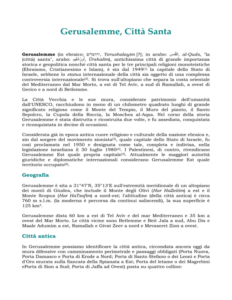 Gerusalemme, Città Santa Gerusalemme (in ebraico: ירושלים, Yerushalayim [?]; in arabo: سدُقلا, al-Quds, "la (città) santa", arabo: ش ورُأ ْ ِل َ م ق, Ūrshalīm), antichissima città di grande importanza storica e geopolitica nonché città santa per le tre principali religioni monoteistiche (Ebraismo, Cristianesimo e Islam), è sin dal 1949[1] la capitale dello Stato di Israele, sebbene lo status internazionale della città sia oggetto di una complessa controversia internazionale[2]. Si trova sull'altopiano che separa la costa orientale del Mediterraneo dal Mar Morto, a est di Tel Aviv, a sud di Ramallah, a ovest di Gerico e a nord di Betlemme. La Città Vecchia e le sue mura, considerate patrimonio dell'umanità dall'UNESCO, racchiudono in meno di un chilometro quadrato luoghi di grande significato religioso come il Monte del Tempio, il Muro del pianto, il Santo Sepolcro, la Cupola della Roccia, la Moschea al-Aqsa. Nel corso della storia Gerusalemme è stata distrutta e ricostruita due volte, e fu assediata, conquistata e riconquistata in decine di occasioni. Considerata già in epoca antica cuore religioso e culturale della nazione ebraica e, sin dal sorgere del movimento sionista[3], quale capitale dello Stato di Israele, fu così proclamata nel 1950 e designata come tale, completa e indivisa, nella legislazione israeliana il 30 luglio 1980[4]. I Palestinesi, di contro, rivendicano Gerusalemme Est quale propria capitale[5]. Attualmente le maggiori autorità giuridiche e diplomatiche internazionali considerano Gerusalemme Est quale territorio occupato[6]. Geografia Gerusalemme è sita a 31°47′N, 35°13′E sull'estremità meridionale di un altopiano dei monti di Giudea, che include il Monte degli Olivi (Har HaZeitim) a est e il Monte Scopus (Har HaTzofim) a nord-est; l'altitudine (della città antica) è circa 760 m s.l.m. (la moderna è percorsa da continui saliscendi), la sua superficie è 125 km². Gerusalemme dista 60 km a est di Tel Aviv e del mar Mediterraneo e 35 km a ovest del Mar Morto. Le città vicine sono Betlemme e Beit Jala a sud, Abu Dis e Maale Adumim a est, Ramallah e Givat Zeev a nord e Mevaseret Zion a ovest. Città antica In Gerusalemme possiamo identificare la città antica, circondata ancora oggi da mura difensive con camminamento perimetrale e passaggi obbligati (Porta Nuova, Porta Damasco e Porta di Erode a Nord; Porta di Santo Stefano o dei Leoni e Porta d'Oro murata sulla fiancata della Spianata a Est; Porta del letame o dei Magrebini ePorta di Sion a Sud; Porta di Jaffa ad Ovest) posta su quattro colline: a NordOvest è presente il monte Golgota, che con una propaggine meridionale detta "sperone centrale", si insinua tra la valle del Tyropoeon e la valle trasversale. Lo sperone centrale è stato, fin dai tempi antichi, sede di mercato, difeso dalle Mura di Manasse nel 650 a.C. circa. Il Golgota fu usato stabilmente dai Romani per le crocifissioni, ai tempi extra muras. a NordEst un complesso collinare che, col rilievo di NordOvest, fu compreso nelle mura della città in epoca romana, sotto Tito, prendendo il nome di "Città Nuova". a SudOvest c'è una grossa collina (detta "di Gareb") che raggiunge i 770 m s.l.m., le cui falde meridionali e occidentali costituiscono la valle della Geenna. Il punto più basso di questa è alla confluenza col Cedron, e risulta intorno ai 600mlsm. A Nord si trova la valle trasversale che divide la collina di Gareb dai promontori settentrionali. In questa fu costruito l'acquedotto superiore (V-VI secolo a.C.), che portava le acque alla piscina di Migdal o Amygdalon. Già in periodo gebuseo la collina di Gareb prende nome di Urusalim. a SudEst abbiamo il complesso Sion-Ophel-Moria: si tratta di un rilievo a forma di clava con asse NordSud, la parte più grossa e alta (raggiunge i 750 m s.l.m.) rivolta a Nord. È individuato dalla valle del fiume Cedron sul lato Est, e dalla valle centrale del Tyropoeon a Ovest. Sion è la parte più bassa, il manico di questa clava, e qui fu fondato il nucleo originario della città. L'Ophel, spesso chiamato "Sion" per estensione del termine, è il nome dato al pendio che sale al monte Moriah, dov'è la spianata delle moschee (detta anche spianata del Tempio). Sebbene Sion e Ophel costituissero il nucleo originario, attualmente si trovano al di fuori delle mura che individuano la cosiddetta città vecchia. Clima Gerusalemme gode di un clima Mediterraneo, con estati calde e secche e inverni freschi e umidi (anche con innevamento sporadico tra gennaio e marzo). Il mese più freddo è gennaio secondo le serie storiche (temperatura media: 8 °C) ma con deciso e costante spostamento negli ultimi anni verso febbraio o addirittura la prima decade di marzo, i più caldi luglio e agosto (temperatura media: 23 °C); l'escursione termica tra giorno e notte è notevole: le sere sono tipicamente fresche anche in estate. Le precipitazioni annue medie toccano i 590 millimetri, concentrandosi tra ottobre e maggio (particolarmente tra gennaio e marzo). Nei restanti mesi non è raro avere completa assenza di pioggia. Una grande percentuale delle case antiche è dotata di reservoirs (cisterne sotterranee) per la raccolta e conservazione dell'acqua e la quasi totalità è dotata di serbatoi esterni sui tetti. La città pesca inoltre acqua fino a 2000 mt di profondità. Diffusa la tecnologia del solare, in espansione il fotovoltaico. L'inquinamento dell'aria, ampiamente mitigato dal clima collinare e dal vento costante, deriva principalmente dal traffico automobilistico (responsabile del pesante inquinamento acustico), indiscipliato ed eccessivo rispetto alla capacità di strade costruite in tempi antichi, e non tanto dall'industria. Storia Le origini di Gerusalemme risalgono all'età della pietra, ma viene menzionata in alcuni testi egiziani del II millennio a.C. e in alcune lettere risalenti al 1400 a.C. . La città rimase occupata dal clan amorrita dei Gebusei (1000 a.C. circa) fino al