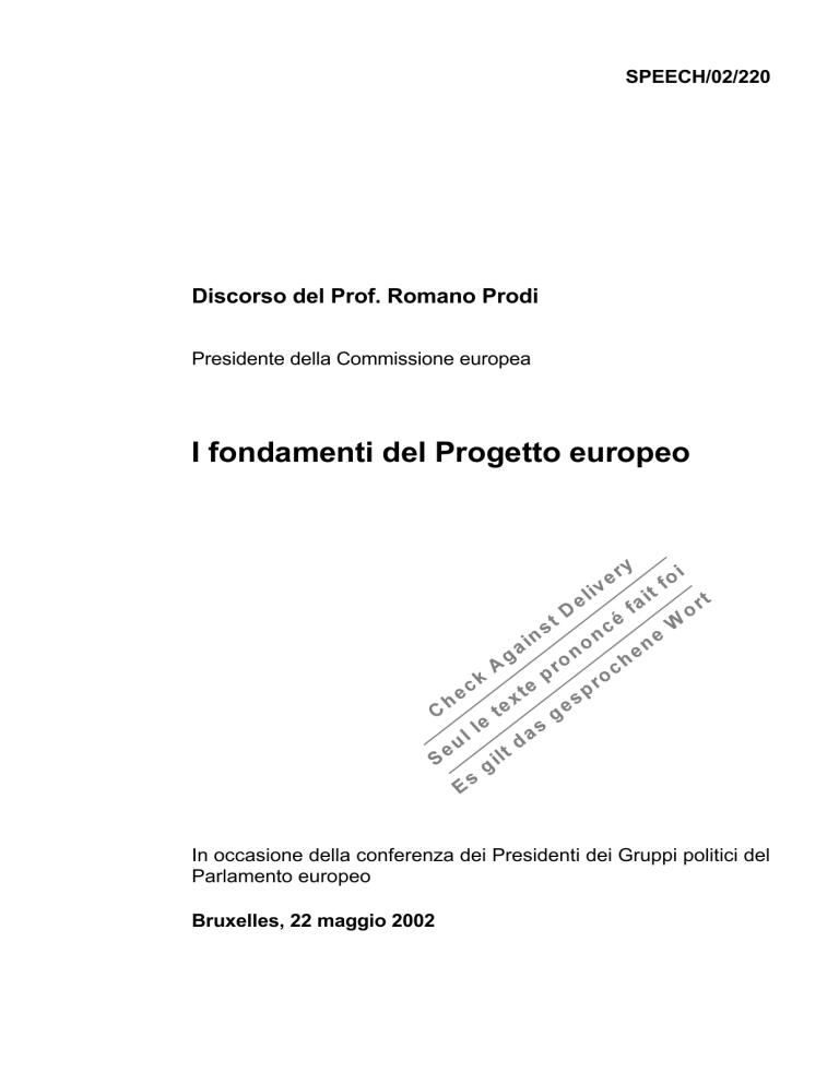 SPEECH/02/220 Discorso del Prof. Romano Prodi Presidente della Commissione europea I fondamenti del Progetto europeo In occasione della conferenza dei Presidenti dei Gruppi politici del Parlamento europeo Bruxelles, 22 maggio 2002 Presidente Cox, onorevoli parlamentari, Con la Comunicazione sul "Progetto europeo" approvata quest'oggi intendiamo contribuire al dibattito generale. In una fase ulteriore, ci occuperemo nello specifico delle sfide istituzionali. Mi fa piacere oggi iniziare un dibattito diretto e aperto sul primo di questi contributi: il "Progetto per l'Unione europea" della Commissione. Con questa prima Comunicazione la Commissione non pretende esaurire il dibattito sul Progetto europeo né rispondere a tutte le sfide che ci attendono. Il documento ha lo scopo di delineare la visione complessiva della Commissione sul futuro dell'Unione europea. Voglio qui ribadire un mio convincimento: è giunto il momento di lanciare un grande progetto politico, in cui i cittadini possano identificarsi, con cui si possano confrontare e capace di offrire una soluzione politica forte e concreta alle incertezze, alla paure e ai timori che stanno percorrendo l’Europa. Tale progetto deve accogliere la grande sfida di porre le basi per una democrazia sovranazionale. L'obiettivo principale della Convenzione è quindi quello di elaborare una proposta ambiziosa che tracci, a grandi linee e per la prima volta, un quadro costituzionale per un'Europa unita e democratica. Un'Europa che dia le risposte giuste alle nuove aspettative dei cittadini europei, che sappia gestire l'allargamento e che svolga il ruolo che le spetta nel mondo. Questa costituzione dovrà segnare la nascita dell'Europa come entità politica matura e compiuta. L'Unione deve accettare questa grande sfida e muovere i primi passi verso lo sviluppo di un'identità politica nei campi della politica economica, della politica estera, della giustizia e della sicurezza. In tutte quelle aree, cioè, nelle quali i cittadini chiedono una maggiore presenza dell'Europa. Si tratta di una richiesta decisa e inequivocabile che proviene da tutti gli Stati membri. Occorre pertanto rafforzare con decisione la dimensione politica dell'Unione. Ciò significa consolidare la legittimità democratica e costruire un'Unione più coerente, più efficace e più imparziale. Ritengo che al cuore del Progetto europeo si debba collocare il concetto di cittadinanza europea. Noi tutti siamo cittadini di un'Unione fondata sui principi di libertà, democrazia, diritti umani, libertà fondamentali e stato di diritto, principi questi che sono tutti compresi nella Carta dei diritti fondamentali. La cittadinanza europea non si sostituisce a quella nazionale, ma si aggiunge ad essa come una nuova dimensione e la rafforza. La cittadinanza europea ci rende più ricchi allargando le prospettive e gli orizzonti di tutti noi. L'Europa di domani continuerà a fondarsi su questi principi e grazie ad essi continuerà a prosperare. Noi dobbiamo conservare questo semplice principio come fondamento di tutte le nostre iniziative. 2 Costruire una società democratica europea non significa affatto costruire un super Stato europeo, significa costruire una società in cui si diventa europei attraverso l’esercizio dei diritti e dei doveri di cittadinanza europea. Una società in cui potremo adottare nuove soluzioni per risolvere problemi comuni e per rispondere alle comuni preoccupazioni dei nostri cittadini. La storia dell'unificazione del continente finalmente compiuta ce lo impone. L'allargamento impone una definizione più chiara di ciò che vogliamo fare in un'Europa a venticinque o più Stati. La globalizzazione ce lo impone. Dobbiamo dimostrare con il nostro lavoro quotidiano che l'Europa è e deve essere sempre di più la risposta democratica a tali fenomeni e non può essere vista come complice o addirittura come causa di una globalizzazione spietata. I nostri cittadini lo reclamano: le stesse manifestazioni di rifiuto dell’Europa sono in gran parte legate a problemi e situazioni in cui l’Europa non è ancora abbastanza presente. Sono la conseguenza, il prezzo, della “non Europa”, o di un’Europa che deve ormai diventare matura. Ecco il punto di partenza del progetto della Commissione europea: l'Unione europea deve assumersi nuove responsabilità. E queste nuove responsabilità impongono un approfondimento del processo di integrazione. Su questo sfondo, la nostra Comunicazione individua tre compiti per l'Unione del futuro. L'Europa deve difendere un modello equilibrato di società capace di conciliare la prosperità economica e la solidarietà attraverso il dialogo; l'Europa deve garantire la sicurezza di tutti senza compromettere i principi di libertà e di giustizia; l'Europa deve diventare un attore globale sulla scena internazionale. L’euro è ormai un bene pubblico europeo, un simbolo e una prova concreta dei benefici derivanti del processo di integrazione. Ora che l'euro è moneta corrente, è chiaro che l'Unione europea deve continuare a difendere un modello equilibrato di società e che deve essere in grado di conciliare la prosperità economica e la solidarietà. Dobbiamo restare fedeli al modello sociale europeo fondato sul dialogo e sulla giustizia sociale. Ciò significa proseguire l'opera di costruzione del mercato interno e rafforzare il coordinamento economico. Ciò significa rilanciare alcune politiche di settore e favorire le politiche attive del mercato del lavoro per completare la strategia adottata dal Consiglio di Lisbona nel 2000 e riaffermata dal recente Consiglio di Barcellona. Ciò significa sviluppare lo stile di vita europeo evitando disparità eccessive che disgregano la nostra società. Dobbiamo costruire metodi più attivi di coordinamento economico, fondati su decisioni di politica economica più coerenti. Il coordinamento della politica economica deve permetterci di valutare, in modo congiunto, a livello europeo, la situazione economica 
