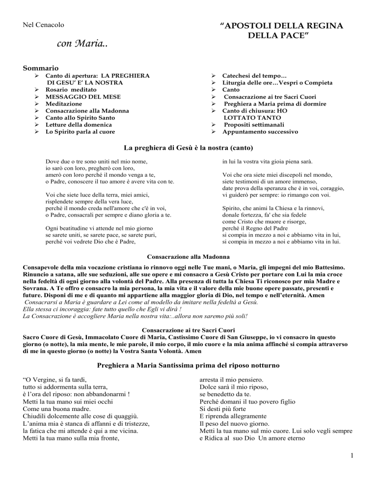 “APOSTOLI DELLA REGINA DELLA PACE” Nel Cenacolo con Maria.. Sommario Canto di apertura: LA PREGHIERA DI GESU’ E’ LA NOSTRA Rosario meditato MESSAGGIO DEL MESE Meditazione Consacrazione alla Madonna Canto allo Spirito Santo Letture della domenica Lo Spirito parla al cuore Catechesi del tempo… Liturgia delle ore…Vespri o Compieta Canto Consacrazione ai tre Sacri Cuori Preghiera a Maria prima di dormire Canto di chiusura: HO LOTTATO TANTO Propositi settimanali Appuntamento successivo La preghiera di Gesù è la nostra (canto) Dove due o tre sono uniti nel mio nome, io sarò con loro, pregherò con loro, amerò con loro perché il mondo venga a te, o Padre, conoscere il tuo amore è avere vita con te. Voi che siete luce della terra, miei amici, risplendete sempre della vera luce, perché il mondo creda nell'amore che c'è in voi, o Padre, consacrali per sempre e diano gloria a te. Ogni beatitudine vi attende nel mio giorno se sarete uniti, se sarete pace, se sarete puri, perché voi vedrete Dio che è Padre, in lui la vostra vita gioia piena sarà. Voi che ora siete miei discepoli nel mondo, siete testimoni di un amore immenso, date prova della speranza che è in voi, coraggio, vi guiderò per sempre: io rimango con voi. Spirito, che animi la Chiesa e la rinnovi, donale fortezza, fa' che sia fedele come Cristo che muore e risorge, perché il Regno del Padre si compia in mezzo a noi e abbiamo vita in lui, si compia in mezzo a noi e abbiamo vita in lui. Consacrazione alla Madonna Consapevole della mia vocazione cristiana io rinnovo oggi nelle Tue mani, o Maria, gli impegni del mio Battesimo. Rinuncio a satana, alle sue seduzioni, alle sue opere e mi consacro a Gesù Cristo per portare con Lui la mia croce nella fedeltà di ogni giorno alla volontà del Padre. Alla presenza di tutta la Chiesa Ti riconosco per mia Madre e Sovrana. A Te offro e consacro la mia persona, la mia vita e il valore della mie buone opere passate, presenti e future. Disponi di me e di quanto mi appartiene alla maggior gloria di Dio, nel tempo e nell’eternità. Amen Consacrarsi a Maria è guardare a Lei come al modello da imitare nella fedeltà a Gesù. Ella stessa ci incoraggia: fate tutto quello che Egli vi dirà ! La Consacrazione è accogliere Maria nella nostra vita:..allora non saremo più soli! Consacrazione ai tre Sacri Cuori Sacro Cuore di Gesù, Immacolato Cuore di Maria, Castissimo Cuore di San Giuseppe, io vi consacro in questo giorno (o notte), la mia mente, le mie parole, il mio corpo, il mio cuore e la mia anima affinché si compia attraverso di me in questo giorno (o notte) la Vostra Santa Volontà. Amen Preghiera a Maria Santissima prima del riposo notturno “O Vergine, si fa tardi, tutto si addormenta sulla terra, è l’ora del riposo: non abbandonarmi ! Metti la tua mano sui miei occhi Come una buona madre. Chiudili dolcemente alle cose di quaggiù. L’anima mia è stanca di affanni e di tristezze, la fatica che mi attende è qui a me vicina. Metti la tua mano sulla mia fronte, arresta il mio pensiero. Dolce sarà il mio riposo, se benedetto da te. Perché domani il tuo povero figlio Si desti più forte E riprenda allegramente Il peso del nuovo giorno. Metti la tua mano sul mio cuore. Lui solo vegli sempre e Ridica al suo Dio Un amore eterno 1 Messaggio del 2 agosto 2011 (a Mirjana) “Cari figli, oggi vi invito a rinascere nella preghiera ed a diventare con mio Figlio, attraverso lo Spirito Santo, un nuovo popolo. Un popolo che sa che se perde Dio ha perso se stesso. Un popolo che sa che, nonostante tutte le sofferenze e le prove, con Dio è sicuro e salvo. Vi invito a radunarvi nella famiglia di Dio ed a rafforzarvi con la forza del Padre. Come singoli, figli miei, non potete fermare il male che vuole regnare nel mondo e distruggerlo. Ma per mezzo della volontà di Dio tutti insieme con mio Figlio potete cambiare tutto e guarire il mondo. Vi invito a pregare con tutto il cuore per i vostri pastori, perché mio Figlio li ha scelti. Vi ringrazio.” Messaggio del 25 luglio 2011 “Cari figli, questo tempo sia per voi tempo di preghiera e di silenzio. Riposate il vostro corpo e il vostro spirito, che siano nell’amore di Dio. Permettetemi figlioli di guidarvi, aprite i vostri cuori allo Spirito Santo perchè tutto il bene che è in voi fiorisca e fruttifichi il centuplo. Iniziate e terminate la giornata con la preghiera del cuore. Grazie per aver risposto alla mia chiamata.” “Giuseppe, figlio di Davide, non temere di prendere con te Maria, tua sposa”. Giov. Paolo II Giuseppe, sposo della Vergine Madre di Dio, insegnaci incessantemente tutta la verità divina e tutta la dignità umana contenute nella vocazione di sposi e di genitori! San Giuseppe, ottienici da Dio, che cooperiamo, con costanza, con la grazia del grande sacramento nel quale uomo e donna si promettono reciprocamente l’amore, la fedeltà e l’onestà coniugale, fino alla morte! San Giuseppe, uomo giusto, insegnaci l’amore responsabile verso coloro che Dio ci affida in modo particolare: l’amore tra i coniugi, l’amore tra i genitori e coloro ai quali i genitori danno la vita! Insegnaci la responsabilità verso ogni vita, dal primo momento del concepimento, fino all’ultimo istante su questa terra. Insegnaci un gran rispetto per il dono della vita. Insegnaci ad adorare profondamente il Creatore, padre e datore della vita. San Giuseppe, patrono del lavoro umano, aiutaci in ogni lavoro che è vocazione dell’uomo sulla terra. Insegnaci a risolvere i difficili problemi collegati col lavoro nella vita delle generazioni, a cominciare dai giovani, e nella vita delle società. San Giuseppe, protettore della Chiesa preghiamo Dio con queste parole: “O Dio onnipotente, che hai voluto affidare gli inizi della nostra redenzione alla custodia premurosa di san Giuseppe, per sua intercessione concedi alla tua Chiesa di cooperare fedelmente al compimento dell’opera di salvezza”. Preghiera per i sacerdoti ISPIRATA DAL SI