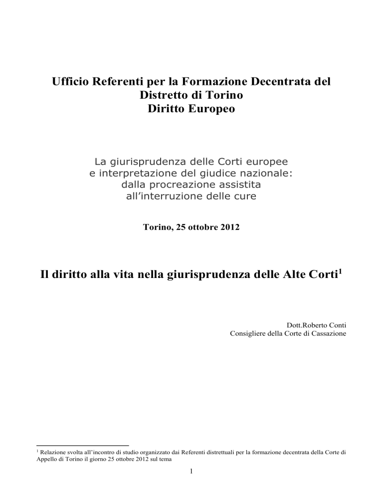 Ufficio Referenti per la Formazione Decentrata del Distretto di Torino Diritto Europeo La giurisprudenza delle Corti europee e interpretazione del giudice nazionale: dalla procreazione assistita all’interruzione delle cure Torino, 25 ottobre 2012 Il diritto alla vita nella giurisprudenza delle Alte Corti1 Dott.Roberto Conti Consigliere della Corte di Cassazione Relazione svolta all’incontro di studio organizzato dai Referenti distrettuali per la formazione decentrata della Corte di Appello di Torino il giorno 25 ottobre 2012 sul tema 1 1 INDICE 1.Diversità e pluralità di approcci al tema. 2.Il diritto alla vita nella CEDU. 3. L’intreccio fra diritto alla vita-art.2 CEDU- e autodeterminazione-art.8 CEDU-. 4.Dalla dottrina del consenso nella giurisprudenza della Corte dei diritti umani a proposito di vita, morte e…dintorni… 5. Corte dir. uomo, 1 aprile 2010, S. e H. c. Austria e Corte dir. Uomo, Grande Camera, 3 novembre 2011, S.e H. c. Austria. 6. A che serve la dottrina del consenso? 7. Il ruolo del giudice nelle vicende che ruotano attorno alla “vita”. Sfida fra legislatore e giudici o coordinata cooperazione?La concordia fra le Corti sul caso Englaro. 8. La giurisprudenza CEDU come fonte del diritto. 9.A mo’ di conclusione. 2 1.Diversità e pluralità di approcci al tema. Per affrontare il tema assegnatomi si potrebbero scegliere diverse prospettive, tutte assai accattivanti. Si potrebbe, ad esempio, muovere dall’esame di un caso particolare- la sentenza Englaro- e così proseguire nell’analisi del confronto dialogico tra Corte di Cassazione, Corte costituzionale,Corte diritti uomo per giungere all’esame del tema che guarda al ruolo del giudice e del legislatore sul tema del fine vita. Parimenti possibile sarebbe muovere dalla questione del quando comincia la vita cercando di individuare la o le fonti normative privilegiate capaci di sciogliere il nodo interpretativo e di sistematizzare dei principi di ordine generale, per poi verificare le scelte attuative del legislatore interno- anche in unap rospettiva de jure condendo-, quelle dei giudici nazionali in sede di applicazione della legislazione ordinaria, magari poi comparandole con quelle della Corte dei diritti umani o di altre Corti nazionali od internazionali. Si potrebbe, ancora, privilegiare una prospettiva didascalica o compilativa, fondata sull'esame della giurisprudenza della Corte europea dei diritti dell'uomo che si e' occupata di tematiche legate al fine vita o all'inizio della vita per poi enucleare, se possibile, una o più radici comuni all'interno di tali decisioni in modo da successivamente compararle con i meccanismi di protezione interna e vagliarne, eventualmente, le convergenze o le diversità per poi verificare gli effetti ultimi a livello di tutela giurisdizionale dei singoli. Mi interrogavo, anche, sull’utilità di rappresentare, in posizione neutrale, le forti contrapposizioni di ordine etico, morale e religioso che generalmente accompagnano tematiche di questo tipo e che anche nell’esperienza della formazione consiliare hanno spesso visto aspramente contrapposti esponenti dell’una o dell’altra corrente di pensiero.Io stesso ho avuto la ventura di coordinare un match fra i Professori D’Agostino e Mori particolarmente acceso. Nemmeno peregrino poteva risultare un approccio “di sistema” che, muovendo dalla particolare giornata che oggi si celebra, tenta di indagare sui rapporti fra ordinamento interno e carte dei diritti fondamentali, per poi verificare in concreto se esiste diversità di tutela rispetto al diritto alla vita ed a nascere - più o meno sano- tra il livello nazionale e quello sovranazionale e, in caso di esito positivo di tale test, vagliare le possibili logiche di composizione, richiamando il meccanismo gerarchico che dovrebbe governare, secondo la Corte costituzionale, i rapporti ordinamento internoCEDU, ovvero quello decisamente più rispettoso della dignità umana e della inconfigurabilita' di posizioni piramidali all'interno dei vari meccanismi di protezione dei diritti fondamentali che chi scrive predilige da tempo sulla base di talune coordinate mutuate da una dottrina assai attenta ai fenomeni dei meccanismi che governano i rapporti fra i sistemi, improntato al perseguimento del “maggior livello di tutela” dei diritti fondamentali. La personali riflessioni che seguono perseguono il tentativo, spero non velleitario, di considerare, in modo unitario, in tutto o in parte le prospettive nella duplice speranza di aiutare la riflessione di chi ascolta -e non certo di fornire risposte definitive- su temi talmente impegnativi da apparire a tratti imperscrutabili agli occhi di un qualsiasi accorto operatore di giustizia che ad essi si accosta, ma anche di dimostrare che il ruolo del giudiziario nel processo di attuazione e concretizzazione dei diritti fondamentali,anche grazie alla spinta vigorosa proveniente dalle giurisdizioni sovranazionaliCorte europea dei dirtti dell’uomo,Corte di Giustizia) è andato enormemente crescendo fino al punto da modificare, in fatto, le coordinate sulle quali i giuristi delle generazioni passate e della mia stessa generazione- che certo non è preistorica- hanno edificato il loro modo di essere giudici. 3 2.Il diritto alla vita nella CEDU. Suol dirsi che il diritto alla vita, tutelato dall’art.2 CEDU2, appartiene al c.d.nocciolo duro della Convenzione, esso contemplando una prerogativa che ogni Paese aderente deve sempre e comunque garantire, essendosi appunto in presenza di un “valore fondamentale delle società democratiche che formano il Consiglio d’Europa-cfr.Corte dir.uomo27 settembre 1995,Mc Cann e altri c.Regno Unito;in particolare v.Corte dir.uomo,9 novembre 2006, Luluyev c.Russia: “The Court reiterates that Article 2, which safeguards the right to life and sets out those circumstances in which deprivation of life may be justified, ranks as one of the most fundamental provisions in the Convention, to which 