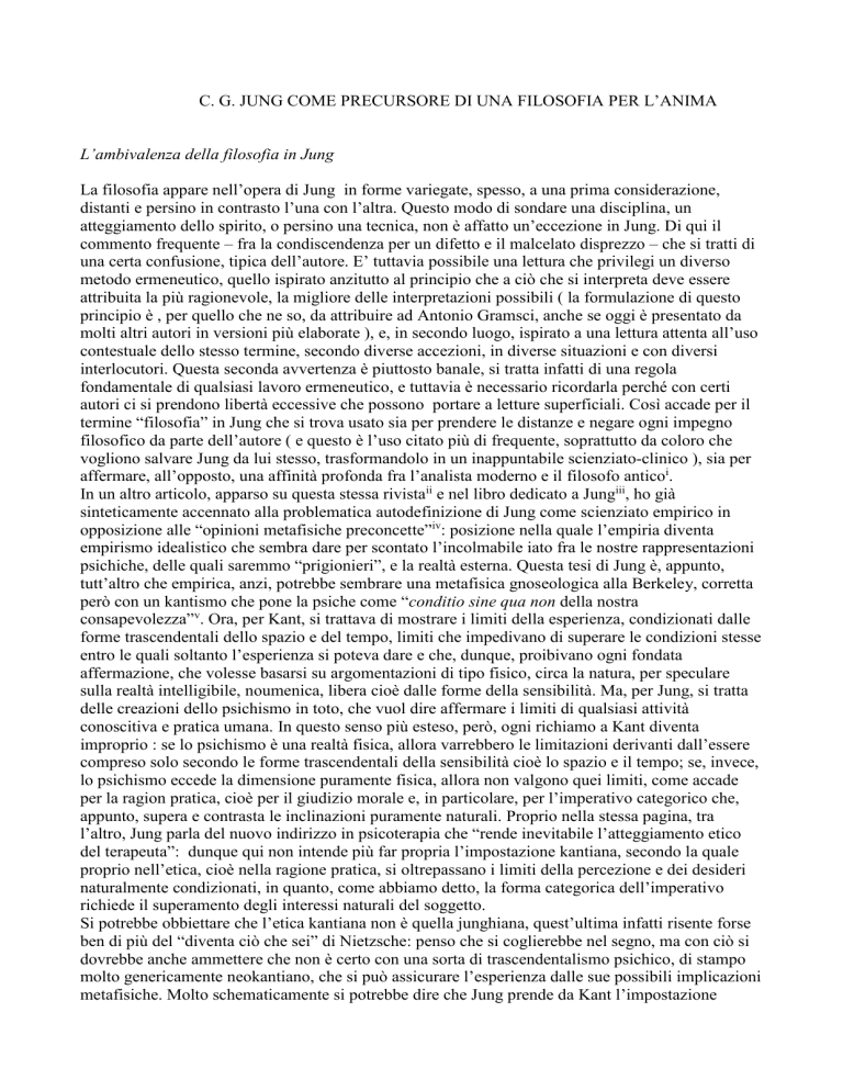 C. G. JUNG COME PRECURSORE DI UNA FILOSOFIA PER L’ANIMA L’ambivalenza della filosofia in Jung La filosofia appare nell’opera di Jung in forme variegate, spesso, a una prima considerazione, distanti e persino in contrasto l’una con l’altra. Questo modo di sondare una disciplina, un atteggiamento dello spirito, o persino una tecnica, non è affatto un’eccezione in Jung. Di qui il commento frequente – fra la condiscendenza per un difetto e il malcelato disprezzo – che si tratti di una certa confusione, tipica dell’autore. E’ tuttavia possibile una lettura che privilegi un diverso metodo ermeneutico, quello ispirato anzitutto al principio che a ciò che si interpreta deve essere attribuita la più ragionevole, la migliore delle interpretazioni possibili ( la formulazione di questo principio è , per quello che ne so, da attribuire ad Antonio Gramsci, anche se oggi è presentato da molti altri autori in versioni più elaborate ), e, in secondo luogo, ispirato a una lettura attenta all’uso contestuale dello stesso termine, secondo diverse accezioni, in diverse situazioni e con diversi interlocutori. Questa seconda avvertenza è piuttosto banale, si tratta infatti di una regola fondamentale di qualsiasi lavoro ermeneutico, e tuttavia è necessario ricordarla perché con certi autori ci si prendono libertà eccessive che possono portare a letture superficiali. Così accade per il termine “filosofia” in Jung che si trova usato sia per prendere le distanze e negare ogni impegno filosofico da parte dell’autore ( e questo è l’uso citato più di frequente, soprattutto da coloro che vogliono salvare Jung da lui stesso, trasformandolo in un inappuntabile scienziato-clinico ), sia per affermare, all’opposto, una affinità profonda fra l’analista moderno e il filosofo anticoi. In un altro articolo, apparso su questa stessa rivistaii e nel libro dedicato a Jungiii, ho già sinteticamente accennato alla problematica autodefinizione di Jung come scienziato empirico in opposizione alle “opinioni metafisiche preconcette”iv: posizione nella quale l’empiria diventa empirismo idealistico che sembra dare per scontato l’incolmabile iato fra le nostre rappresentazioni psichiche, delle quali saremmo “prigionieri”, e la realtà esterna. Questa tesi di Jung è, appunto, tutt’altro che empirica, anzi, potrebbe sembrare una metafisica gnoseologica alla Berkeley, corretta però con un kantismo che pone la psiche come “conditio sine qua non della nostra consapevolezza”v. Ora, per Kant, si trattava di mostrare i limiti della esperienza, condizionati dalle forme trascendentali dello spazio e del tempo, limiti che impedivano di superare le condizioni stesse entro le quali soltanto l’esperienza si poteva dare e che, dunque, proibivano ogni fondata affermazione, che volesse basarsi su argomentazioni di tipo fisico, circa la natura, per speculare sulla realtà intelligibile, noumenica, libera cioè dalle forme della sensibilità. Ma, per Jung, si tratta delle creazioni dello psichismo in toto, che vuol dire affermare i limiti di qualsiasi attività conoscitiva e pratica umana. In questo senso più esteso, però, ogni richiamo a Kant diventa improprio : se lo psichismo è una realtà fisica, allora varrebbero le limitazioni derivanti dall’essere compreso solo secondo le forme trascendentali della sensibilità cioè lo spazio e il tempo; se, invece, lo psichismo eccede la dimensione puramente fisica, allora non valgono quei limiti, come accade per la ragion pratica, cioè per il giudizio morale e, in particolare, per l’imperativo categorico che, appunto, supera e contrasta le inclinazioni puramente naturali. Proprio nella stessa pagina, tra l’altro, Jung parla del nuovo indirizzo in psicoterapia che “rende inevitabile l’atteggiamento etico del terapeuta”: dunque qui non intende più far propria l’impostazione kantiana, secondo la quale proprio nell’etica, cioè nella ragione pratica, si oltrepassano i limiti della percezione e dei desideri naturalmente condizionati, in quanto, come abbiamo detto, la forma categorica dell’imperativo richiede il superamento degli interessi naturali del soggetto. Si potrebbe obbiettare che l’etica kantiana non è quella junghiana, quest’ultima infatti risente forse ben di più del “diventa ciò che sei” di Nietzsche: penso che si coglierebbe nel segno, ma con ciò si dovrebbe anche ammettere che non è certo con una sorta di trascendentalismo psichico, di stampo molto genericamente neokantiano, che si può assicurare l’esperienza dalle sue possibili implicazioni metafisiche. Molto schematicamente si potrebbe dire che Jung prende da Kant l’impostazione critica, quanto alla gnoselogia in rapporto con il sapere scientifico, e prende da Nietzsche, depurato dagli aspetti inflazionati del suo pensiero, la tendenza a una morale individualizzatavi: mettendo insieme entrambi – e non si tratterebbe affatto di un’operazione facilmente giustificabile, anzi – cercherebbe di attestarsi su una posizione critica di ogni metafisica, sia nella considerazione dei fenomeni naturali oggetto delle scienze, sia nella considerazione dei fenomeni etici, morali, politici e religiosi. In ogni caso, come si sa dalla storia della filosofia da Hegel in poi, l’argomento del superamento della metafisica è forse il tema centrale della ricerca filosofica degli ultimi due secoli. Dunque, nel caso, ogni critica di Jung alla metafisica è inscrivibile entro le coordinate del pensiero filosofico, ma proprio dicendo questo diventa impossibile far valere l’equivalenza: metafisica uguale filosofia. Peraltro nessun metafisico mai ha preteso di trascurare l’empiria, anzi è proprio dall’esame dell’esperienza, per via della sua apparenza contraddittoria, che si tenta di superarla, individuando una dimensione di realtà che la giustifichi. Potremmo anche dire che la metafisica sta alla fisica come la metapsicologia sta alla psicologia. Tuttavi