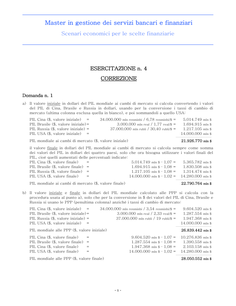 Master in gestione dei servizi bancari e finanziari Scenari economici per le scelte finanziarie ESERCITAZIONE n. 4 CORREZIONE Domanda n. 1 a) Il valore iniziale in dollari del PIL mondiale ai cambi di mercato si calcola convertendo i valori del PIL di Cina, Brasile e Russia in dollari, usando per la conversione i tassi di cambio di mercato (ultima colonna esclusa quella in bianco), e poi sommandoli a quello USA: PIL PIL PIL PIL Cina ($, valore iniziale) = Brasile ($, valore iniziale) = Russia ($, valore iniziale) = USA ($, valore iniziale) = 34.000.000 mln renminbi / 6,78 renminbi/$ = 3.000.000 mln real / 1,77 real/$ = 37.000.000 mln rubli / 30,40 rubli/$ = 5.014.749 1.694.915 1.217.105 14.000.000 mln $ mln $ mln $ mln $ —————————————————— PIL mondiale ai cambi di mercato ($, valore iniziale) 21.926.770 mln $ il valore finale in dollari del PIL mondiale ai cambi di mercato si calcola sempre come somma dei valori del PIL in dollari dei quattro paesi, solo che ora bisogna utilizzare i valori finali del PIL, cioè quelli aumentati delle percentuali indicate: PIL Cina ($, valore finale) = 5.014.749 mln $ · 1,07 = 5.365.782 mln $ PIL Brasile ($, valore finale) = 1.694.915 mln $ · 1,08 = 1.830.508 mln $ PIL Russia ($, valore finale) = 1.217.105 mln $ · 1,08 = 1.314.474 mln $ PIL USA ($, valore finale) = 14.000.000 mln $ · 1,02 = 14.280.000 mln $ —————————————————— PIL mondiale ai cambi di mercato ($, valore finale) 22.790.764 mln $ b) Il valore iniziale e finale in dollari del PIL mondiale calcolato alle PPP si calcola con la procedura usata al punto a), solo che per la conversione in $ dei valori del PIL di Cina, Brasile e Russia si usano le PPP (penultima colonna) anziché i tassi di cambio di mercato: PIL PIL PIL PIL Cina ($, valore iniziale) = Brasile ($, valore iniziale) = Russia ($, valore iniziale) = USA ($, valore iniziale) = 34.000.000 mln renminbi / 3,54 renminbi/$ = 3.000.000 mln real / 2,33 real/$ = 37.000.000 mln rubli / 19 rubli/$ = 9.604.520 1.287.554 1.947.368 14.000.000 mln $ mln $ mln $ mln $ —————————————————— PIL mondiale alle PPP ($, valore iniziale) PIL PIL PIL PIL Cina ($, valore finale) Brasile ($, valore finale) Cina ($, valore finale) USA ($, valore finale) 26.839.442 mln $ = = = = 9.604.520 1.287.554 1.947.368 14.000.000 · · mln $ · mln $ · mln $ mln $ 1,07 1,08 1,08 1,02 = = = = 10.276.836 1.390.558 2.103.158 14.280.000 mln $ mln $ mln $ mln $ —————————————————— PIL mondiale alle PPP ($, valore finale) 28.050.552 mln $ -1- c) La crescita del PIL mondiale si può calcolare a partire dai valori iniziali e finali e calcolandone l’incremento1, oppure utilizzando la formula che calcola la crescita come media ponderata delle crescite registrate nei singoli paesi, usando come peso il valore iniziale del PIL in dollari. Applicando il secondo metodo (quello richiesto nell’esercizio), per il PIL mondiale calcolato ai cambi di mercato la crescita vale: (0,02·14.000.000+0,07·5.014.749+0,08·1.694.915+0,08·1.217.105) —————————————————————————————————— = 3,94% (14.000.000+5.014.749+1.694.915+1.217.105) mentre per il PIL mondiale calcolato alle PPP vale: (0,02·14.000.000+0,07·9.604.520+0,08·1.287.554+0,08·1.947.368) —————————————————————————————————— = 4,51% (14.000.000+9.604.520+1.287.554+1.947.368) Domanda n. 2 a) In regime di cambi fissi, quindi con rischio di cambio nullo, gli converrà investire nel paese che garantisce un tasso di interesse maggiore, cioè negli USA. b) Riccardo dovrà convertire i suoi 50.000€ in dollari, ottenendo, al cambio dato, un ammontare pari a: X(t=0,$) = 50.000€·1,25$/€ = 62.500$ quindi investirà tale somma in una banca USA e dopo 1 anno preleverà: X(t=1,$) = 62.500$·1,05 = 65.625$ che riconvertiti in euro diventano: X(t=1,€) = 65.625$/1,25$/€ = 52.500€2 c) Se a fine anno il nuovo cambio sarà pari a 1,30 (quindi vi sarà stato un apprezzamento dell’Euro3), parte del maggior guadagno ottenuto investendo in USA grazie al maggior tasso di interesse sarà “mangiato” dalla perdita in conto cambio. Infatti, rifacendo i calcoli fatti al punto precedente ma utilizzando il nuovo cambio per la conversione finale si ottiene: X(t=0,$) = 50.000€·1,25$/€ = 62.500$ X(t=1,$) = 62.500$·1,05 = 65.625$ X(t=1,€) = 65.625$/1,30$/€ = 50.481€ (< 51.000€, cioè quanto otterrebbe investendo in Italia) Quindi, in presenza di simili previsioni sul cambio, a Riccardo converrà investire in Italia 4 così come ad un ipotetico investitore USA. d) In altre parole, dobbiamo trovare quel tasso di cambio C’ tale che i due montanti siano uguali, cioè tale che: 65.625$/C’ = 51.000€ C’ da cui: = 65.625$/51.000€ = 1,2868$/€ 1 La formula è la stessa già utilizzata nelle precedenti esercitazioni: rapporto tra incremento e valore iniziale moltiplicato per 100. Ad esempio, utilizzando i valori del PIL a prezzi di mercato, avremo: variazione % del PIL mondiale a prezzi di mercato = [(22.790.764-21.926.770)/21.926.770]·100 = 3,94% 2 Investendo in Italia avrebbe invece ritirato dopo un anno: 50.000€·1,02 = 51.000€. 3 Cioè un deprezzamento del dollaro, infatti dopo un anno non bastano più 1,25$ per comprare 1€ ma ce ne vogliono 1,30. 4 Se il nuovo cambio fosse 1,35 Riccardo ritirerebbe a fine anno una cifra addirittura inferiore a quanto investito (fate voi il calcolo). -2- Domanda n. 3 a) d 1 [ f P d (i g )] 1 g b) possibili azioni per ridurre il valore di d sono: aumentare g in particolare si intende un aumento della sua componente reale, poiché un aumento della sua componente inflazionistica può avere effetti positivi sul debito pubblico (ma una serie di effetti negativi sul sistema economico) solo se il debito è soprattutto a cedola