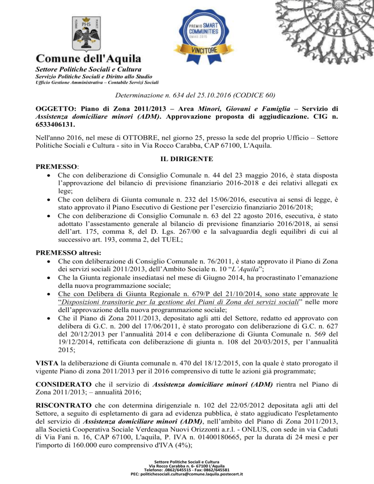 Settore Politiche Sociali e Cultura Servizio Politiche Sociali e Diritto allo Studio Ufficio Gestione Amministrativa – Contabile Servizi Sociali Determinazione n. 634 del 25.10.2016 (CODICE 60) OGGETTO: Piano di Zona 2011/2013 – Area Minori, Giovani e Famiglia – Servizio di Assistenza domiciliare minori (ADM). Approvazione proposta di aggiudicazione. CIG n. 6533406131. Nell'anno 2016, nel mese di OTTOBRE, nel giorno 25, presso la sede del proprio Ufficio – Settore Politiche Sociali e Cultura - sito in Via Rocco Carabba, CAP 67100, L'Aquila. IL DIRIGENTE PREMESSO: Che con deliberazione di Consiglio Comunale n. 44 del 23 maggio 2016, è stata disposta l’approvazione del bilancio di previsione finanziario 2016-2018 e dei relativi allegati ex lege; Che con delibera di Giunta comunale n. 232 del 15/06/2016, esecutiva ai sensi di legge, è stato approvato il Piano Esecutivo di Gestione per l’esercizio finanziario 2016/2018; Che con deliberazione di Consiglio Comunale n. 63 del 22 agosto 2016, esecutiva, è stato adottato l’assestamento generale al bilancio di previsione finanziario 2016/2018, ai sensi dell’art. 175, comma 8, del D. Lgs. 267/00 e la salvaguardia degli equilibri di cui al successivo art. 193, comma 2, del TUEL; PREMESSO altresì: Che con deliberazione di Consiglio Comunale n. 76/2011, è stato approvato il Piano di Zona dei servizi sociali 2011/2013, dell’Ambito Sociale n. 10 “L’Aquila”; Che la Giunta regionale insediatasi nel mese di Giugno 2014, ha procrastinato l’emanazione della nuova programmazione sociale; Che con Delibera di Giunta Regionale n. 679/P del 21/10/2014, sono state approvate le “Disposizioni transitorie per la gestione dei Piani di Zona dei servizi sociali” nelle more dell’approvazione della nuova programmazione sociale; Che il Piano di Zona 2011/2013, depositato agli atti del Settore, redatto ed approvato con delibera di G.C. n. 200 del 17/06/2011, è stato prorogato con deliberazione di G.C. n. 627 del 20/12/2013 per l’annualità 2014 e con deliberazione di Giunta Comunale n. 569 del 19/12/2014, rettificata con deliberazione di giunta n. 108 del 20/03/2015, per l’annualità 2015; VISTA la deliberazione di Giunta comunale n. 470 del 18/12/2015, con la quale è stato prorogato il vigente Piano di zona 2011/2013 per il 2016 comprensivo di tutte le azioni già programmate; CONSIDERATO che il servizio di Assistenza domiciliare minori (ADM) rientra nel Piano di Zona 2011/2013; – annualità 2016; RISCONTRATO che con determina dirigenziale n. 102 del 22/05/2012 depositata agli atti del Settore, a seguito di espletamento di gara ad evidenza pubblica, è stato aggiudicato l'espletamento del servizio di Assistenza domiciliare minori (ADM), nell’ambito del Piano di Zona 2011/2013, alla Società Cooperativa Sociale Verdeaqua Nuovi Orizzonti a.r.l. - ONLUS, con sede in via Caduti di Via Fani n. 16, CAP 67100, L'aquila, P. IVA n. 01400180665, per la durata di 24 mesi e per l'importo di 160.000 euro comprensivo d'IVA (4%); Settore Politiche Sociali e Cultura Via Rocco Carabba n. 6- 67100 L'Aquila Telefono: .0862/645515 - Fax: 0862/645581 PEC: politichesociali.cultura@comune.laquila.postecert.it RICHIAMATE la determinazione dirigenziale n. 135 del 03/07/2014, la determinazione dirigenziale n. 283 del 27/11/2014, la determinazione dirigenziale n. 62 del 25/03/2015 e per ultimo, la determinazione dirigenziale n. 213 del 03/08/2015, con la quale è stato prorogato l’affidamento del servizio di Assistenza domiciliare minori (ADM) alla Società Cooperativa Sociale Verdeaqua Nuovi Orizzonti a.r.l. - ONLUS, con sede in via Caduti di Via Fani n. 16, CAP 67100, L'Aquila, P. IVA n. 01400180665, fino al 31/12/2015; VISTA, allora, la determinazione dirigenziale n. 381 del 23/12/2015, con la quale è stato disposto: 1. Di approvare il Capitolato speciale d’appalto allegato alla presente per costituirne parte integrale e sostanziale; 2. Di indire una procedura aperta (art. 55, comma 5, del D. Lgs. 163/06) con aggiudicazione a favore dell'offerta economicamente più vantaggiosa (art. 83 del D. Lgs. 163/06), sulla base degli elementi di valutazione specificati nel capitolato allegato, a decorrere dalla data di affidamento effettivo del servizio, presumibilmente dal 1 luglio 2016 al 31 dicembre 2016, con opzione di rinnovo per l’intero anno 2017, ai sensi e nei modi di cui all’art. 57, comma 5 D. Lgs 163/2006 s.m.i.., per un importo complessivo di € 112.500,00= così articolato: € 37.500,00, dal 1 luglio 2016 al 31 dicembre 2016; € 75.000,00, dal 1 gennaio 2017 al 31 dicembre 2017; 3. Di delegare alla Centrale Unica di Committenza, l’espletamento della procedura di gara per l'affidamento (dal 01/07/2016 – data presumibile - al 31/12/2016, con opzione di rinnovo per l’intero anno 2017, ai sensi e nei modi di cui all’art. 57, comma 5 D. Lgs 163/2006 s.m.i.) del servizio di Assistenza domiciliare minori (ADM) nell’ambito del Piano di zona 2011/2013, prorogato con deliberazione di Giunta Comunale n. 470 del 18.12.2015 per l’annualità 2016; 4. Di impegnare la somma di euro 150.000,00 comprensiva d’IVA (di cui 37.500,00 per la proroga del servizio dal 01/01/16 al 30/06/2016) sul bilancio pluriennale 2015/2017 – annualità 2016 e 2017 -; VISTO: Che la Centrale Unica di Committenza, dopo aver esaminato il Capitolato, ha trasmesso, con note a mezzo e-mail, alcune osservazioni relative allo stesso, invitando questo Settore a predisporre, qualora dette osservazioni fossero condivise, le opportune modifiche; Che lo scrivente Settore, a seguito di ulteriori consultazioni con il responsabile della procedura C.U.C., ha provveduto a modificare il Capitolato Speciale d’Appalto, recependo le osservazioni formulate dalla C.U.C.; VISTA, pertanto, la determinazione dirigenziale n. 89 del 18/02/2016 di rettifica del Capitolato speciale d’appalto per il servizio in argomento; PRESO ATTO, tuttavia, che con nota prot. n. 46049 del 03/05/2016,