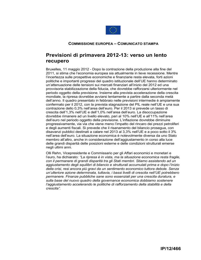 COMMISSIONE EUROPEA – COMUNICATO STAMPA Previsioni di primavera 2012-13: verso un lento recupero Bruxelles, 11 maggio 2012 - Dopo la contrazione della produzione alla fine del 2011, si stima che l’economia europea sia attualmente in lieve recessione. Mentre l’incertezza sulle prospettive economiche e finanziarie resta elevata, forti azioni politiche e importanti progressi del quadro istituzionale dell’UE hanno determinato un’attenuazione delle tensioni sui mercati finanziari all’inizio del 2012 ed una provvisoria stabilizzazione della fiducia, che dovrebbe rafforzarsi ulteriormente nel periodo oggetto della previsione. Insieme alla prevista accelerazione della crescita mondiale, la ripresa dovrebbe avviarsi lentamente a partire dalla seconda metà dell’anno. Il quadro presentato in febbraio nelle previsioni intermedie è ampiamente confermato per il 2012, con la prevista stagnazione del PIL reale nell’UE e una sua contrazione dello 0,3% nell’area dell’euro. Per il 2013 si prevede un tasso di crescita dell’1,3% nell’UE e dell’1,0% nell’area dell’euro. La disoccupazione dovrebbe rimanere ad un livello elevato, pari al 10% nell’UE e all’11% nell’area dell’euro nel periodo oggetto della previsione. L’inflazione dovrebbe diminuire progressivamente, via via che viene meno l’impatto del rincaro dei prezzi petroliferi e degli aumenti fiscali. Si prevede che il risanamento del bilancio prosegua, con disavanzi pubblici destinati a calare nel 2013 al 3,3% nell’UE e a poco sotto il 3% nell’area dell’euro. La situazione economica è notevolmente diversa da uno Stato membro all’altro, anche in considerazione dell’aggiustamento in corso alla luce delle grandi disparità delle posizioni esterne e delle condizioni strutturali emerse negli ultimi anni. Olli Rehn, Vicepresidente e Commissario per gli Affari economici e monetari e l’euro, ha dichiarato: “La ripresa è in vista, ma la situazione economica resta fragile, con il permanere di grandi disparità tra gli Stati membri. Stiamo assistendo ad un aggiustamento degli squilibri di bilancio e strutturali accumulati prima e dopo l’inizio della crisi, resi ancora più gravi da un sentimento economico tuttora debole. Senza un’ulteriore azione determinata, tuttavia, i bassi livelli di crescita nell’UE potrebbero permanere. Finanze pubbliche sane sono essenziali per una crescita duratura, e sulla base del nuovo quadro della governance economica dobbiamo sostenere l’aggiustamento accelerando le politiche di rafforzamento della stabilità e della crescita”. IP/12/466 Modesta ripresa nei prossimi mesi di quest’anno L’attività economica nell’UE ha subito una contrazione nell’ultimo trimestre del 2011 e, in base alle stime, anche nel primo trimestre del 2012. Una graduale ripresa dovrebbe cominciare nella seconda metà dell’anno e accelerare nel 2013. Dovrebbe tuttavia restare modesta in quanto diversi fattori continuano a pesare sulla domanda interna. Gli sforzi necessari da parte delle banche per migliorare ulteriormente i loro bilanci impediranno un allentamento delle condizioni del credito, sebbene nel complesso la domanda di credito sia rimasta debole finora. I consumi privati saranno frenati dalla disoccupazione elevata, dalla lenta crescita dei salari e dall’inflazione nonché dall’elevato indebitamento delle famiglie in una serie di Stati membri. Infine, gli investimenti privati sono tuttora in calo, ma nel periodo oggetto della previsione dovrebbero iniziare a beneficiare del previsto ritorno della fiducia, di tassi di interesse bassi e della solida crescita della produzione mondiale. Si prevede che il contributo positivo delle esportazioni nette sarà il principale motore della crescita del PIL nel 2012. Nel 2013 dovrebbe però subentrare una domanda interna in graduale rafforzamento. Queste proiezioni sono basate sull’ipotesi che la fiducia si rafforzerà nel tempo, man mano che i problemi posti dalla crisi saranno affrontati con successo, anche attraverso la risoluta attuazione delle decise azioni politiche convenute. Nel complesso, il quadro per il 2012 tratteggiato nelle previsioni intermedie di febbraio è ampiamente confermato. Quest’anno la crescita annuale del PIL dovrebbe essere piatta (0,0%) nell’UE e pari allo 0,3% nell’area dell’euro. Per il 2013, è prevista una crescita modesta dell’1,3% nell’UE e dell’1% nell’area dell’euro. Per quanto il rallentamento abbia colpito tutti gli Stati membri, persisteranno, secondo le previsioni, i differenziali di crescita, a causa di differenze nelle esigenze di aggiustamento strutturale, nei costi di finanziamento e nella sostenibilità delle finanze pubbliche. L’aggiustamento degli squilibri esterni a livello degli Stati membri è in corso e dovrebbe continuare nel periodo oggetto della previsione. In linea con il rallentamento dell’attività economica, l’occupazione dovrebbe contrarsi dello 0,2% nell’UE (0,5% nell’area dell’euro) nel 2012. Il previsto ritorno della crescita dovrebbe portare ad un graduale miglioramento dei mercati del lavoro nel 2013, il che a sua volta contribuirà ad una ripresa più sostenuta. La disoccupazione dovrebbe rimanere ad un livello del 10,3% nell’UE nel corso del periodo oggetto della previsione e all’11% nell’area dell’euro nel 2013. Migliorano le finanze pubbliche Nonostante il rallentamento della produzione nel corso del 2011, le finanze pubbliche nell’UE sono migliorate notevolmente nel 2011. Sulla base di un risanamento già deciso associato ad una graduale ripresa economica più tardi nel periodo oggetto delle previsioni, i disavanzi di bilancio dovrebbero continuare a diminuire dal 4,5% del PIL nell’UE (4,1% nell’area dell’euro) nel 2011 al 3,6% nell’UE (3,2% dell’area dell’euro) nel 2012 e successivamente al 3,3% (2,9%) nel 2013, con notevoli differenze tra Stati membri. Tuttavia, l’ipotesi di politiche invariate implica che per l