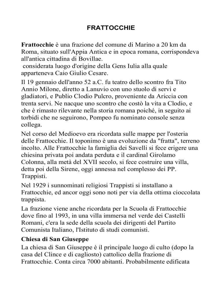 FRATTOCCHIE Frattocchie è una frazione del comune di Marino a 20 km da Roma, situato sull'Appia Antica e in epoca romana, corrispondeva all'antica cittadina di Bovillae. considerata luogo d'origine della Gens Iulia alla quale apparteneva Caio Giulio Cesare. Il 19 gennaio dell'anno 52 a.C. fu teatro dello scontro fra Tito Annio Milone, diretto a Lanuvio con uno stuolo di servi e gladiatori, e Publio Clodio Pulcro, proveniente da Ariccia con trenta servi. Ne nacque uno scontro che costò la vita a Clodio, e che è rimasto rilevante nella storia romana poiché, in seguito ai torbidi che ne seguirono, Pompeo fu nominato console senza collega. Nel corso del Medioevo era ricordata sulle mappe per l'osteria delle Frattocchie. Il toponimo è una evoluzione da "fratta", terreno incolto. Alle Frattocchie la famiglia dei Savelli si fece erigere una chiesina privata poi andata perduta e il cardinal Girolamo Colonna, alla metà del XVII secolo, si fece costruire una villa, detta poi della Sirene, oggi annessa nel complesso dei PP. Trappisti. Nel 1929 i sunnominati religiosi Trappisti si installano a Frattocchie, ed ancor oggi sono noti per via della ottima cioccolata trappista. La frazione viene anche ricordata per la Scuola di Frattocchie dove fino al 1993, in una villa immersa nel verde dei Castelli Romani, c'era la sede della scuola dei dirigenti del Partito Comunista Italiano, l'Istituto di studi comunisti. Chiesa di San Giuseppe La chiesa di San Giuseppe è il principale luogo di culto (dopo la casa del Clince e di cagliosto) cattolico della frazione di Frattocchie. Conta circa 7000 abitanti. Probabilmente edificata nella prima metà del Duecento sotto il pontificato di papa Onorio III in prossimità della via Appia, venne ricostruita dal cardinale Girolamo Colonna alla metà del Seicento, con l'intitolazione a san Girolamo, e quindi distrutta negli anni sessanta per lasciare spazio alla nuova chiesa, edificata ad una certa distanza dall'originale. Nella cripta della chiesa è sepolto il card. Giuseppe Pizzardo (1877-1970) che fu vescovo suburbicario di Albano, alla quale diocesi appartiene la parrocchia, dal 1948 alla morte. Edicole sacre] • Edicola della Madonna del Santissimo Sacramento. Immagine di una Madonna con bambino situata presso l''Abbazia cistercense trappista di Frattocchie L’abbazia trae origine dalla tradizione di vita evangelica che ha trovato espressione nella Regola di san Benedetto, e nella forma particolare che le hanno impresso i fondatori di Cîteaux nell'XI secolo. La vita monastica che vi si osserva e integralmente ordinata alla contemplazione, per cui i monaci si consacrano, all'interno della clausura del monastero, al culto divino, col dedicarsi all'umile e nobile servizio della Divina Maestà nella solitudine e nel silenzio, in preghiera continua e gioiosa penitenza. Nella comunità, sotto una Regola e un Abate, i monaci seguono Cristo, celebrando ogni giorno la preghiera liturgica, dedicandosi al lavoro manuale e alla "lectio divina". • Edicola della Madonna delle Rose. Immagine piuttosto antica situata in località Costa Rotonda nell'omonima via Madonna delle Rose. Edicola della Madonna del Clince. Ceramica recente situata in via Costa Rotonda. Non ha connessioni con l'omonima antichissima immagine mariana venerata presso il santuario di Santa Maria della Rotonda nella vicina Albano Laziale.
