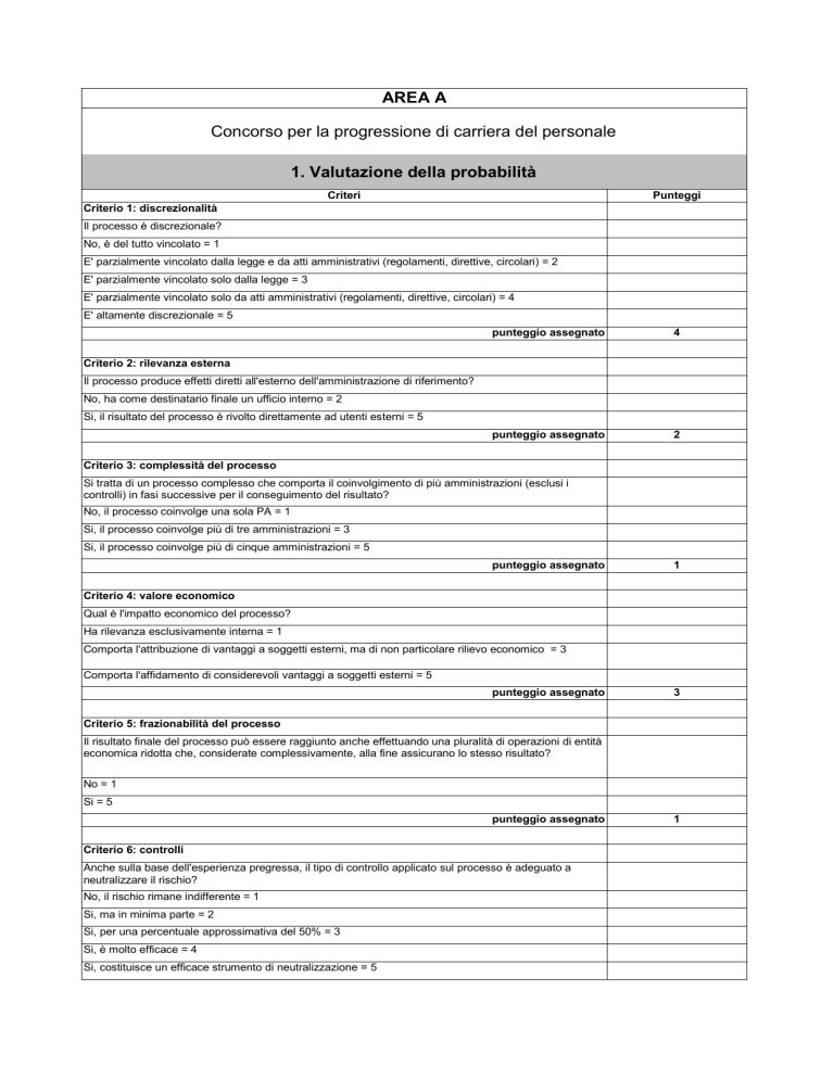AREA A Concorso per la progressione di carriera del personale 1. Valutazione della probabilità Criteri Punteggi Criterio 1: discrezionalità Il processo è discrezionale? No, è del tutto vincolato = 1 E' parzialmente vincolato dalla legge e da atti amministrativi (regolamenti, direttive, circolari) = 2 E' parzialmente vincolato solo dalla legge = 3 E' parzialmente vincolato solo da atti amministrativi (regolamenti, direttive, circolari) = 4 E' altamente discrezionale = 5 punteggio assegnato 4 punteggio assegnato 2 Criterio 2: rilevanza esterna Il processo produce effetti diretti all'esterno dell'amministrazione di riferimento? No, ha come destinatario finale un ufficio interno = 2 Si, il risultato del processo è rivolto direttamente ad utenti esterni = 5 Criterio 3: complessità del processo Si tratta di un processo complesso che comporta il coinvolgimento di più amministrazioni (esclusi i controlli) in fasi successive per il conseguimento del risultato? No, il processo coinvolge una sola PA = 1 Si, il processo coinvolge più di tre amministrazioni = 3 Si, il processo coinvolge più di cinque amministrazioni = 5 punteggio assegnato 1 Criterio 4: valore economico Qual è l'impatto economico del processo? Ha rilevanza esclusivamente interna = 1 Comporta l'attribuzione di vantaggi a soggetti esterni, ma di non particolare rilievo economico = 3 Comporta l'affidamento di considerevoli vantaggi a soggetti esterni = 5 punteggio assegnato 3 Criterio 5: frazionabilità del processo Il risultato finale del processo può essere raggiunto anche effettuando una pluralità di operazioni di entità economica ridotta che, considerate complessivamente, alla fine assicurano lo stesso risultato? No = 1 Si = 5 punteggio assegnato Criterio 6: controlli Anche sulla base dell'esperienza pregressa, il tipo di controllo applicato sul processo è adeguato a neutralizzare il rischio? No, il rischio rimane indifferente = 1 Si, ma in minima parte = 2 Si, per una percentuale approssimativa del 50% = 3 Si, è molto efficace = 4 Si, costituisce un efficace strumento di neutralizzazione = 5 1 punteggio assegnato Valore stimato della probabilità 1 2,00 0 = nessuna probabilità; 1 = improbabile; 2 = poco probabile; 3 = probabile; 4 = molto probabile; 5 = altamente probabile. 2. Valutazione dell'impatto Criterio 1: impatto organizzativo Rispetto al totale del personale impiegato nel singolo servizio (unità organizzativa semplice) competente a svolgere il processo (o la fase del processo di competenza della PA) nell'ambito della singola PA, quale percentuale di personale è impiegata nel processo? (Se il processo coinvolge l'attività di più servizi nell'ambito della stessa PA occorre riferire la percentuale al personale impiegato nei servizi coinvolti) fino a circa il 20% = 1 fino a circa il 40% = 2 fino a circa il 60% = 3 fino a circa lo 80% = 4 fino a circa il 100% = 5 punteggio assegnato 2 Criterio 2: impatto economico Nel corso degli ultimi cinque anni sono state pronunciate sentenze della Corte dei Conti a carico di dipendenti (dirigenti o dipendenti) della PA o sono state pronunciate sentenze di risarcimento del danno nei confronti della PA per la medesima tipologia di evento o di tipologie analoghe? No = 1 Si = 5 punteggio assegnato 1 Criterio 3: impatto reputazionale Nel corso degli ultimi anni sono stati pubblicati su giornali o riviste articoli aventi ad oggetto il medesimo evento o eventi analoghi? No = 0 Non ne abbiamo memoria = 1 Si, sulla stampa locale = 2 Si, sulla stampa nazionale = 3 Si, sulla stampa locale e nazionale = 4 Si sulla stampa, locale, nazionale ed internazionale = 5 punteggio assegnato 0 Criterio 4: impatto sull'immagine A quale livello può collocarsi il rischio dell'evento (livello apicale, intermedio, basso), ovvero la posizione/il ruolo che l'eventuale soggetto riveste nell'organizzazione è elevata, media o bassa? a livello di addetto = 1 a livello di collaboratore o funzionario = 2 a livello di dirigente di ufficio non generale, ovvero posizione apicale o posizione organizzativa = 3 a livello di dirigente d'ufficio generale = 4 a livello di capo dipartimento/segretario generale = 5 punteggio assegnato 3 Valore stimato dell'impatto 1,50 0 = nessun impatto; 1 = marginale; 2 = minore; 3 = soglia; 4 = serio; 5 = superiore 3. Valutazione complessiva del rischio Valutazione complessiva del rischio = probabilità x impatto 3,00