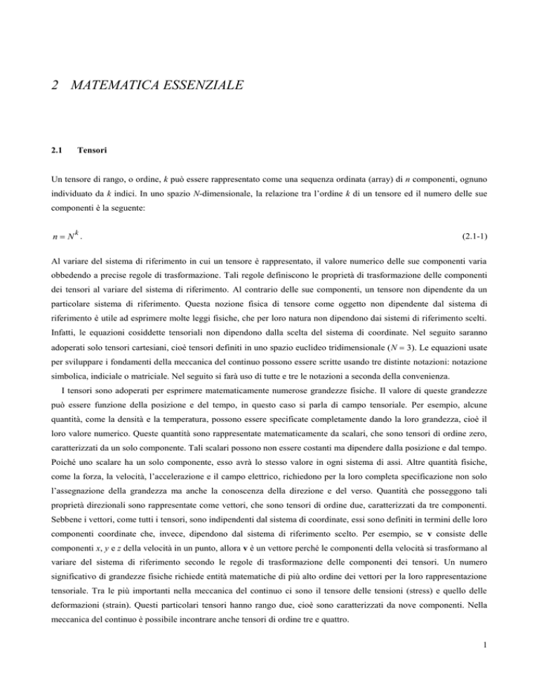 2 MATEMATICA ESSENZIALE 2.1 Tensori Un tensore di rango, o ordine, k può essere rappresentato come una sequenza ordinata (array) di n componenti, ognuno individuato da k indici. In uno spazio N-dimensionale, la relazione tra l’ordine k di un tensore ed il numero delle sue componenti è la seguente: k nN . (2.1-1) Al variare del sistema di riferimento in cui un tensore è rappresentato, il valore numerico delle sue componenti varia obbedendo a precise regole di trasformazione. Tali regole definiscono le proprietà di trasformazione delle componenti dei tensori al variare del sistema di riferimento. Al contrario delle sue componenti, un tensore non dipendente da un particolare sistema di riferimento. Questa nozione fisica di tensore come oggetto non dipendente dal sistema di riferimento è utile ad esprimere molte leggi fisiche, che per loro natura non dipendono dai sistemi di riferimento scelti. Infatti, le equazioni cosiddette tensoriali non dipendono dalla scelta del sistema di coordinate. Nel seguito saranno adoperati solo tensori cartesiani, cioè tensori definiti in uno spazio euclideo tridimensionale (N 3). Le equazioni usate per sviluppare i fondamenti della meccanica del continuo possono essere scritte usando tre distinte notazioni: notazione simbolica, indiciale o matriciale. Nel seguito si farà uso di tutte e tre le notazioni a seconda della convenienza. I tensori sono adoperati per esprimere matematicamente numerose grandezze fisiche. Il valore di queste grandezze può essere funzione della posizione e del tempo, in questo caso si parla di campo tensoriale. Per esempio, alcune quantità, come la densità e la temperatura, possono essere specificate completamente dando la loro grandezza, cioè il loro valore numerico. Queste quantità sono rappresentate matematicamente da scalari, che sono tensori di ordine zero, caratterizzati da un solo componente. Tali scalari possono non essere costanti ma dipendere dalla posizione e dal tempo. Poiché uno scalare ha un solo componente, esso avrà lo stesso valore in ogni sistema di assi. Altre quantità fisiche, come la forza, la velocità, l’accelerazione e il campo elettrico, richiedono per la loro completa specificazione non solo l’assegnazione della grandezza ma anche la conoscenza della direzione e del verso. Quantità che posseggono tali proprietà direzionali sono rappresentate come vettori, che sono tensori di ordine due, caratterizzati da tre componenti. Sebbene i vettori, come tutti i tensori, sono indipendenti dal sistema di coordinate, essi sono definiti in termini delle loro componenti coordinate che, invece, dipendono dal sistema di riferimento scelto. Per esempio, se v consiste delle componenti x, y e z della velocità in un punto, allora v è un vettore perché le componenti della velocità si trasformano al variare del sistema di riferimento secondo le regole di trasformazione delle componenti dei tensori. Un numero significativo di grandezze fisiche richiede entità matematiche di più alto ordine dei vettori per la loro rappresentazione tensoriale. Tra le più importanti nella meccanica del continuo ci sono il tensore delle tensioni (stress) e quello delle deformazioni (strain). Questi particolari tensori hanno rango due, cioè sono caratterizzati da nove componenti. Nella meccanica del continuo è possibile incontrare anche tensori di ordine tre e quattro. 1 2.2 Algebra tensoriale in notazione simbolica – Convenzione di Einstein Per rappresentare i tensori, s’introduca nella spazio euclideo un sistema levogiro d’assi cartesiani Ox1x2x3 e s’identifichino questi assi con i vettori base unitari ê1 , ê 2 ed ê 3 mostrati in fig. 2.1(a) Essendo mutualmente ortogonali i versori base formano una base ortonormale. In termini di tale base, un arbitrario vettore, vedi in fig. 2.1(b), in notazione simbolica rappresentato da v,è dato da: 3 v v1ˆe1 v2ˆe 2 v3ˆe 3 viˆe i . (2.2-1) i 1 Il suo modulo è denotato dalla stessa lettera usata per la notazione simbolica scritta non in grassetto: v. x3 x3 v3 ê3 v v2 ê 2 ê1 x1 x2 v1 x1 (a) Figura 2.1 x2 (b) (a) Versori di base del sistema di coordinate; (b) componenti cartesiane del vettore v. E’ utile ora introdurre uno strumento di notazione, detto convenzione di Einstein nelle sommatorie, utile quando si lavora con formule contenenti indici di coordinate. Tale convenzione stabilisce che ogni volta che un indice (deponente o esponente) appare ripetuto esattamente due volte in un termine, quell’indice assumerà i valori 1, 2 e 3 in successione ed i termini risultanti saranno poi sommati. Utilizzando tale convenzione l’eq. (2.2-1) può essere espressa semplicemente come: v v i ˆe i , (2.2-2) ed il simbolo di sommatoria, , può essere completamente cancellato. Gli indici ripetuti sono detti indici muti (dummy indices) dal momento che il risultato non dipende dalla particolare lettera che è usata per essi. Infatti, utilizzando la convenzione di Einstein, vi ˆe i è completamente equivalente a v j ˆe j o v r ˆe r . Comunque, con tale convenzione si deve fare attenzione a che un indice non compaia più di due volte in un dato termine, anche se ci possono essere più di due indici muti in un termine. La convenzione di Einstein si applica solo a termini dello stesso prodotto, a indici dello stesso tensore, come nel caso Tii T11 T22 T33, e a indici di un rapporto, come nell’espressione per le divergenze, i.e., vi xi v1 x1 v2 x2 v3 x3 . Termini separati da un’operazione non sono soggetti alla convenzione delle sommatorie, e in questo caso un indice può essere riusato, come nell’espressione Tijvj Sijwj. La convention degli indici 2 ripetuti non si applica se un indice di sommatoria è ripetuto più di una volta. Nel caso, si farà ricorso al simbolo di sommatoria che, quindi, annulla la convenzione di Einstein. Utilizzando quanto sopra esposto, è possibile riscrivere, utilizzando la notazione simbolica ed indiciale, alcune definizioni dell’algebra tensorial