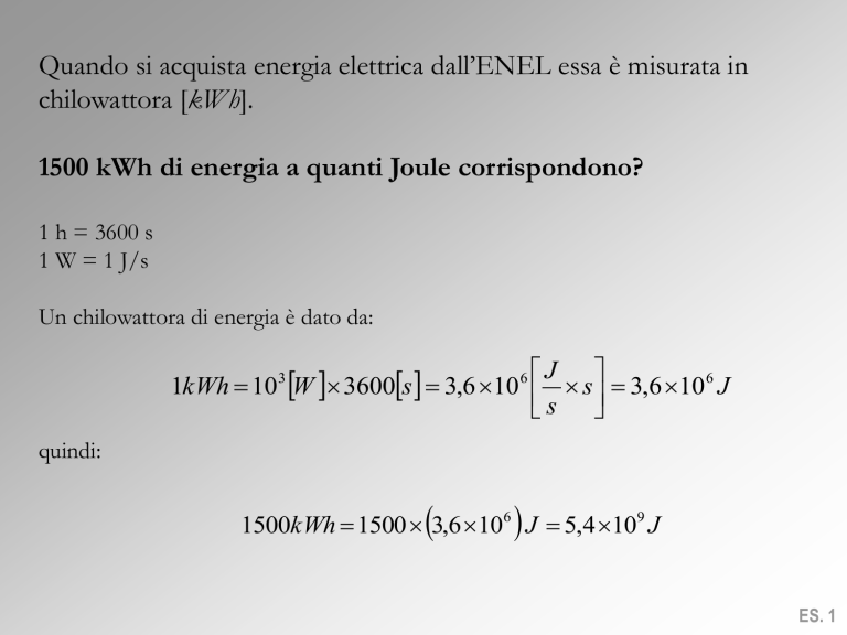 Quando si acquista energia elettrica dall’ENEL essa è misurata in chilowattora [kWh]. 1500 kWh di energia a quanti Joule corrispondono? 1 h = 3600 s 1 W = 1 J/s Un chilowattora di energia è dato da: J 1kWh 103 W 3600s 3,6 106 s 3,6 106 J s quindi: 1500kWh 1500 3,6 106 J 5,4 109 J ES. 1 Una stufa “A” eroga 10 kWh di calore in 24 ore una stufa “B” eroga 64500 kCal in 15 giorni (24h/24h). Quale delle due stufe è più potente? POTENZA: Definisce il lavoro, il calore o l’energia, nell’unità di tempo 1 W = 1J/s 1 kCal = 4186 Joule = 4,186 x 103 Joule 1 kWh = 3600000 Joule = 3,6 x 106 Joule 1 ora = 60 minuti = 3600 secondi 15 giorni = 360h = 21600min = 1296000 secondi ES. 2 per calcolare la potenza della stufa “A” si calcola la sua potenza in kW si divide l’energia espressa in kWh per il tempo espresso in ore: 10kWh 0,416kW 24h per calcolare la potenza della stufa “B” si trasformano la kcal in Joule e successivamente si calcola la potenza in kW dividendo l’energia espressa in Joule per il tempo espresso in secondi: 64500 [kcal] x 4186 = 269997000 J 269997000J 208W 0.21kW 1296000s Un’automobile viaggiando alla velocità costante di 75 km/h sviluppa una potenza pari ad 80 kW. Quanto vale la forza di propulsione F della vettura? Velocità dell’auto v = 75 km/h = 20,8 m/s Potenza sviluppata dall’auto P = 80 kW = 80000 W = 107,2 CV 1 kW = 1,34 CV Per calcolare il valore della forza F si parte dal concetto di potenza P, ricordando che il lavoro L = Forza x spostamento. ES. 3 Il rapporto d/s (spostamento/tempo) indica la velocità v [m/s], per cui: L F d P t s P F v P 80000W F 3846,15 N v m 20,8 s Un corpo di 1 kg viaggia alla velocità di 90 km/h. Quanto vale la sua energia cinetica, espressa in Joule? Se la velocità si dimezza, quale è la sua energia cinetica? Massa del corpo m = 1 kg Velocità v = 90 km/h = 25 m/s L’energia cinetica Ec è data da: 2 Ec 1 1 2 m mv 2 1kg 25 312,5 J 2 2 s Dimezzando la velocità il valore dell’energia cinetica diventa: 2 Ec 2 1 25 m 1kg 78,125 J 2 2 s ES. 4 Un uomo consuma in un giorno cibo con un valore energetico totale pari a 3500 kcal. Calcolare a quanti Joule di energia corrisponde questa quantità di calorie e la potenza sviluppata dall’uomo, in Watt, dissipata nell’arco di 24 h e ipotizzandola costante. 1 kcal = 4186 J; 24 h = 86400 s L’energia in Joule corrisponde a: 3500kcal 4186 14651000 J La potenza sviluppata dall’uomo in 24 h è: LJ 14651000J P 169,6 W t s 86400s ES. 5 Un serbatoio di accumulo della capacità di 100 litri e perfettamente isolato contiene acqua alla temperatura di 50°C. Determinare quanto calore, in kJ, bisogna sottrarre all’acqua per portarla a 20°C. Temperatura iniziale dell’acqua = 50°C Temperatura finale dell’acqua = 20°C Calore specifico dell’acqua è costante e pari a cp = 1kcal/kgK Il serbatoio è perfettamente isolato. I flussi termici scambiati con l’ambiente sono nulli, l’involucro del serbatoio è adiabatico. L’acqua ha una temperatura omogenea in tutto il serbatoio. Lo scambio fra il dispositivo che genera il calore e la massa d’acqua avviene con un’efficienza unitaria. Il problema viene risolto trascurando la variabile temporale. 1 kcal = 4186 J La densità dell’acqua r, considerata costante, è pari a 1000 kg/m3. ES. 6 La massa d’acqua m, contenuta nel serbatoio, è data da: kg m V 0.1 m 1000 100kg m 3 3 dove 1 litro [l] = 1 kg. Utilizzando la stessa definizione di calore specifico si ha che: Q J cp mt kgK Ricordando che: J Q c p mt kgK J kgK kcal J cp 1 4186 kgK kgK Sostituendo i valori: J kg Q cpmt 4186 100 l 1 l 20 50C 12558000J 12558kJ kgK Poiché l’acqua deve essere raffreddata, il segno – denota che tale quantità di calore deve essere a lei sottratta. Un impianto a pannelli solari, con rendimento del 45% e superficie di 2 m2, fornisce il calore per scaldare un serbatoio di 100 litri di acqua. La radiazione solare nel periodo di tempo considerato è costante e pari a 500 W/m2 Calcolare il tempo necessario, in ore, per portare l’acqua dalla temperatura di 20°C a quella di 50°C. L’impianto solare ha un rendimento complessivo medio (collettore, accumulo, scambiatore e distribuzione nel periodo di tempo considerato) uguale al 45% Temperatura iniziale dell’acqua = 20°C Temperatura finale dell’acqua = 50°C Irraggiamento solare = 500 W/m2 cp acqua = 1 kcal/kgK = 4186 J/kgK Rendimento h = Q utile / Q disponibile = 0,45 Superficie S = 2 m2 Volume acqua V = 100 litri = 0,1 m3 ES. 7 Per calcolare la quantità di calore necessario da fornire all’acqua per innalzarne la temperatura da 20 a 50°C si utilizza la seguente equazione: J Qutile mc p t 100kg 4186 50 20C 12558000J kgK Dall’ equazione del rendimento si ricava: Qdisponibile Qutile 12558000 27906666 J 0,45 Q disponibile rappresenta l’energia solare che deve essere captata nell’intervallo di tempo incognito dai collettori solari. La radiazione solare I, espressa in W/m2, rappresenta una potenza dell’energia solare riferita all’unità di superficie. La potenza complessiva è data da: W Wdisponibile I S 2 m 2 m sostituendo Wdisponibile Qdisponibile Qdisponibile Wdisponibile Da cui 27906066 27906s 7,75h 1000 J s W più esattamente, la frazione decimale delle ore può essere convertita in minuti considerando la proporzione: 100 : 60 = 75 : x x 60 75 45 min 100 Il tempo richiesto, è quindi, pari a 7h e 45’. Un cilindro di base circolare con diametro di 0,10 m contiene 0,5 moli di un gas ideale. Un corpo di massa pari ad 1 kg è posizionato stabilmente sul coperchio scorrevole del cilindro (il pistone). Se, a seguito di una espansione, il pistone si solleva di 15 cm, a quanto ammonta il lavoro svolto? Diametro base cilindro = 0,10 m Massa del corpo posizionato sul pistone = 1 kg ∆h del pistone (a seguito dell’espansione) = 0,15 m Area della base del cilindro = πr2 = 0,00785 m2 Pressione atmosferica = 101325 Pa ES. 8 La trasformazione avviene a pressione costante (isobara). 