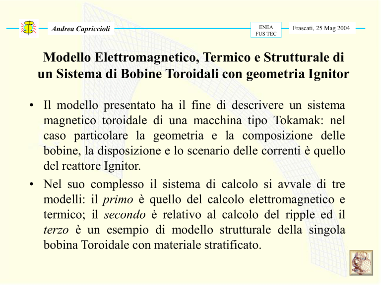 Andrea Capriccioli ENEA FUS TEC Frascati, 25 Mag 2004 Modello Elettromagnetico, Termico e Strutturale di un Sistema di Bobine Toroidali con geometria Ignitor • Il modello presentato ha il fine di descrivere un sistema magnetico toroidale di una macchina tipo Tokamak: nel caso particolare la geometria e la composizione delle bobine, la disposizione e lo scenario delle correnti è quello del reattore Ignitor. • Nel suo complesso il sistema di calcolo si avvale di tre modelli: il primo è quello del calcolo elettromagnetico e termico; il secondo è relativo al calcolo del ripple ed il terzo è un esempio di modello strutturale della singola bobina Toroidale con materiale stratificato. Modello Elettromagnetico e Termico • Il modello realizzato in ambito ANSYS è 3D, utilizza elementi Solid97 (3-D Magnetic Solid) per la parte elettromagnetica, Solid70 (3-D Thermal Solid) e Fluid116 (Coupled Thermal-Fluid Pipe) per la parte termica, Circu124 (Electric Circuit) per imporre lo scenario delle correnti ed INFIN111 (3-D Infinite Solid) per le condizioni al contorno. • L’analisi è transiente, tiene in conto sia dell’effetto della magneto-resistenza che del calore prodotto per effetto neutronico e l’intero modello è composto da circa 6000 elementi e 9000 nodi (la sola TFC ha un numero di elementi pari a circa 1.5 volte quello FORTE). • Il calcolo viene effettuato utilizzando la procedura del “Restart” sia per l’analisi elettromagnetica che termica. • I due modelli calcolano alternativamente la distribuzione delle correnti nel conduttore massivo, la correlata densità di flusso magnetico e le temperature che a tali distribuzioni sono associate, sia per quanto concerne l’effetto Joule che l’effetto della Magneto-Resistenza. • Il ciclo di calcolo seguita con queste due componenti fino al momento in cui si decide di inserire anche il calore generato, sia nel rame della TFC che nell’isolante interspira, dal flusso neutronico. Al termine di questo periodo, il calcolo riprende con le sole due componenti già viste. • La durata del calcolo completo, con il numero di elementi detto, risulta inferiore ad 1 ora; il grado di rifinitura della mesh è parametrizzato in base a due sole costanti. Mesh del modello Elettromagnetico. E’ visibile la gamba interna in wedging della TFC circondata da “aria” e dagli elementi “infinito” che partono proprio dagli elementi aria. Tali elementi coprono la TFC anche esternamente oltre che lateralmente. E’ visibile solamente la TFC nella sua parte in rame: il modello descrive metà spira con una estensione angolare della parte in wedging di circa ed inferiore a 0.75 gradi ed 1 elemento in senso toroidale. Adagiato sulla mezza spira di TFC vi è lo spessore costante di isolante interspira. L’apertura angolare della parte rastremata è ancora inferiore a 0.75 gradi (per la presenza dell’isolante contro-massa e dello schermo anti frizione). E’ visibile “l’aria” che circonda esternamente, e da un solo lato, la mezza spira di rame. La parte in rosso è solamente per evidenziare la zona interna alla TFC ed occupata dalla camera e dal plasma. Quello rappresentato è il sistema toroidale magneticamente e termicamente equivalente a quello modellato: è un sistema 3D ma risulta distribuito in modo omogeneo e costituito da un’alternanza di singole spire, ricoperte dall’isolante interspira che ad ognuna compete. Ovviamente lo spazio toroidale vuoto tra spira e spira è, nel modello elettr., descritto da quegli elementi “aria” appena visti. Nella geometria di Ignitor 10 di queste spire vengono raggruppate a formare una singola bobina TFC: l’effetto del ”Ripple” toroidale risulta in questo caso amplificato e per analizzarne gli andamenti ed i valori è stato prodotto un specifico modello, derivato direttamente da questo. Risultati FORTE Potenza neutronica applicata per 2 sec (da 8 a 10) Potenza neutronica FORTE ANSYS EMAG_TFC Dati FORTE Risultati ANSYS: Confronto tra le temperature raggiunte con e senza applicazione del carico neutronico tra 8 e 10 sec e con la distribuzione di potenza mostrata. Raffreddamento: Viene presa in considerazione una spira intera, con i due spessori di isolamento interspira ed il canale di refrigerazione che percorre parte del suo dorso. Vengono attribuite al fluido (gas He) le condizioni di pressione in ingresso ed uscita dal canale e l’andamento temporale della temperatura in ingresso. Le condizioni iniziali che riguardano le temperature del rame e dell’isolante vengono direttamente importate dai risultati del modello termico. Analisi del Ripple Modello FEM di una bobina TFC intera. Vi sono 10 spire di rame senza isolamento di spira e circondate da elementi “aria” ed elementi “infinito”. L’apertura angolare della parte di gamba rastremata risulta inferiore a 7.5°, per tenere in conto degli isolamenti e dello schermo antifrizione. Il modello di partenza è lo stesso di quello utilizzato per il calcolo elettromagnetico e da esso viene prelevata la distribuzione delle densità di corrente, per l’istante che si desidera analizzare (si ipotizza una distribuzione di corrente identica per tutte le spire). Modello Strutturale Il modello descrive una bobina TFC intera (quella rappresentata, per motivi di dimensione del modello, è una metà equatoriale). E’ possibile vedere le 10 spire di rame e gli isolamenti interspira (0.25 mm per spira). E’ opportuno dire che il modello va analizzato ulteriormente: il numero di elementi che andrebbe considerato per non far insorgere problemi di “shape” è tale da superare i limiti imposti all’attuale versione in uso ENEA e che, comunque, un’analisi della bobina intera appare difficile e tale da dover far pensare ad una modellizzazione “a parti”. Isolamento Contro-Massa Schermo Anti Frizione I dati in ingresso al calcolo Strutturale, forze e temperature, dovranno essere prese dal precedente calcolo elettromagnetico e termico (la mes