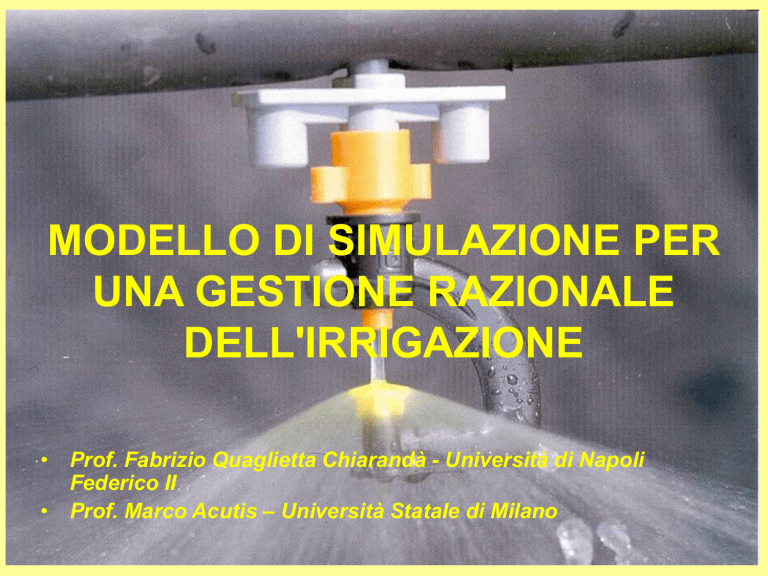 MODELLO DI SIMULAZIONE PER UNA GESTIONE RAZIONALE DELL'IRRIGAZIONE • Prof. Fabrizio Quaglietta Chiarandà - Università di Napoli Federico II • Prof. Marco Acutis – Università Statale di Milano RAZIONALIZZARE L'IRRIGAZIONE Perchè? • Aleatorietà delle riserve • Costi crescenti di acqua e manodopera Come? • Riducendo gli sprechi: (empirismo approccio tecnico-scientifico) 1. Distribuire l'acqua quando serve e nella giusta quantità 2. Evitare perdite per percolazione profonda (conoscenza del terreno e delle piante) 3. Evitare perdite per ruscellamento superficiale ed evaporazione (caratteristiche degli impianti) CARATTERISTICHE IDROLOGICHE DEI TERRENI Dipendono dalla TESSITURA e dalla STRUTTURA Capacità massima Capacità di campo Punto di appassimento (Ψ=0) (Ψ=-0.3 bar) (Ψ=-15 bar) Acqua di percolazione Acqua capillare Acqua igroscopica (nei macropori, tensione < gravità) (nei micropori, tensione > gravità) (indisponibile per le piante) CIM, CIC e Pa sono valori di UMIDITA’ % in genere riferiti al Peso secco del terreno (Ups). La differenza tra CIM e CIC (CIM – CIC) costituisce l’acqua di percolazione o gravitazionale non disponibile per le piante. La differenza tra CIC e Pa, invece costituisce l’acqua (sempre espressa in %) disponibile o utilizzabile per le piante. Ad o AU = CIC – Pa 60 C.I.M Acqua % 50 40 Acqua gravitazionale 30 Acqua disponibile 20 10 0 C.I.C Acqua non disponibile sabbia limo Terreno a grana fine argilla P.a. Il valore di CIM, CIC e Pa dipende dalla porosità del terreno e, quindi, dalla sua struttura e tessitura. In particolare l’Ad cresce passando da un terreno sabbioso ad uno argilloso ben strutturato. Riserva utilizzabile (Ru): E’ l’acqua disponibile (o utilizzabile) per le piante riferita all’unità di superficie del terreno ed espressa in mm o m3 ha-1 Ru(mm) Ad ps * d Advol * s( mm ) * s( mm ) 100 100 dove Advol = Acqua disponibile in volume (= Adps* d) s = Strato di terreno interessato dalle radici (in mm) d = Densità apparente del Terreno Man mano che l'acqua nel terreno diminuisce, quella che resta viene trattenuta con una forza via via maggiore. Al di sotto di un certo limite (diverso da una specie all'altra) le piante, incontrando maggiore difficoltà nell'assorbimento, tendono a ridurre la traspirazione (Umidità critica) CONSUMI IDRICI IN FUNZIONE DELLA DISPONIBILITA' DI ACQUA NEL TERRENO 100 Acqua gravitazionale (15%) Acqua facilmente disponibile (15%) Acqua disponibile con difficoltà crescente (20%) Acqua facilmente disponibile (15%) Parte solida (50%) Parte solida (50%) Capacità di Campo Umidità critica Acqua igroscopica (5%) Acqua disponibile con difficoltà crescente (20%) Acqua igroscopica (5%) Punto di Appassimento Acqua disponibile con difficoltà crescente (20%) Acqua igroscopica (5%) Parte solida (50%) 0 100 DISPONIBILITA' DI ACQUA NEL TERRENO 0 Evapotraspirazione (ET) Il consumo idrico totale di una coltura lo possiamo considerare come la risultante di due componenti che interagiscono: AMBIENTALE Domanda evaporativa determinata da: temperatura, radiaz., UR, vento, disponobilità idrica, caratteristiche del terr. EVAPORAZIONE DAL TERRENO COLTURALE Sviluppo vegetativo determinato da: Clima, fertilità del terr., disponibilità idriche, caratteristiche della pianta (LAI), fase fenologica. TRASPIRAZIONE DELLA PIANTA EVAPOTRASPIRAZIONE Stima dell'evapotraspirazione ETo = ET di riferimento: domanda evaporativa dell'ambiente di coltivazione, dipende solo dal clima, si calcola mediante modelli (es. PenmanMonteith) o mediante formule empiriche (es. Hargreaves) ETc = ET massima: consumo di una coltura in condizioni idriche ottimali e senza alcuna limitazione = ETo * kc (kc = coeff. colturale che varia durante il ciclo vegetativo) ETa = ET effettiva: consumo di una coltura in condizioni reali = ETc * kd (kd = coeff. di deficit che dipende dalla disponibilità idrica) Caratteristiche del modello • Considera il terreno come un serbatoio (ipotesi semplificatoria), le cui dimensioni crescono con l'approfondirsi dell'apparato radicale. • Calcola la quantità di acqua che esso può contenere (RU) in base alle sue caratteristiche idrologiche (CIC e PA). • Calcola il consumo idrico della coltura in base all'ET, tenendo conto della fase in cui essa si trova (kc) e delle disponibilità idriche presenti nel terreno (kd). • Sottraendo giorno per giorno l'acqua consumata, simula l'andamento della riserva idrica nel terreno. • Quando questa raggiunge il limite prefissato (es. umidità critica), calcola il volume da erogare. DIAGRAMMA DI FLUSSO DEL MODELLO INPUT (giornaliero) • T max • T min • Piogge Calcolo Eto (Hargreaves) INPUT COLTURA (una tantum - schede default) Kc max GDD per fasi Prof.rad.max Calcolo GDD (NOOA) Lim.crit.(AU%) Calcolo profondità apparati radicali e strato di terreno (interpolazione lineare) Calcolo Kc (interpol. lin.) Calcolo Ad% (CIC-PA) Calcolo Riserva utilizzabile (RUmm=Ad * smm) Calcolo Kd (in base alla diminuzione della Riserva) Calcolo ETc (ETc=ETo*Kc) Calcolo ETa (ETa=ETc*Kd) INPUT Criterio di intervento e metodo irriguo Calcolo del deficit idrico MOMENTO E VOLUME DI INTERVENTO INPUT SUOLO (una tantum) • CIC e PA • opp. TESSITURA SCHEDE CON DATI DI BASE PER ALCUNE COLTURE DETERMINAZIONE DELLA RIDUZIONE DI ASSORBIMENTO DI ACQUA DOVUTO A CARENZA IDRICA NEL SUOLO 1 Kd = Eta/ETc 0.8 0.6 0.4 P.A. 0.2 Lim.Crit. C.I.C. 0 0 0.1 0.2 0.3 0.4 umidità suolo (m 3 m -3) per Lim.Crit. < suolo < C.I.C. Kd =1 • Al di sotto di un limite critico la pianta riduce la traspirazione linearmente, fino a 0 al punto di appassimento: per suolo < Lim.Crit. Kd suolo P.A. L.C. P.A. 0.5 DATI DI BASE RELATIVI ALLA COLTURA (Kc per le colture arboree) SOMME TERMICHE E GRADI UTILI GIORNALIERI • Si presuppone che la pianta per passare da una fase all’altra del suo ciclo debba accumulare una certa quantità di gradi utili di temperatura (Growth Daily Degrees = GDD) COLTURA Cardinali termici (°C) Σ termiche 
